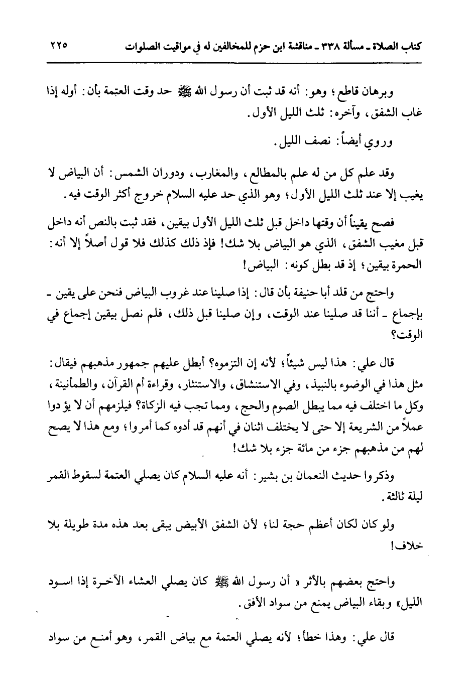 وَاحْتَجَّ مَنْ قَلَّدَ أَبَا حَنِيفَةَ بِأَنْ قَالَ: إذَا صَلَّيْنَا عِنْدَ غُرُوبِ الْبَيَاضِ فَنَحْنُ عَلَى يَقِينٍ - بِإِجْمَاعٍ - أَنَّنَا قَدْ صَلَّيْنَا عِنْدَ الْوَقْتِ، وَإِنْ صَلَّيْنَا قَبْلَ ذَلِكَ، فَلَمْ نُصَلِّ بِيَقِينِ إجْمَاعٍ فِي الْوَقْتِ؟ قَالَ عَلِيٌّ: هَذَا لَيْسَ شَيْئًا؛ لِأَنَّهُ إنْ الْتَزَمُوهُ؟ أَبْطَلَ عَلَيْهِمْ جُمْهُورَ مَذْهَبِهِمْ فَيُقَالُ: مِثْلُ هَذَا فِي الْوُضُوءِ بِالنَّبِيذِ، وَفِي الِاسْتِنْشَاقِ، وَالِاسْتِنْثَارِ، وَقِرَاءَةِ أُمِّ الْقُرْآنِ، وَالطُّمَأْنِينَةِ، وَكُلِّ مَا اُخْتُلِفَ فِيهِ مِمَّا يُبْطِلُ الصَّوْمَ وَالْحَجَّ، وَمِمَّا تَجِبُ فِيهِ الزَّكَاةُ؟ فَيَلْزَمُهُمْ أَنْ لَا يُؤَدُّوا عَمَلًا مِنْ الشَّرِيعَةِ إلَّا حَتَّى لَا يَخْتَلِفَ اثْنَانِ فِي أَنَّهُمْ قَدْ أَدُّوهُ كَمَا أُمِرُوا.