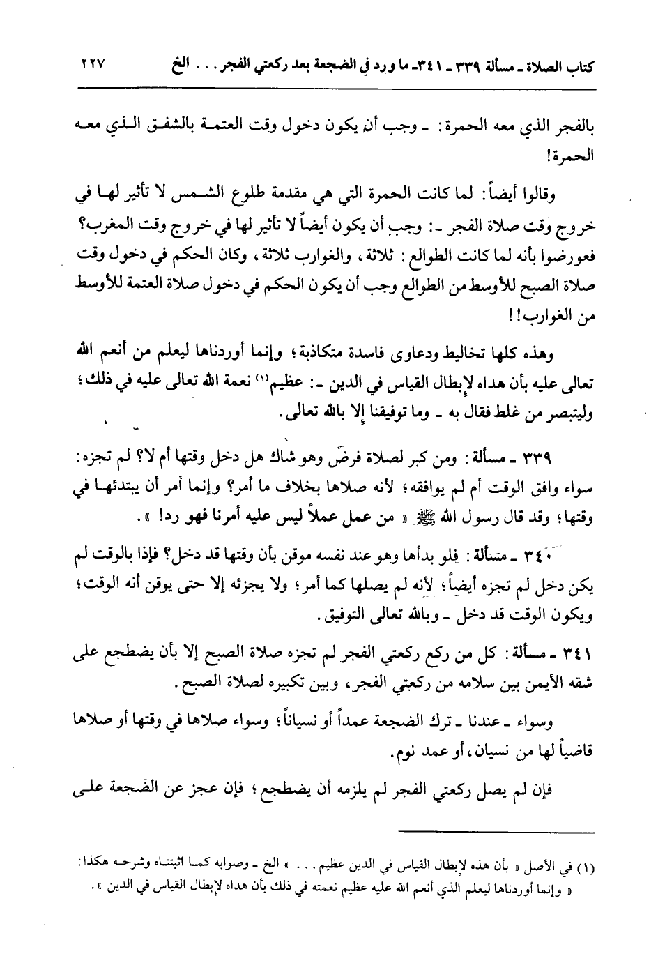 341 - مَسْأَلَةٌ: كُلُّ مَنْ رَكَعَ رَكْعَتَيْ الْفَجْرِ لَمْ تُجْزِهِ صَلَاةُ الصُّبْحِ إلَّا بِأَنْ يَضْطَجِعَ عَلَى شِقِّهِ الْأَيْمَنِ بَيْنَ سَلَامِهِ مِنْ رَكْعَتَيْ الْفَجْرِ، وَبَيْنَ تَكْبِيرِهِ لِصَلَاةِ الصُّبْحِ.