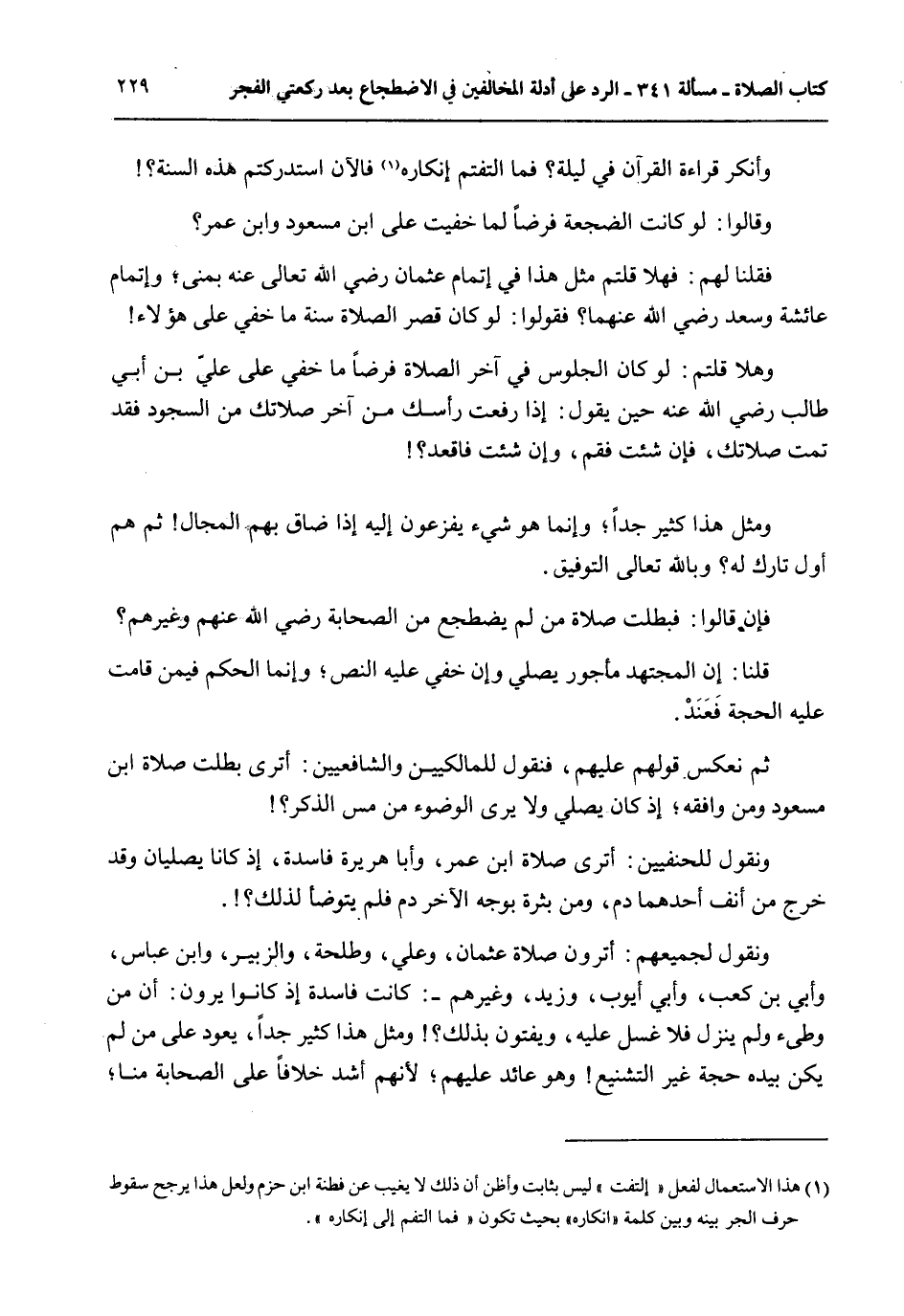 وَقَالُوا: لَوْ كَانَتْ الضَّجْعَةُ فَرْضًا لَمَا خَفِيَتْ عَلَى ابْنِ مَسْعُودٍ وَابْنِ عُمَرَ؟ فَقُلْنَا لَهُمْ: فَهَلَّا قُلْتُمْ مِثْلَ هَذَا فِي إتْمَامِ عُثْمَانَ - رَضِيَ اللَّهُ تَعَالَى عَنْهُ - بِمِنًى؛ وَإِتْمَامِ عَائِشَةَ وَسَعْدٍ - رَضِيَ اللَّهُ عَنْهُمَا -؟ فَقُولُوا: لَوْ كَانَ قَصْرُ الصَّلَاةِ سُنَّةً مَا خَفِيَ عَلَى هَؤُلَاءِ وَهَلَّا قُلْتُمْ: لَوْ كَانَ الْجُلُوسُ فِي آخِرِ الصَّلَاةِ فَرْضًا مَا خَفِيَ عَلَى عَلِيِّ بْنِ أَبِي طَالِبٍ - رَضِيَ اللَّهُ عَنْهُ - حِينَ يَقُولُ: إذَا رَفَعْت رَأْسَك مِنْ آخِرِ صَلَاتِك مِنْ السُّجُودِ فَقَدْ تَمَّتْ صَلَاتُك، فَإِنْ شِئْت فَقُمْ، وَإِنْ شِئْت فَاقْعُدْ؟ وَمِثْلُ هَذَا كَثِيرٌ جِدًّا؛ وَإِنَّمَا هُوَ شَيْءٌ يَفْزَعُونَ إلَيْهِ إذَا ضَاقَ بِهِمْ الْمَجَالُ ثُمَّ هُمْ أَوَّلُ تَارِكٍ لَهُ؟ ، وَبِاَللَّهِ تَعَالَى التَّوْفِيقُ.