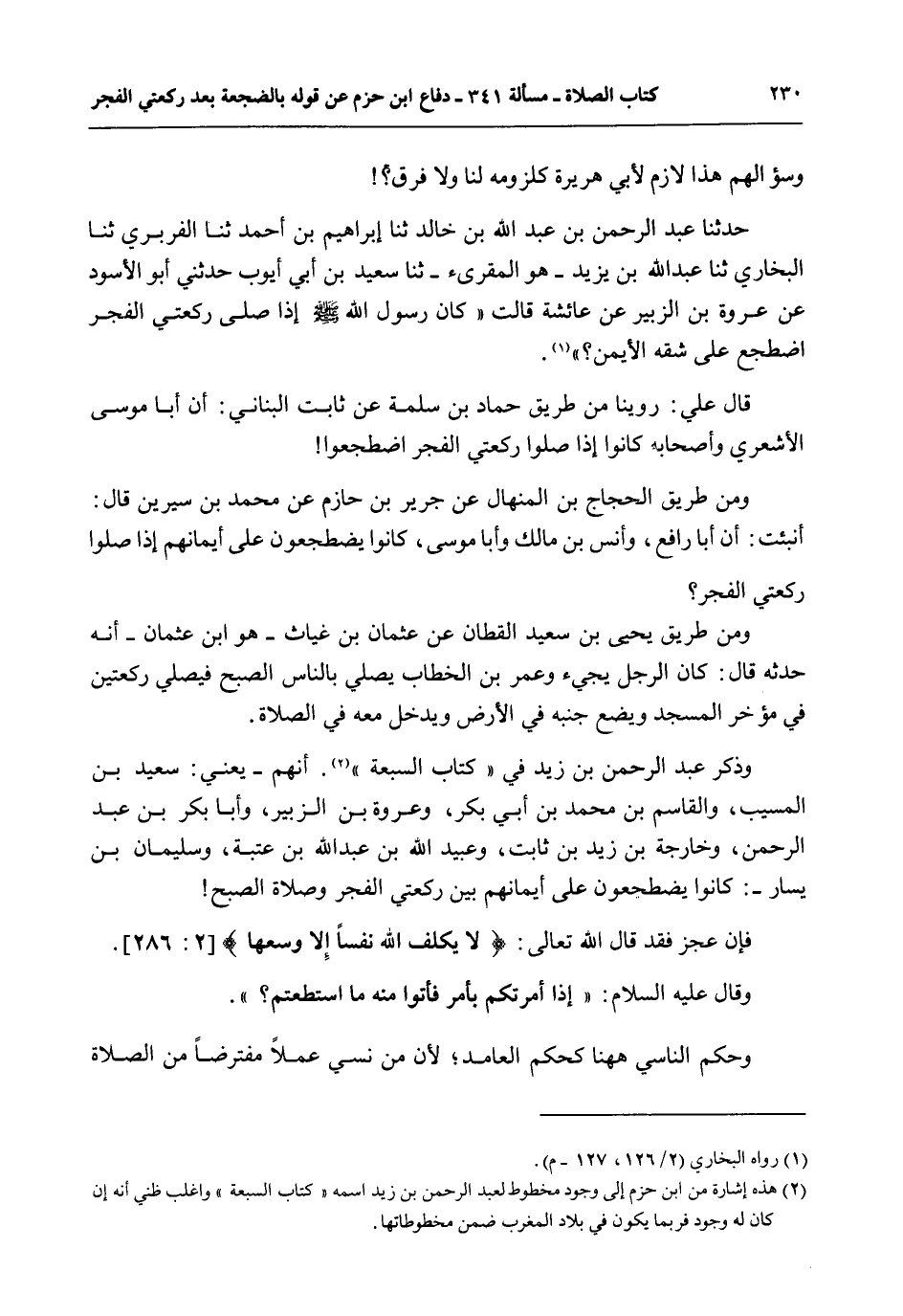 وَذَكَرَ عَبْدُ الرَّحْمَنِ بْنُ زَيْدٍ فِي " كِتَابِ السَّبْعَةِ " أَنَّهُمْ - يَعْنِي: سَعِيدَ بْنَ الْمُسَيِّبِ، وَالْقَاسِمَ بْنَ مُحَمَّدِ بْنِ أَبِي بَكْرٍ، وَعُرْوَةَ بْنِ الزُّبَيْرِ، وَأَبَا بَكْرِ بْنَ عَبْدِ الرَّحْمَنِ، وَخَارِجَةَ بْنَ زَيْدِ بْنِ ثَابِتٍ، وَعُبَيْدَ اللَّهِ بْنَ عَبْدِ اللَّهِ بْنِ عُتْبَةَ، وَسُلَيْمَانَ بْنَ يَسَارٍ -: كَانُوا يَضْطَجِعُونَ عَلَى أَيْمَانِهِمْ بَيْنَ رَكْعَتَيْ الْفَجْرِ وَصَلَاةِ الصُّبْحِ فَإِنْ عَجَزَ فَقَدْ قَالَ اللَّهُ تَعَالَى: {لا يُكَلِّفُ اللَّهُ نَفْسًا إِلا وُسْعَهَا} [البقرة: 286] ، وَقَالَ - عَلَيْهِ السَّلَامُ -: «إذَا أَمَرْتُكُمْ بِأَمْرٍ فَأْتُوا مِنْهُ مَا اسْتَطَعْتُمْ» ؟ .