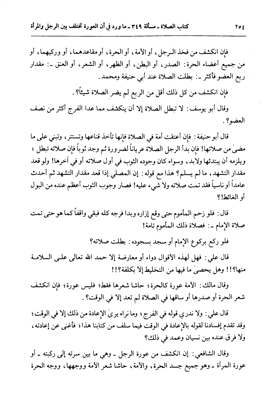 فَإِنْ انْكَشَفَ مِنْ فَخِذِ الرَّجُلِ، أَوْ الْأَمَةِ، أَوْ الْحُرَّةِ، أَوْ مَقَاعِدِهِمَا، أَوْ وَرِكَيْهِمَا، أَوْ مِنْ جَمِيعِ أَعْضَاءِ الْحُرَّةِ: الصَّدْرِ، أَوْ الْبَطْنِ، أَوْ الظَّهْرِ، أَوْ الشَّعْرِ، أَوْ الْعُنُقِ -: مِقْدَارُ رُبْعِ الْعُضْوِ فَأَكْثَرُ -: بَطَلَتْ الصَّلَاةُ عِنْدَ أَبِي حَنِيفَةَ وَمُحَمَّدٍ. فَإِنْ انْكَشَفَ مِنْ كُلِّ ذَلِكَ أَقَلُّ مِنْ الرُّبْعِ لَمْ يَضُرَّ الصَّلَاةَ شَيْئًا. وَقَالَ أَبُو يُوسُفَ: لَا تَبْطُلُ الصَّلَاةُ إلَّا أَنْ يَنْكَشِفَ مِمَّا عَدَا الْفَرْجِ أَكْثَرُ مِنْ نِصْفِ الْعُضْوِ، قَالَ أَبُو حَنِيفَةَ: فَإِنْ أُعْتِقَتْ أَمَةٌ فِي الصَّلَاةِ فَإِنَّهَا تَأْخُذُ قِنَاعَهَا وَتَسْتَتِرُ، وَتَبْنِي عَلَى مَا مَضَى مِنْ صَلَاتِهَا، فَإِنْ بَدَأَ الرَّجُلُ الصَّلَاةَ عُرْيَانًا لِضَرُورَةٍ ثُمَّ وَجَدَ ثَوْبًا فَإِنَّ صَلَاتَهُ تَبْطُلُ؛ وَيَلْزَمُهُ أَنْ يَبْتَدِئَهَا وَلَا بُدَّ، وَسَوَاءٌ كَانَ وُجُودُهُ الثَّوْبَ فِي أَوَّلِ صَلَاتِهِ أَوْ فِي آخِرِهَا، وَلَوْ قَعَدَ مِقْدَارَ التَّشَهُّدِ، مَا لَمْ يُسَلِّمْ هَذَا مَعَ قَوْلِهِ: إنَّ الْمُصَلِّيَ إذَا قَعَدَ مِقْدَارَ التَّشَهُّدِ ثُمَّ أَحْدَثَ عَامِدًا أَوْ نَاسِيًا فَقَدْ تَمَّتْ صَلَاتُهُ وَلَا شَيْءَ عَلَيْهِ، فَصَارَ وُجُوبُ الثَّوْبِ أَعْظَمَ عِنْدَهُ مِنْ الْبَوْلِ أَوْ الْغَائِطِ، قَالَ: فَلَوْ زَحَمَ الْمَأْمُومُ حَتَّى وَقَعَ إزَارُهُ وَبَدَا فَرْجُهُ كُلُّهُ فَبَقِيَ وَاقِفًا كَمَا هُوَ حَتَّى تَمَّتْ صَلَاةُ الْإِمَامِ -: فَصَلَاةُ ذَلِكَ الْمَأْمُومِ تَامَّةٌ، فَلَوْ رَكَعَ بِرُكُوعِ الْإِمَامِ أَوْ سَجَدَ بِسُجُودِهِ: بَطَلَتْ صَلَاتُهُ، قَالَ عَلِيٌّ: فَهَلْ لِهَذِهِ الْأَقْوَالِ دَوَاءٌ أَوْ مُعَارَضَةٌ إلَّا حَمْدُ اللَّهِ تَعَالَى عَلَى السَّلَامَةِ مِنْهَا؟ وَهَلْ يُحْصَى مَا فِيهَا مِنْ التَّخْلِيطِ إلَّا بِكُلْفَةٍ، وَقَالَ مَالِكٌ: الْأَمَةُ عَوْرَةٌ كَالْحُرَّةِ؛ حَاشَا شَعْرَهَا فَقَطْ؛ فَلَيْسَ عَوْرَةً؛ فَإِنْ انْكَشَفَ شَعْرُ الْحُرَّةِ أَوْ صَدْرُهَا أَوْ سَاقُهَا فِي الصَّلَاةِ لَمْ تُعِدْ إلَّا فِي الْوَقْتِ. قَالَ عَلِيٌّ: وَلَا نَدْرِي قَوْلَهُ فِي الْفَرْجِ؛ وَمَا نَرَاهُ يَرَى الْإِعَادَةَ مِنْ ذَلِكَ إلَّا فِي الْوَقْتِ؛ وَقَدْ تَقَدَّمَ إفْسَادُنَا لِقَوْلِهِ بِالْإِعَادَةِ فِي الْوَقْتِ فِيمَا سَلَفَ مِنْ كِتَابِنَا هَذَا؛ فَأَغْنَى عَنْ إعَادَتِهِ، وَلَا فَرْقَ عِنْدَهُ بَيْنَ نِسْيَانٍ وَعَمْدٍ فِي ذَلِكَ، وَقَالَ الشَّافِعِيُّ: إنْ انْكَشَفَ مِنْ عَوْرَةِ الرَّجُلِ - وَهِيَ مَا بَيْنَ سُرَّتِهِ إلَى رُكْبَتِهِ - أَوْ عَوْرَةِ الْمَرْأَةِ - وَهُوَ جَمِيعُ جَسَدِ الْحُرَّةِ، وَالْأَمَةِ، حَاشَا شَعْرَ الْأَمَةِ وَوَجْهَهَا، وَوَجْهَ الْحُرَّةِ