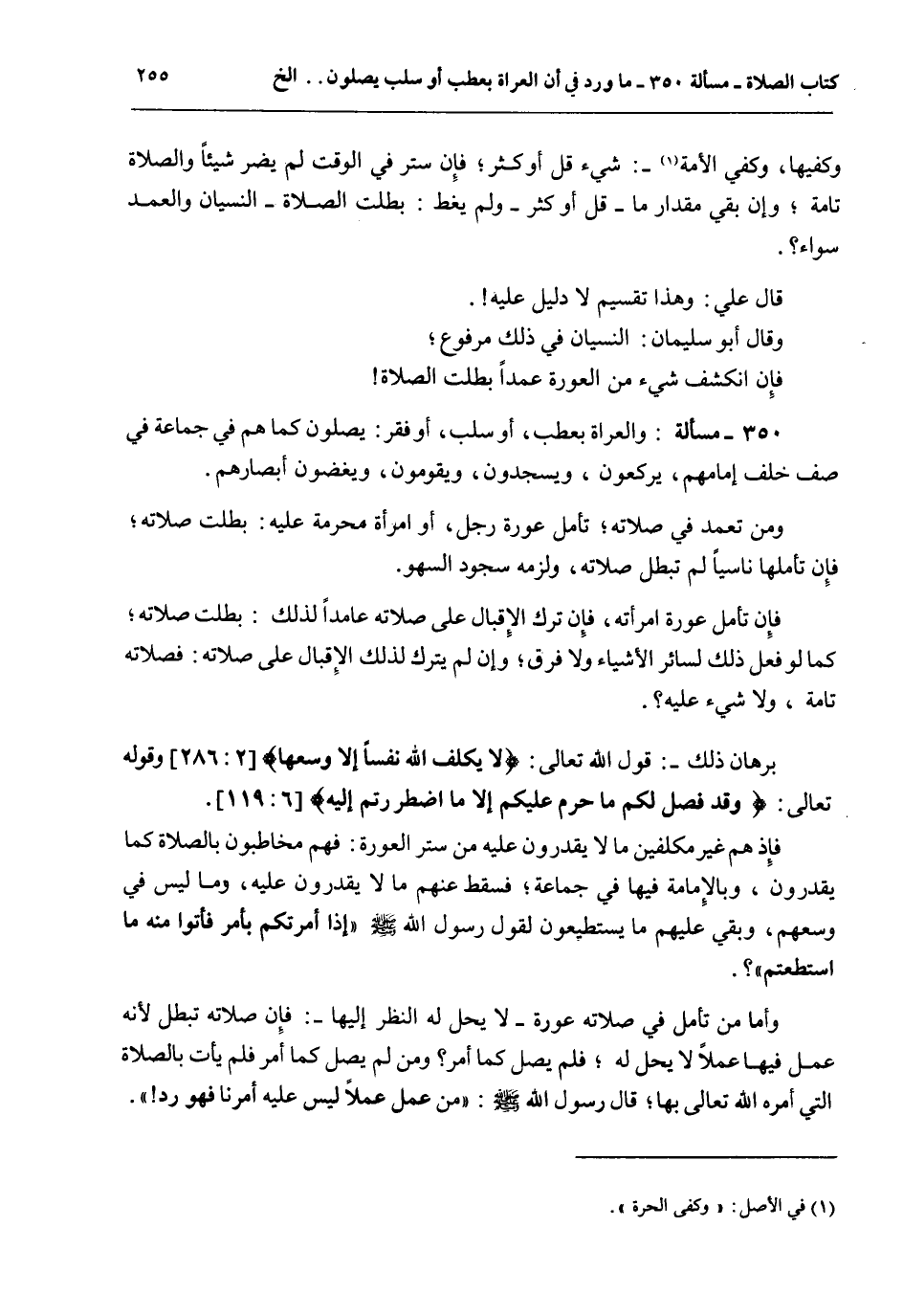 وَكَفَّيْهَا، وَكَفَّيْ الْأَمَةِ -: شَيْءٌ قَلَّ أَوْ كَثُرَ؛ فَإِنْ سُتِرَ فِي الْوَقْتِ لَمْ يَضُرَّ شَيْئًا وَالصَّلَاةُ تَامَّةٌ؛ وَإِنْ بَقِيَ مِقْدَارَ مَا - قَلَّ أَوْ كَثُرَ - وَلَمْ يُغَطِّ: بَطَلَتْ الصَّلَاةُ - النِّسْيَانُ وَالْعَمْدُ سَوَاءٌ. قَالَ عَلِيٌّ: وَهَذَا تَقْسِيمٌ لَا دَلِيلَ عَلَيْهِ. وَقَالَ أَبُو سُلَيْمَانَ: النِّسْيَانُ فِي ذَلِكَ مَرْفُوعٌ؛ فَإِنْ انْكَشَفَ شَيْءٌ مِنْ الْعَوْرَةِ عَمْدًا بَطَلَتْ الصَّلَاةُ.