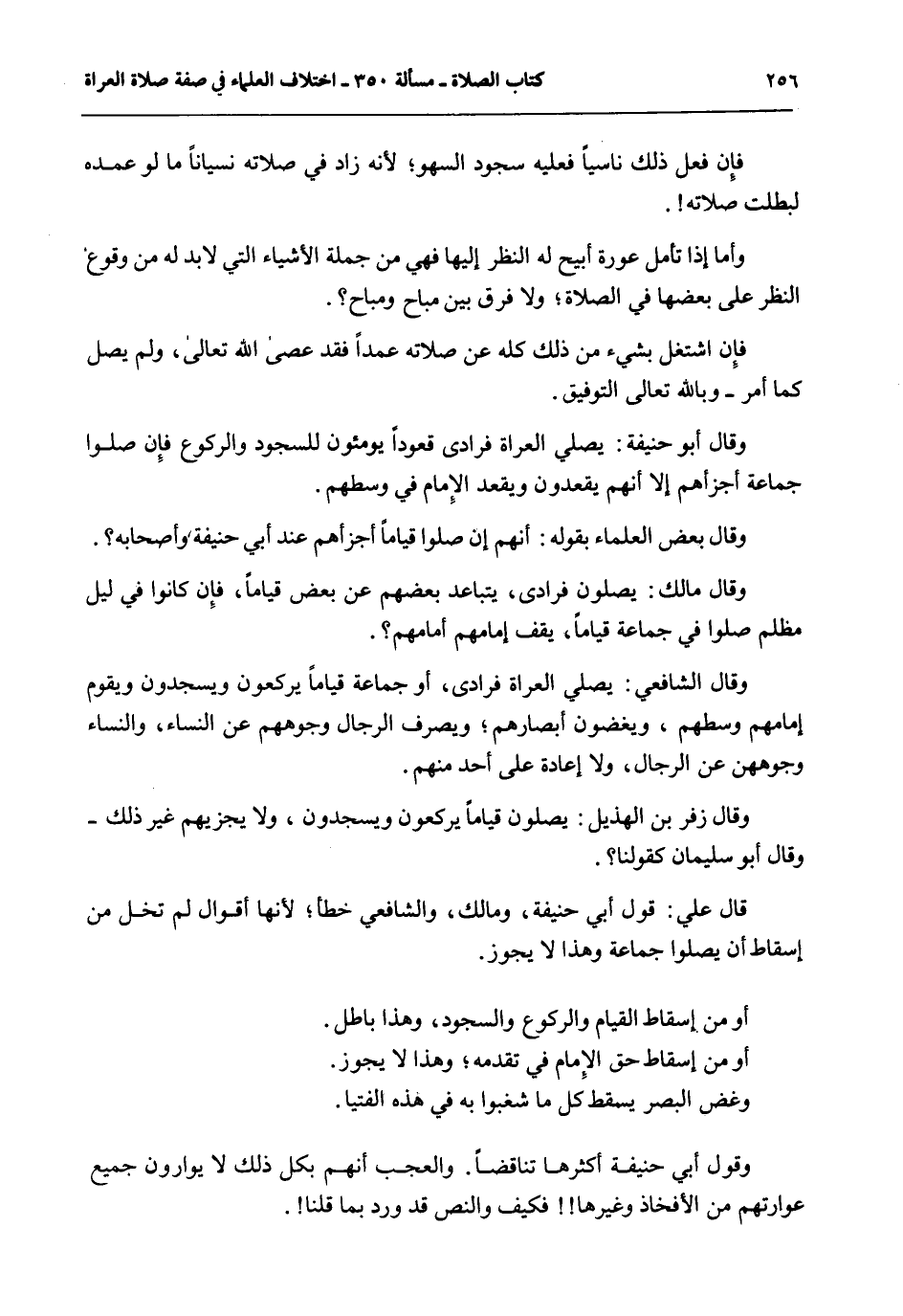 فَإِنْ فَعَلَ ذَلِكَ نَاسِيًا فَعَلَيْهِ سُجُودُ السَّهْوِ؛ لِأَنَّهُ زَادَ فِي صَلَاتِهِ نِسْيَانًا مَا لَوْ عَمَدَهُ لَبَطَلَتْ صَلَاتُهُ. وَأَمَّا إذَا تَأَمَّلَ عَوْرَةً أُبِيحَ لَهُ النَّظَرُ إلَيْهَا فَهِيَ مِنْ جُمْلَةِ الْأَشْيَاءِ الَّتِي لَا بُدَّ لَهُ مِنْ وُقُوعِ النَّظَرِ عَلَى بَعْضِهَا فِي الصَّلَاةِ؛ وَلَا فَرْقَ بَيْنَ مُبَاحٍ وَمُبَاحٍ. فَإِنْ اشْتَغَلَ بِشَيْءٍ مِنْ ذَلِكَ كُلِّهِ عَنْ صَلَاتِهِ عَمْدًا فَقَدْ عَصَى اللَّهَ تَعَالَى، وَلَمْ يُصَلِّ كَمَا أُمِرَ - وَبِاَللَّهِ تَعَالَى التَّوْفِيقُ. وَقَالَ أَبُو حَنِيفَةَ: يُصَلِّي الْعُرَاةُ فُرَادَى قُعُودًا يُومِئُونَ لِلسُّجُودِ وَالرُّكُوعِ فَإِنْ صَلَّوْا جَمَاعَةً أَجْزَأَهُمْ إلَّا أَنَّهُمْ يَقْعُدُونَ وَيَقْعُدُ الْإِمَامُ فِي وَسَطِهِمْ. وَقَالَ بَعْضُ الْعُلَمَاءِ بِقَوْلِهِ: أَنَّهُمْ إنْ صَلَّوْا قِيَامًا أَجْزَأَهُمْ عِنْدَ أَبِي حَنِيفَةَ وَأَصْحَابِهِ. وَقَالَ مَالِكٌ: يُصَلُّونَ فُرَادَى، يَتَبَاعَدُ بَعْضُهُمْ عَنْ بَعْضٍ قِيَامًا، فَإِنْ كَانُوا فِي لَيْلٍ مُظْلِمٍ صَلَّوْا فِي جَمَاعَةٍ قِيَامًا، يَقِفُ إمَامُهُمْ أَمَامَهُمْ. وَقَالَ الشَّافِعِيُّ: يُصَلِّي الْعُرَاةُ فُرَادَى، أَوْ جَمَاعَةً قِيَامًا يَرْكَعُونَ وَيَسْجُدُونَ وَيَقُومُ إمَامُهُمْ وَسَطَهُمْ، وَيَغُضُّونَ أَبْصَارَهُمْ؛ وَيَصْرِفُ الرِّجَالُ وُجُوهَهُمْ عَنْ النِّسَاءِ، وَالنِّسَاءُ وُجُوهَهُنَّ عَنْ الرِّجَالِ، وَلَا إعَادَةَ عَلَى أَحَدٍ مِنْهُمْ. وَقَالَ زُفَرُ بْنُ الْهُذَيْلِ: يُصَلُّونَ قِيَامًا يَرْكَعُونَ وَيَسْجُدُونَ، وَلَا يُجْزِيهِمْ غَيْرُ ذَلِكَ - وَقَالَ أَبُو سُلَيْمَانَ كَقَوْلِنَا. قَالَ عَلِيٌّ: قَوْلُ أَبِي حَنِيفَةَ، وَمَالِكٍ، وَالشَّافِعِيِّ خَطَأٌ؛ لِأَنَّهَا أَقْوَالٌ لَمْ تَخْلُ مِنْ إسْقَاطِ أَنْ يُصَلُّوا جَمَاعَةً وَهَذَا لَا يَجُوزُ. أَوْ مِنْ إسْقَاطِ الْقِيَامِ وَالرُّكُوعِ وَالسُّجُودِ، وَهَذَا بَاطِلٌ. أَوْ مِنْ إسْقَاطِ حَقِّ الْإِمَامِ فِي تَقَدُّمِهِ؛ وَهَذَا لَا يَجُوزُ. وَغَضُّ الْبَصَرِ يَسْقُطُ كُلُّ مَا شَغَبُوا بِهِ فِي هَذِهِ الْفُتْيَا. وَقَوْلُ أَبِي حَنِيفَةَ أَكْثَرُهَا تَنَاقُضًا. وَالْعَجَبُ أَنَّهُمْ بِكُلِّ ذَلِكَ لَا يُوَارُونَ جَمِيعَ عَوْرَاتِهِمْ مِنْ الْأَفْخَاذِ وَغَيْرِهَا، فَكَيْفَ وَالنَّصُّ قَدْ وَرَدَ بِمَا قُلْنَا.