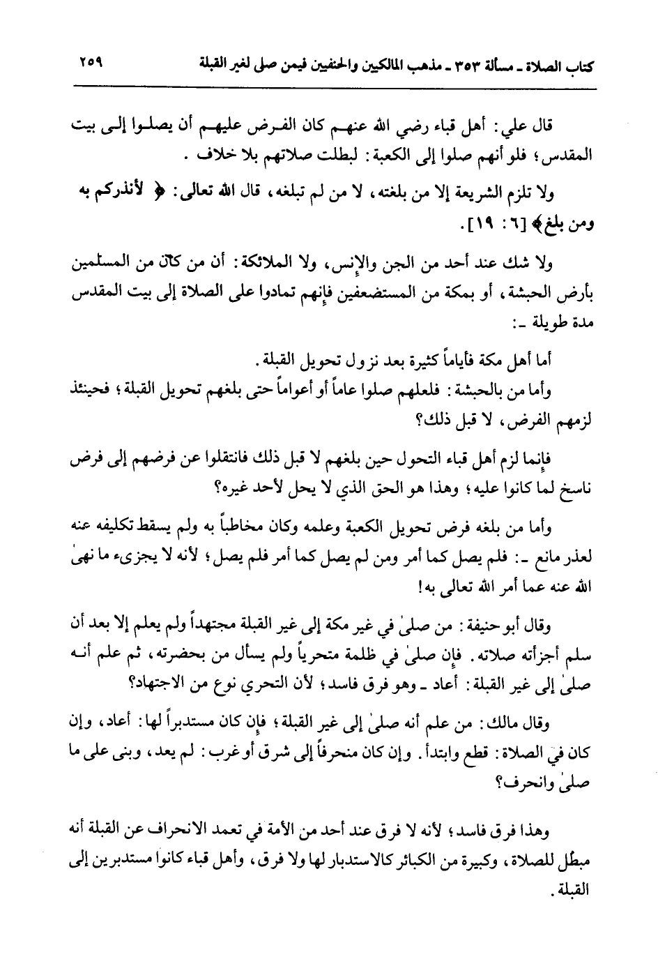 قَالَ عَلِيٌّ: أَهْلُ قُبَاءَ - رَضِيَ اللَّهُ عَنْهُمْ - كَانَ الْفَرْضُ عَلَيْهِمْ أَنْ يُصَلُّوا إلَى بَيْتِ الْمَقْدِسِ؛ فَلَوْ أَنَّهُمْ صَلَّوْا إلَى الْكَعْبَةِ: لَبَطَلَتْ صَلَاتُهُمْ بِلَا خِلَافٍ. وَلَا تَلْزَمُ الشَّرِيعَةُ إلَّا مَنْ بَلَغَتْهُ، لَا مَنْ لَمْ تَبْلُغْهُ، قَالَ اللَّهُ تَعَالَى: {لأُنْذِرَكُمْ بِهِ وَمَنْ بَلَغَ} [الأنعام: 19] . وَلَا شَكَّ عِنْدَ أَحَدٍ مِنْ الْجِنِّ وَالْإِنْسِ، وَلَا الْمَلَائِكَةِ: أَنَّ مَنْ كَانَ مِنْ الْمُسْلِمِينَ بِأَرْضِ الْحَبَشَةِ، أَوْ بِمَكَّةَ مِنْ الْمُسْتَضْعَفِينَ فَإِنَّهُمْ تَمَادَوْا عَلَى الصَّلَاةِ إلَى بَيْتِ الْمَقْدِسِ مُدَّةً طَوِيلَةً -: أَمَّا أَهْلُ مَكَّةَ فَأَيَّامًا كَثِيرَةً بَعْدَ نُزُولِ تَحْوِيلِ الْقِبْلَةِ. وَأَمَّا مَنْ بِالْحَبَشَةِ: فَلَعَلَّهُمْ صَلَّوْا عَامًا أَوْ أَعْوَامًا حَتَّى بَلَغَهُمْ تَحْوِيلُ الْقِبْلَةِ؛ فَحِينَئِذٍ لَزِمَهُمْ الْفَرْضُ، لَا قَبْلَ ذَلِكَ، فَإِنَّمَا لَزِمَ أَهْلَ قُبَاءَ التَّحَوُّلُ حِينَ بَلَغَهُمْ لَا قَبْلَ ذَلِكَ فَانْتَقَلُوا عَنْ فَرْضِهِمْ إلَى فَرْضٍ نَاسِخٍ لَمَا كَانُوا عَلَيْهِ؛ وَهَذَا هُوَ الْحَقُّ الَّذِي لَا يَحِلُّ لِأَحَدٍ غَيْرِهِ، وَأَمَّا مَنْ بَلَغَهُ فَرْضُ تَحْوِيلِ الْكَعْبَةِ وَعِلْمِهِ وَكَانَ مُخَاطَبًا بِهِ وَلَمْ يَسْقُطْ تَكْلِيفُهُ عَنْهُ لِعُذْرٍ مَانِعٍ -: فَلَمْ يُصَلِّ كَمَا أُمِرَ وَمَنْ لَمْ يُصَلِّ كَمَا أُمِرَ فَلَمْ يُصَلِّ؛ لِأَنَّهُ لَا يُجْزِئُ مَا نَهَى اللَّهُ عَنْهُ عَمَّا أَمَرَ اللَّهُ تَعَالَى بِهِ، وَقَالَ أَبُو حَنِيفَةَ: مَنْ صَلَّى فِي غَيْرِ مَكَّةَ إلَى غَيْرِ الْقِبْلَةِ مُجْتَهِدًا وَلَمْ يَعْلَمْ إلَّا بَعْدَ أَنْ سَلَّمَ أَجْزَأَتْهُ صَلَاتُهُ. فَإِنْ صَلَّى فِي ظُلْمَةٍ مُتَحَرِّيًا وَلَمْ يَسْأَلْ مَنْ بِحَضْرَتِهِ، ثُمَّ عَلِمَ أَنَّهُ صَلَّى إلَى غَيْرِ الْقِبْلَةِ: أَعَادَ - وَهُوَ فَرْقٌ فَاسِدٌ؛ لِأَنَّ التَّحَرِّيَ نَوْعٌ مِنْ الِاجْتِهَادِ، وَقَالَ مَالِكٌ: مَنْ عَلِمَ أَنَّهُ صَلَّى إلَى غَيْرِ الْقِبْلَةِ؛ فَإِنْ كَانَ مُسْتَدْبِرًا لَهَا: أَعَادَ، وَإِنْ كَانَ فِي الصَّلَاةِ: قَطَعَ وَابْتَدَأَ. وَإِنْ كَانَ مُنْحَرِفًا إلَى شَرْقٍ أَوْ غَرْبٍ: لَمْ يُعِدْ، وَبَنَى عَلَى مَا صَلَّى وَانْحَرَفَ وَهَذَا فَرْقٌ فَاسِدٌ؛ لِأَنَّهُ لَا فَرْقَ عِنْدَ أَحَدٍ مِنْ الْأُمَّةِ فِي تَعَمُّدِ الِانْحِرَافِ عَنْ الْقِبْلَةِ أَنَّهُ مُبْطِلٌ لِلصَّلَاةِ، وَكَبِيرَةٌ مِنْ الْكَبَائِرِ كَالِاسْتِدْبَارِ لَهَا وَلَا فَرْقَ، وَأَهْلُ قُبَاءَ كَانُوا مُسْتَدْبِرِينَ إلَى الْقِبْلَةِ.