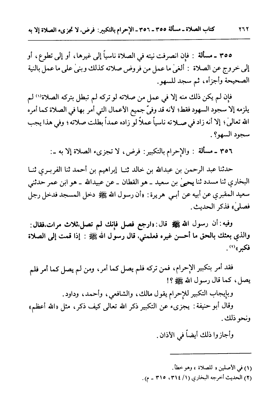356 - مَسْأَلَةٌ: وَالْإِحْرَامُ بِالتَّكْبِيرِ: فَرْضٌ، لَا تُجْزِئُ الصَّلَاةُ إلَّا بِهِ -: حَدَّثَنَا عَبْدُ الرَّحْمَنِ بْنُ عَبْدِ اللَّهِ بْنِ خَالِدٍ ثنا إبْرَاهِيمُ بْنُ أَحْمَدَ ثنا الْفَرَبْرِيُّ ثنا الْبُخَارِيُّ ثنا مُسَدَّدٌ ثنا يَحْيَى بْنُ سَعِيدٍ هُوَ الْقَطَّانُ - عَنْ عُبَيْدِ اللَّهِ هُوَ ابْنُ عُمَرَ حَدَّثَنِي سَعِيدٌ الْمَقْبُرِيُّ عَنْ أَبِيهِ عَنْ أَبِي هُرَيْرَةَ: «أَنَّ رَسُولَ اللَّهِ - صَلَّى اللَّهُ عَلَيْهِ وَسَلَّمَ - دَخَلَ الْمَسْجِدَ فَدَخَلَ رَجُلٌ فَصَلَّى فَذَكَرَ الْحَدِيثَ. وَفِيهِ: أَنَّ رَسُولَ اللَّهِ - صَلَّى اللَّهُ عَلَيْهِ وَسَلَّمَ - قَالَ: ارْجِعْ فَصَلِّ فَإِنَّكَ لَمْ تُصَلِّ، ثَلَاثَ مَرَّاتٍ، فَقَالَ: وَاَلَّذِي بَعَثَكَ بِالْحَقِّ مَا أُحْسِنُ غَيْرَهُ فَعَلِّمْنِي، قَالَ رَسُولُ اللَّهِ - صَلَّى اللَّهُ عَلَيْهِ وَسَلَّمَ -: إذَا قُمْتَ إلَى الصَّلَاةِ فَكَبِّرْ» . فَقَدْ أُمِرَ بِتَكْبِيرِ الْإِحْرَامِ، فَمَنْ تَرَكَهُ فَلَمْ يُصَلِّ كَمَا أُمِرَ، وَمَنْ لَمْ يُصَلِّ كَمَا أُمِرَ فَلَمْ يُصَلِّ، كَمَا قَالَ رَسُولُ اللَّهِ - صَلَّى اللَّهُ عَلَيْهِ وَسَلَّمَ - وَبِإِيجَابِ التَّكْبِيرِ لِلْإِحْرَامِ يَقُولُ مَالِكٌ، وَالشَّافِعِيُّ، وَأَحْمَدُ، وَدَاوُد. وَقَالَ أَبُو حَنِيفَةَ: يُجْزِئُ عَنْ التَّكْبِيرِ ذِكْرُ اللَّهِ تَعَالَى كَيْفَ ذَكَرَ، مِثْلُ " اللَّهُ أَعْظَمُ " وَنَحْوُ ذَلِكَ. وَأَجَازُوا ذَلِكَ أَيْضًا فِي الْأَذَانِ.