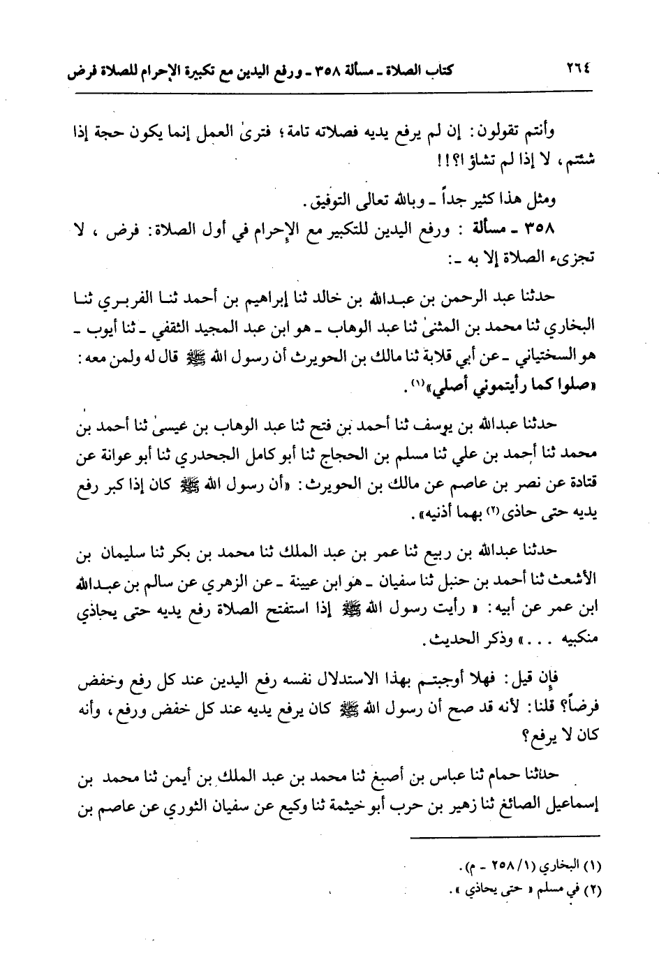 358 - مَسْأَلَةٌ: وَرَفْعُ الْيَدَيْنِ لِلتَّكْبِيرِ مَعَ الْإِحْرَامِ فِي أَوَّلِ الصَّلَاةِ: فَرْضٌ، لَا تُجْزِئُ الصَّلَاةُ إلَّا بِهِ -: حَدَّثَنَا عَبْدُ الرَّحْمَنِ بْنُ عَبْدِ اللَّهِ بْنِ خَالِدٍ ثنا إبْرَاهِيمُ بْنُ أَحْمَدَ ثنا الْفَرَبْرِيُّ ثنا الْبُخَارِيُّ ثنا مُحَمَّدُ بْنُ الْمُثَنَّى ثنا عَبْدُ الْوَهَّابِ هُوَ ابْنُ عَبْدِ الْمَجِيدِ الثَّقَفِيُّ - ثنا أَيُّوبُ هُوَ السِّخْتِيَانِيُّ - عَنْ أَبِي قِلَابَةَ ثنا مَالِكُ بْنُ الْحُوَيْرِثِ أَنَّ رَسُولَ اللَّهِ - صَلَّى اللَّهُ عَلَيْهِ وَسَلَّمَ - قَالَ لَهُ وَلِمَنْ مَعَهُ: «صَلُّوا كَمَا رَأَيْتُمُونِي أُصَلِّي» . حَدَّثَنَا عَبْدُ اللَّهِ بْنُ يُوسُفَ ثنا أَحْمَدُ بْنُ فَتْحٍ ثنا عَبْدُ الْوَهَّابِ بْنُ عِيسَى ثنا أَحْمَدُ بْنُ مُحَمَّدٍ ثنا أَحْمَدُ بْنُ عَلِيٍّ ثنا مُسْلِمُ بْنُ الْحَجَّاجِ ثنا أَبُو كَامِلٍ الْجَحْدَرِيُّ ثنا أَبُو عَوَانَةَ عَنْ قَتَادَةَ عَنْ نَصْرِ بْنِ عَاصِمٍ عَنْ مَالِكِ بْنِ الْحُوَيْرِثِ: «أَنَّ رَسُولَ اللَّهِ - صَلَّى اللَّهُ عَلَيْهِ وَسَلَّمَ - كَانَ إذَا كَبَّرَ رَفَعَ يَدَيْهِ حَتَّى حَاذَى بِهِمَا أُذُنَيْهِ» . حَدَّثَنَا عَبْدُ اللَّهِ بْنُ رَبِيعٍ ثنا عُمَرُ بْنُ عَبْدِ الْمَلِكِ ثنا مُحَمَّدُ بْنُ بَكْرٍ ثنا سُلَيْمَانُ بْنُ الْأَشْعَثِ ثنا أَحْمَدُ بْنُ حَنْبَلٍ ثنا سُفْيَانُ هُوَ ابْنُ عُيَيْنَةَ - عَنْ الزُّهْرِيِّ عَنْ سَالِمِ بْنِ عَبْدِ اللَّهِ بْنِ عُمَرَ عَنْ أَبِيهِ: «رَأَيْتُ رَسُولَ اللَّهِ - صَلَّى اللَّهُ عَلَيْهِ وَسَلَّمَ - إذَا اسْتَفْتَحَ الصَّلَاةَ رَفَعَ يَدَيْهِ حَتَّى يُحَاذِيَ مَنْكِبَيْهِ» . وَذَكَرَ الْحَدِيثَ. فَإِنْ قِيلَ: فَهَلَّا أَوْجَبْتُمْ بِهَذَا الِاسْتِدْلَالِ نَفْسِهِ رَفْعَ الْيَدَيْنِ عِنْدَ كُلِّ رَفْعٍ وَخَفْضٍ فَرْضًا؟ قُلْنَا: لِأَنَّهُ قَدْ صَحَّ أَنَّ رَسُولَ اللَّهِ - صَلَّى اللَّهُ عَلَيْهِ وَسَلَّمَ - كَانَ يَرْفَعُ يَدَيْهِ عِنْدَ كُلِّ خَفْضٍ وَرَفْعٍ، وَأَنَّهُ كَانَ لَا يَرْفَعُ. حَدَّثَنَا حُمَامٌ ثنا عَبَّاسُ بْنُ أَصْبَغَ ثنا مُحَمَّدُ بْنُ عَبْدِ الْمَلِكِ بْنَ أَيْمَنَ ثنا مُحَمَّدُ بْنُ إسْمَاعِيلَ الصَّائِغُ ثنا زُهَيْرُ بْنُ حَرْبٍ أَبُو خَيْثَمَةَ ثنا وَكِيعٌ عَنْ سُفْيَانَ الثَّوْرِيِّ عَنْ عَاصِمِ بْنِ كُلَيْبٍ