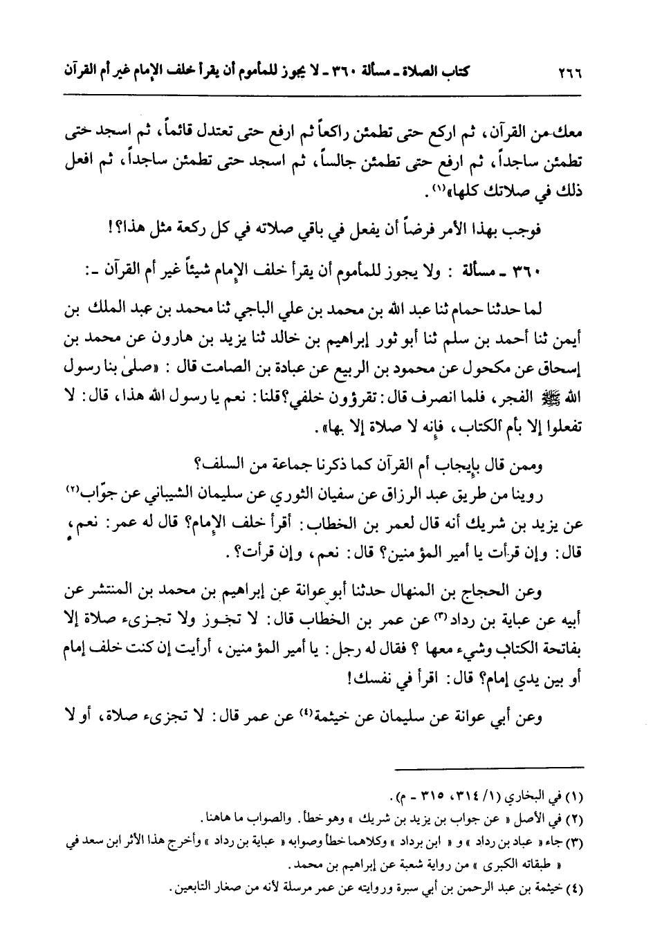 360 - مَسْأَلَةٌ: وَلَا يَجُوزُ لِلْمَأْمُومِ أَنْ يَقْرَأَ خَلْفَ الْإِمَامِ شَيْئًا غَيْرَ أُمِّ الْقُرْآنِ -: لِمَا حَدَّثَنَا حُمَامٌ ثنا عَبْدُ اللَّهِ بْنُ مُحَمَّدِ بْنِ عَلِيٍّ الْبَاجِيَّ ثنا مُحَمَّدُ بْنُ عَبْدِ الْمَلِكِ بْنِ أَيْمَنَ ثنا أَحْمَدُ بْنُ سَلْمٍ ثنا أَبُو ثَوْرِ إبْرَاهِيمُ بْنُ خَالِدٍ ثنا يَزِيدُ بْنُ هَارُونَ عَنْ مُحَمَّدِ بْنِ إِسْحَاقَ عَنْ مَكْحُولٍ عَنْ مَحْمُودِ بْنِ الرَّبِيعِ عَنْ عُبَادَةَ بْنِ الصَّامِتِ قَالَ: «صَلَّى بِنَا رَسُولُ اللَّهِ - صَلَّى اللَّهُ عَلَيْهِ وَسَلَّمَ - الْفَجْرَ، فَلَمَّا انْصَرَفَ قَالَ: تَقْرَءُونَ خَلْفِي قُلْنَا: نَعَمْ يَا رَسُولَ اللَّهِ هَذَا، قَالَ: لَا تَفْعَلُوا إلَّا بِأُمِّ الْكِتَابِ، فَإِنَّهُ لَا صَلَاةَ إلَّا بِهَا» . وَمِمَّنْ قَالَ بِإِيجَابِ أُمِّ الْقُرْآنِ كَمَا ذَكَرْنَا جَمَاعَةٌ مِنْ السَّلَفِ رُوِّينَا مِنْ طَرِيقِ عَبْدِ الرَّزَّاقِ عَنْ سُفْيَانَ الثَّوْرِيِّ عَنْ سُلَيْمَانَ الشَّيْبَانِيِّ عَنْ جَوَّابِ عَنْ يَزِيدَ بْنِ شَرِيكٍ أَنَّهُ قَالَ لِعُمَرَ بْنِ الْخَطَّابِ: أَقْرَأُ خَلْفَ الْإِمَامِ؟ قَالَ لَهُ عُمَرُ: نَعَمْ، قَالَ: وَإِنْ قَرَأْت يَا أَمِيرَ الْمُؤْمِنِينَ قَالَ: نَعَمْ، وَإِنْ قَرَأْت. وَعَنْ الْحَجَّاجِ بْنِ الْمِنْهَالِ حَدَّثَنَا أَبُو عَوَانَةَ عَنْ إبْرَاهِيمَ بْنِ مُحَمَّدِ بْنِ الْمُنْتَشِرِ عَنْ أَبِيهِ عَنْ عَبَايَةَ بْنِ رَدَّادٍ عَنْ عُمَرَ بْنِ الْخَطَّابِ قَالَ: لَا تَجُوزُ وَلَا تُجْزِئُ صَلَاةٌ إلَّا بِفَاتِحَةِ الْكِتَابِ وَشَيْءٍ مَعَهَا فَقَالَ لَهُ رَجُلٌ: يَا أَمِيرَ الْمُؤْمِنِينَ، أَرَأَيْت إنْ كُنْت خَلْفَ إمَامٍ أَوْ بَيْنَ يَدَيْ إمَامٍ قَالَ: اقْرَأْ فِي نَفْسِك وَعَنْ أَبِي عَوَانَةَ عَنْ سُلَيْمَانَ عَنْ خَيْثَمَةَ عَنْ عُمَرَ قَالَ: لَا تُجْزِئُ صَلَاةٌ، أَوْ لَا