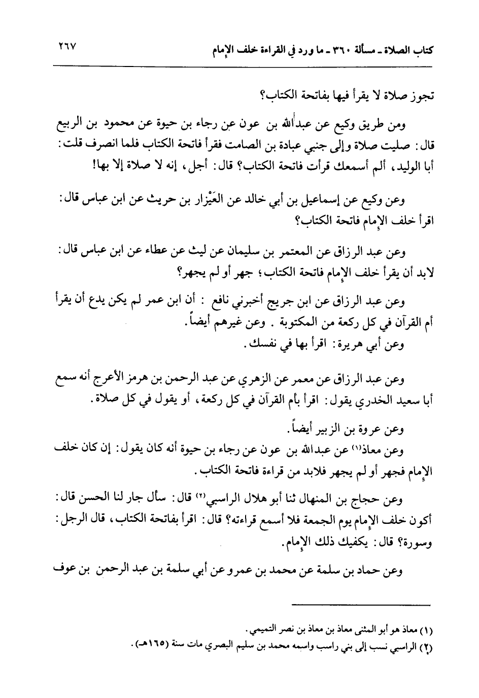 تَجُوزُ صَلَاةٌ لَا يُقْرَأُ فِيهَا بِفَاتِحَةِ الْكِتَابِ وَمِنْ طَرِيقِ وَكِيعٍ عَنْ عَبْدِ اللَّهِ بْنِ عَوْنٍ عَنْ رَجَاءِ بْنِ حَيْوَةُ عَنْ مَحْمُودِ بْنِ الرَّبِيعِ قَالَ: صَلَّيْت صَلَاةً وَإِلَى جَنْبِي عُبَادَةُ بْنُ الصَّامِتِ فَقَرَأَ فَاتِحَةَ الْكِتَابِ فَلَمَّا انْصَرَفَ قُلْت: أَبَا الْوَلِيدِ، أَلَمْ أَسْمَعْك قَرَأْت فَاتِحَةَ الْكِتَابِ قَالَ: أَجَلْ، إنَّهُ لَا صَلَاةَ إلَّا بِهَا وَعَنْ وَكِيعٍ عَنْ إسْمَاعِيلَ بْنِ أَبِي خَالِدٍ عَنْ الْعَيْزَارِ بْنِ حُرَيْثٍ عَنْ ابْنِ عَبَّاسٍ قَالَ: اقْرَأْ خَلْفَ الْإِمَامِ فَاتِحَةَ الْكِتَابِ وَعَنْ عَبْدِ الرَّزَّاقِ عَنْ الْمُعْتَمِرِ بْنِ سُلَيْمَانَ عَنْ لَيْثٍ عَنْ عَطَاءٍ عَنْ ابْنِ عَبَّاسٍ قَالَ: لَا بُدَّ أَنْ يَقْرَأَ خَلْفَ الْإِمَامِ فَاتِحَةَ الْكِتَابِ؛ جَهَرَ أَوْ لَمْ يَجْهَرْ وَعَنْ عَبْدِ الرَّزَّاقِ عَنْ ابْنِ جُرَيْجٍ أَخْبَرَنِي نَافِعٌ: أَنَّ ابْنَ عُمَرَ لَمْ يَكُنْ يَدَعُ أَنْ يَقْرَأَ أُمَّ الْقُرْآنِ فِي كُلِّ رَكْعَةٍ مِنْ الْمَكْتُوبَةِ. وَعَنْ غَيْرِهِمْ أَيْضًا. وَعَنْ أَبِي هُرَيْرَةَ: اقْرَأْ بِهَا فِي نَفْسِك. وَعَنْ عَبْدِ الرَّزَّاقِ عَنْ مَعْمَرٍ عَنْ الزُّهْرِيِّ عَنْ عَبْدِ الرَّحْمَنِ بْنِ هُرْمُزٍ الْأَعْرَجِ أَنَّهُ سَمِعَ أَبَا سَعِيدٍ الْخُدْرِيِّ يَقُولُ: اقْرَأْ بِأُمِّ الْقُرْآنِ فِي كُلِّ رَكْعَةٍ، أَوْ يَقُولُ فِي كُلِّ صَلَاةٍ. وَعَنْ عُرْوَةَ بْنِ الزُّبَيْرِ أَيْضًا. وَعَنْ مُعَاذٍ عَنْ عَبْدِ اللَّهِ بْنِ عَوْنٍ عَنْ رَجَاءِ بْنِ حَيْوَةُ أَنَّهُ كَانَ يَقُولُ: إنْ كَانَ خَلْفَ الْإِمَامِ فَجَهَرَ أَوْ لَمْ يَجْهَرْ فَلَا بُدَّ مِنْ قِرَاءَةِ فَاتِحَةِ الْكِتَابِ. وَعَنْ حَجَّاجِ بْنِ الْمِنْهَالِ ثنا أَبُو هِلَالٍ الرَّاسِبِيُّ قَالَ: سَأَلَ جَارٌ لَنَا الْحَسَنَ قَالَ: أَكُونُ خَلْفَ الْإِمَامِ يَوْمَ الْجُمُعَةِ فَلَا أَسْمَعُ قِرَاءَتَهُ قَالَ: اقْرَأْ بِفَاتِحَةِ الْكِتَابِ، قَالَ الرَّجُلُ: وَسُورَةٍ قَالَ: يَكْفِيك ذَلِكَ الْإِمَامُ. وَعَنْ حَمَّادِ بْنِ سَلَمَةَ عَنْ مُحَمَّدِ بْنِ عَمْرٍو عَنْ أَبِي سَلَمَةَ بْنِ عَبْدِ الرَّحْمَنِ بْنِ عَوْفٍ