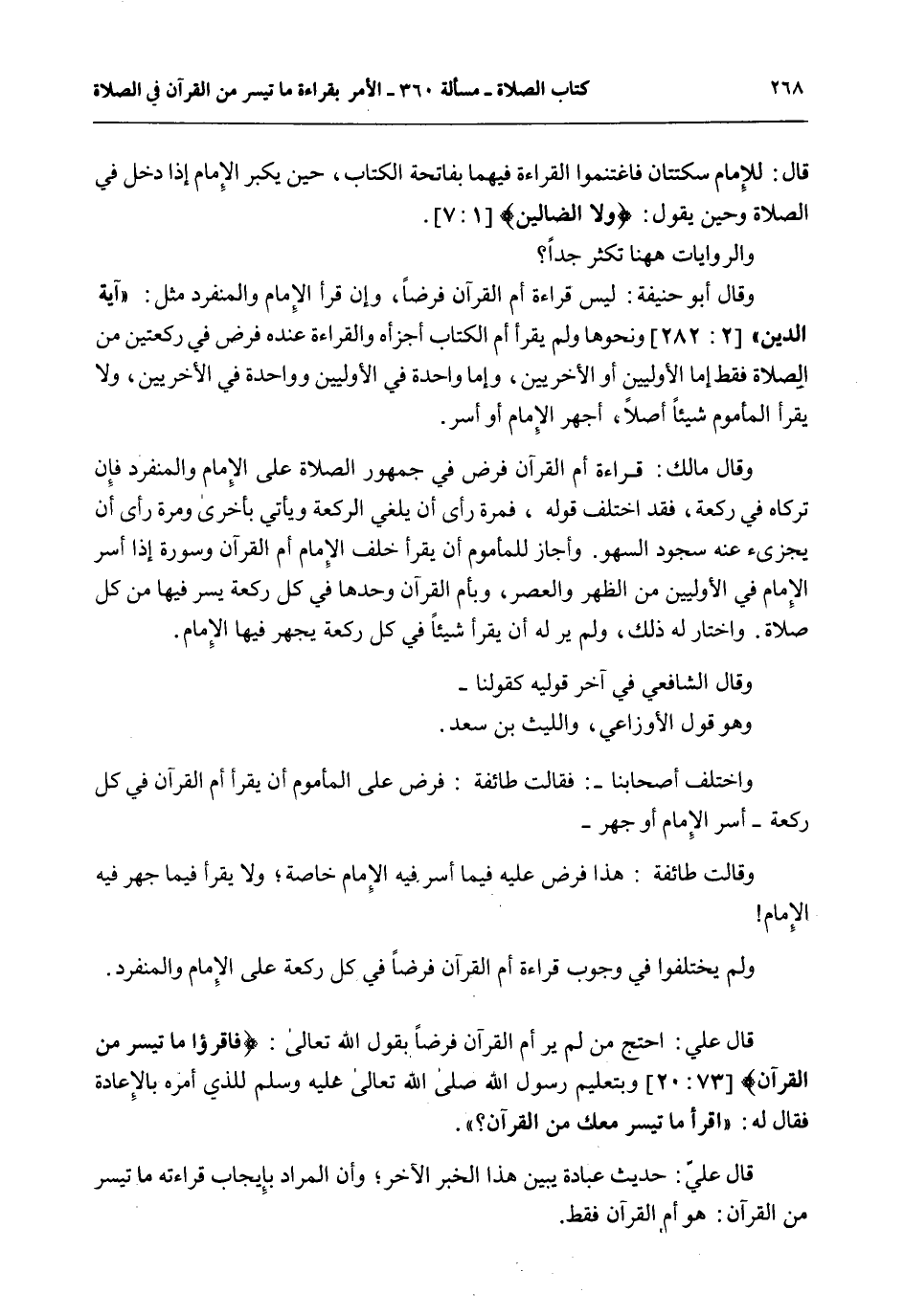 قَالَ: لِلْإِمَامِ سَكْتَتَانِ فَاغْتَنَمُوا الْقِرَاءَةَ فِيهِمَا بِفَاتِحَةِ الْكِتَابِ، حِينَ يُكَبِّرُ الْإِمَامُ إذَا دَخَلَ فِي الصَّلَاةِ وَحِينَ يَقُولُ: {وَلا الضَّالِّينَ} [الفاتحة: 7] . وَالرِّوَايَاتُ هَهُنَا تَكْثُرُ جِدًّا وَقَالَ أَبُو حَنِيفَةَ: لَيْسَ قِرَاءَةُ أُمِّ الْقُرْآنِ فَرْضًا، وَإِنْ قَرَأَ الْإِمَامُ وَالْمُنْفَرِدُ مِثْلَ: " آيَةِ الدَّيْنِ " وَنَحْوِهَا وَلَمْ يَقْرَأْ أُمَّ الْكِتَابِ أَجْزَأَهُ وَالْقِرَاءَةُ عِنْدَهُ فَرْضٌ فِي رَكْعَتَيْنِ مِنْ الصَّلَاةِ فَقَطْ إمَّا الْأُولَيَيْنِ أَوْ الْأُخْرَيَيْنِ، وَإِمَّا وَاحِدَةٌ فِي الْأُولَيَيْنِ وَوَاحِدَةٌ فِي الْأُخْرَيَيْنِ، وَلَا يَقْرَأُ الْمَأْمُومُ شَيْئًا أَصْلًا، أَجْهَرَ الْإِمَامُ أَوْ أَسَرَّ. وَقَالَ مَالِكٌ: قِرَاءَةُ أُمِّ الْقُرْآنِ فَرْضٌ فِي جُمْهُورِ الصَّلَاةِ عَلَى الْإِمَامِ وَالْمُنْفَرِدِ فَإِنْ تَرَكَاهُ فِي رَكْعَةٍ، فَقَدْ اخْتَلَفَ قَوْلُهُ، فَمَرَّةً رَأَى أَنْ يُلْغِيَ الرَّكْعَةَ وَيَأْتِيَ بِأُخْرَى وَمَرَّةً رَأَى أَنْ يُجْزِئَ عَنْهُ سُجُودُ السَّهْوِ. وَأَجَازَ لِلْمَأْمُومِ أَنْ يَقْرَأَ خَلْفَ الْإِمَامِ أُمَّ الْقُرْآنِ وَسُورَةً إذَا أَسَرَّ الْإِمَامُ فِي الْأُولَيَيْنِ مِنْ الظُّهْرِ وَالْعَصْرِ، وَبِأُمِّ الْقُرْآنِ وَحْدَهَا فِي كُلِّ رَكْعَةٍ يُسِرُّ فِيهَا مِنْ كُلِّ صَلَاةٍ. وَاخْتَارَ لَهُ ذَلِكَ، وَلَمْ يَرَ لَهُ أَنْ يَقْرَأَ شَيْئًا فِي كُلِّ رَكْعَةٍ يَجْهَرُ فِيهَا الْإِمَامُ. وَقَالَ الشَّافِعِيُّ فِي آخِرِ قَوْلَيْهِ كَقَوْلِنَا - وَهُوَ قَوْلُ الْأَوْزَاعِيِّ، وَاللَّيْثِ بْنِ سَعْدٍ. وَاخْتَلَفَ أَصْحَابُنَا -: فَقَالَتْ طَائِفَةٌ: فَرْضٌ عَلَى الْمَأْمُومِ أَنْ يَقْرَأَ أُمَّ الْقُرْآنِ فِي كُلِّ رَكْعَةٍ - أَسَرَّ الْإِمَامُ أَوْ جَهَرَ - وَقَالَتْ طَائِفَةٌ: هَذَا فَرْضٌ عَلَيْهِ فِيمَا أَسَرَّ فِيهِ الْإِمَامُ خَاصَّةً؛ وَلَا يَقْرَأُ فِيمَا جَهَرَ فِيهِ الْإِمَامُ وَلَمْ يَخْتَلِفُوا فِي وُجُوبِ قِرَاءَةِ أُمِّ الْقُرْآنِ فَرْضًا فِي كُلِّ رَكْعَةٍ عَلَى الْإِمَامِ وَالْمُنْفَرِدِ. قَالَ عَلِيٌّ: احْتَجَّ مَنْ لَمْ يَرَ أُمَّ الْقُرْآنِ فَرْضًا بِقَوْلِ اللَّهِ تَعَالَى: {فَاقْرَءُوا مَا تَيَسَّرَ مِنَ الْقُرْآنِ} [المزمل: 20] وَبِتَعْلِيمِ رَسُولِ اللَّهِ - صَلَّى اللَّهُ تَعَالَى عَلَيْهِ وَسَلَّمَ - لِلَّذِي أَمَرَهُ بِالْإِعَادَةِ فَقَالَ لَهُ: «اقْرَأْ مَا تَيَسَّرَ مَعَكَ مِنْ الْقُرْآنِ» . قَالَ عَلِيٌّ: حَدِيثُ عُبَادَةَ يُبَيِّنُ هَذَا الْخَبَرَ الْآخَرَ؛ وَأَنَّ الْمُرَادَ بِإِيجَابِ قِرَاءَتِهِ مَا تَيَسَّرَ مِنْ الْقُرْآنِ: هُوَ أُمُّ الْقُرْآنِ فَقَطْ.