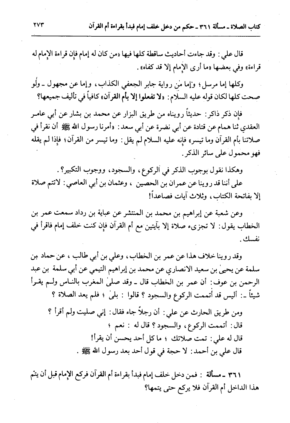 قَالَ عَلِيٌّ: وَقَدْ جَاءَتْ أَحَادِيثُ سَاقِطَةٌ كُلُّهَا فِيهَا «مَنْ كَانَ لَهُ إمَامٌ فَإِنَّ قِرَاءَةَ الْإِمَامُ لَهُ قِرَاءَةٌ» وَفِي بَعْضِهَا " مَا أَرَى الْإِمَامُ إلَّا قَدْ كَفَّاهُ ". وَكُلُّهَا إمَّا مُرْسَلٌ؛ وَإِمَّا مِنْ رِوَايَةِ جَابِرٍ الْجُعْفِيِّ الْكَذَّابِ، وَإِمَّا عَنْ مَجْهُولٍ - وَلَوْ صَحَّتْ كُلُّهَا لَكَانَ قَوْلُهُ - عَلَيْهِ السَّلَامُ -: «لَا تَفْعَلُوا إلَّا بِأُمِّ الْقُرْآنِ» كَافِيًا فِي تَأْلِيفِ جَمِيعِهَا، فَإِنْ ذَكَرَ ذَاكِرٌ: حَدِيثًا رُوِّينَاهُ مِنْ طَرِيقِ الْبَزَّارِ عَنْ مُحَمَّدِ بْنِ بَشَّارٍ عَنْ أَبِي عَامِرٍ الْعَقَدِيِّ ثنا هَمَّامٌ عَنْ قَتَادَةَ عَنْ أَبِي نَضْرَةَ عَنْ أَبِي سَعْدٍ: «أَمَرَنَا رَسُولُ اللَّهِ - صَلَّى اللَّهُ عَلَيْهِ وَسَلَّمَ - أَنْ نَقْرَأَ فِي صَلَاتِنَا بِأُمِّ الْقُرْآنِ وَمَا تَيَسَّرَ» فَإِنَّهُ - عَلَيْهِ السَّلَامُ - لَمْ يَقُلْ: وَمَا تَيَسَّرَ مِنْ الْقُرْآنِ؛ فَإِذَا لَمْ يَقُلْهُ فَهُوَ مَحْمُولٌ عَلَى سَائِرِ الذِّكْرِ. وَهَكَذَا نَقُولُ بِوُجُوبِ الذِّكْرِ فِي الرُّكُوعِ، وَالسُّجُودِ، وَوُجُوبِ التَّكْبِيرِ. عَلَى أَنَّنَا قَدْ رُوِّينَا عَنْ عِمْرَانَ بْنِ الْحُصَيْنِ، وَعُثْمَانَ بْنِ أَبِي الْعَاصِ: لَا تَتِمُّ صَلَاةٌ إلَّا بِفَاتِحَةِ الْكِتَابِ، وَثَلَاثِ آيَاتٍ فَصَاعِدًا، وَعَنْ شُعْبَةَ عَنْ إبْرَاهِيمَ بْنِ مُحَمَّدِ بْنِ الْمُنْتَشِرِ عَنْ عَبَايَةَ بْنِ رَدَّادٍ سَمِعْت عُمَرَ بْنَ الْخَطَّابِ يَقُولُ: لَا تُجْزِئُ صَلَاةٌ إلَّا بِآيَتَيْنِ مَعَ أُمِّ الْقُرْآنِ فَإِنْ كُنْت خَلْفَ إمَامٍ فَاقْرَأْ فِي نَفْسِك. وَقَدْ رُوِّينَا خِلَافَ هَذَا عَنْ عُمَرَ بْنِ الْخَطَّابِ، وَعَلِيِّ بْنِ أَبِي طَالِبٍ، عَنْ حَمَّادِ بْنِ سَلَمَةَ عَنْ يَحْيَى بْنِ سَعِيدٍ الْأَنْصَارِيِّ عَنْ مُحَمَّدِ بْنِ إبْرَاهِيمَ التَّيْمِيِّ عَنْ أَبِي سَلَمَةَ بْنِ عَبْدِ الرَّحْمَنِ بْنِ عَوْفٍ: أَنَّ عُمَرَ بْنَ الْخَطَّابِ قَالَ - وَقَدْ صَلَّى الْمَغْرِبَ بِالنَّاسِ وَلَمْ يَقْرَأْ شَيْئًا -: أَلَيْسَ قَدْ أَتْمَمْت الرُّكُوعَ وَالسُّجُودَ.؟ قَالُوا: بَلَى؛ فَلَمْ يُعِدْ الصَّلَاةَ وَمِنْ طَرِيقِ الْحَارِثِ عَنْ عَلِيٍّ: أَنَّ رَجُلًا جَاءَ فَقَالَ: إنِّي صَلَّيْت وَلَمْ أَقْرَأْ، قَالَ: أَتْمَمْت الرُّكُوعَ وَالسُّجُودَ؟ قَالَ لَهُ: نَعَمْ؛ قَالَ لَهُ عَلِيٌّ: تَمَّتْ صَلَاتُك؛ مَا كُلُّ أَحَدٍ يُحْسِنُ أَنْ يَقْرَأَ، قَالَ عَلِيُّ بْنُ أَحْمَدَ: لَا حُجَّةَ فِي قَوْلِ أَحَدٍ بَعْدَ رَسُولِ اللَّهِ - صَلَّى اللَّهُ عَلَيْهِ وَسَلَّمَ -.