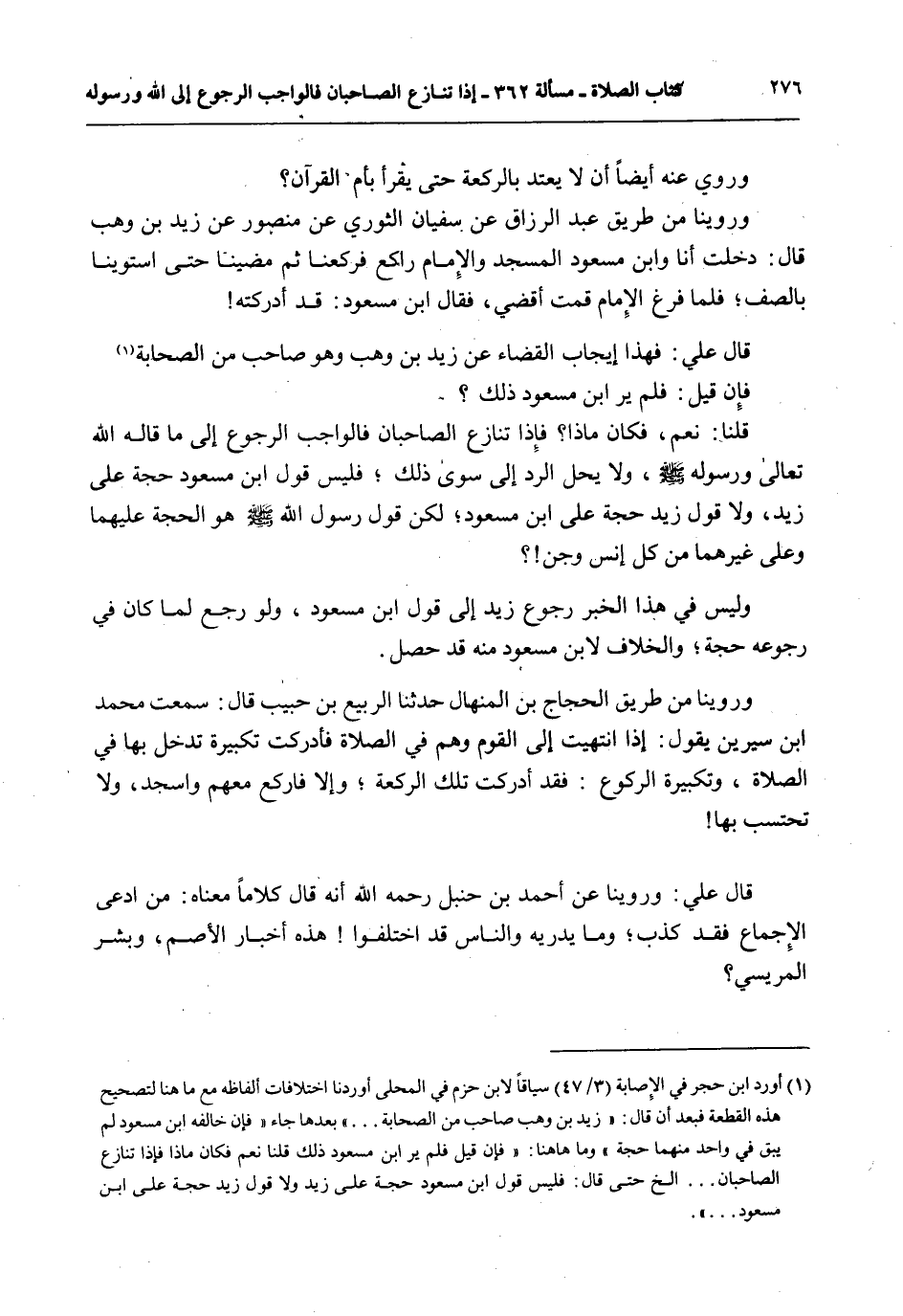 وَرُوِيَ عَنْهُ أَيْضًا أَنْ لَا يُعْتَدَّ بِالرَّكْعَةِ حَتَّى يَقْرَأَ بِأُمِّ الْقُرْآنِ وَرُوِّينَا مِنْ طَرِيقِ عَبْدِ الرَّزَّاقِ عَنْ سُفْيَانَ الثَّوْرِيِّ عَنْ مَنْصُورٍ عَنْ زَيْدِ بْنِ وَهْبٍ قَالَ: دَخَلْت أَنَا وَابْنُ مَسْعُودٍ الْمَسْجِدَ وَالْإِمَامُ رَاكِعٌ فَرَكَعْنَا ثُمَّ مَضَيْنَا حَتَّى اسْتَوَيْنَا بِالصَّفِّ؛ فَلَمَّا فَرَغَ الْإِمَامُ قُمْت أَقْضِي، فَقَالَ ابْنُ مَسْعُودٍ: قَدْ أَدْرَكْتَهُ. قَالَ عَلِيٌّ: فَهَذَا إيجَابُ الْقَضَاءِ عَنْ زَيْدِ بْنِ وَهْبٍ وَهُوَ صَاحِبٌ مِنْ الصَّحَابَةِ فَإِنْ قِيلَ: فَلَمْ يَرَ ابْنَ مَسْعُودٍ ذَلِكَ قُلْنَا: نَعَمْ، فَكَانَ مَاذَا فَإِذَا تَنَازَعَ الصَّاحِبَانِ فَالْوَاجِبُ الرُّجُوعُ إلَى مَا قَالَهُ اللَّهُ تَعَالَى وَرَسُولُهُ - صَلَّى اللَّهُ عَلَيْهِ وَسَلَّمَ -، وَلَا يَحِلُّ الرَّدُّ إلَى سِوَى ذَلِكَ؛ فَلَيْسَ قَوْلُ ابْنِ مَسْعُودٍ حُجَّةً عَلَى زَيْدٍ، وَلَا قَوْلُ زَيْدٍ حُجَّةً عَلَى ابْنِ مَسْعُودٍ؛ لَكِنَّ قَوْلَ رَسُولِ اللَّهِ - صَلَّى اللَّهُ عَلَيْهِ وَسَلَّمَ - هُوَ الْحُجَّةُ عَلَيْهِمَا وَعَلَى غَيْرِهِمَا مِنْ كُلِّ إنْسٍ وَجِنٍّ، وَلَيْسَ فِي هَذَا الْخَبَرِ رُجُوعُ زَيْدٍ إلَى قَوْلِ ابْنِ مَسْعُودٍ، وَلَوْ رَجَعَ لَمَا كَانَ فِي رُجُوعِهِ حُجَّةٌ؛ وَالْخِلَافُ لِابْنِ مَسْعُودٍ مِنْهُ قَدْ حَصَلَ. وَرُوِّينَا مِنْ طَرِيقِ الْحَجَّاجِ بْنِ الْمِنْهَالِ حَدَّثَنَا الرَّبِيعُ بْنُ حَبِيبٍ قَالَ: سَمِعْت مُحَمَّدَ بْنَ سِيرِينَ يَقُولُ: إذَا انْتَهَيْت إلَى الْقَوْمِ وَهُمْ فِي الصَّلَاةِ فَأَدْرَكْت تَكْبِيرَةً تَدْخُلُ بِهَا فِي الصَّلَاةِ، وَتَكْبِيرَةَ الرُّكُوعِ: فَقَدْ أَدْرَكْت تِلْكَ الرَّكْعَةِ؛ وَإِلَّا فَارْكَعْ مَعَهُمْ وَاسْجُدْ، وَلَا تَحْتَسِبْ بِهَا قَالَ عَلِيٌّ: وَرُوِّينَا عَنْ أَحْمَدَ بْنِ حَنْبَلٍ - رَحِمَهُ اللَّهُ - أَنَّهُ قَالَ كَلَامًا مَعْنَاهُ: مَنْ ادَّعَى الْإِجْمَاعَ فَقَدْ كَذَبَ؛ وَمَا يُدْرِيهِ وَالنَّاسُ قَدْ اخْتَلَفُوا، هَذِهِ أَخْبَارُ الْأَصَمِّ، وَبِشْرِ الْمَرِيسِيِّ