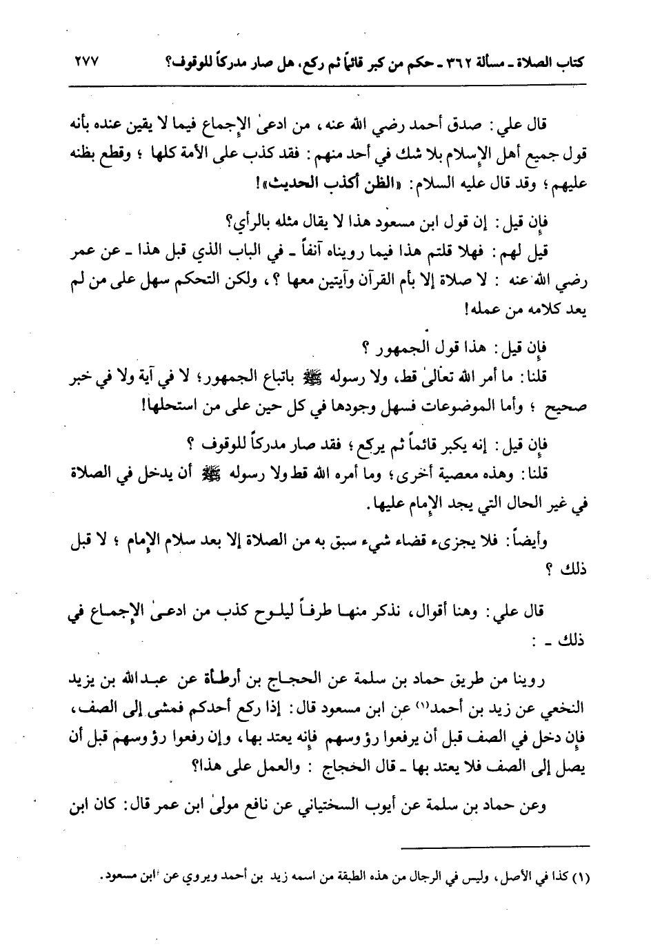 قَالَ عَلِيٌّ: صَدَقَ أَحْمَدُ - رَضِيَ اللَّهُ عَنْهُ - مَنْ ادَّعَى الْإِجْمَاعَ فِيمَا لَا يَقِينَ عِنْدَهُ بِأَنَّهُ قَوْلُ جَمِيعِ أَهْلِ الْإِسْلَامِ بِلَا شَكٍّ فِي أَحَدٍ مِنْهُمْ: قَدْ كَذَبَ عَلَى الْأُمَّةِ كُلِّهَا؛ وَقَطَعَ بِظَنِّهِ عَلَيْهِمْ؛ وَقَدْ قَالَ - عَلَيْهِ السَّلَامُ -: «الظَّنُّ أَكْذَبُ الْحَدِيثِ» فَإِنْ قِيلَ: إنَّ قَوْلَ ابْنِ مَسْعُودٍ هَذَا لَا يُقَالُ مِثْلُهُ بِالرَّأْيِ. قِيلَ لَهُمْ: فَهَلَّا قُلْتُمْ هَذَا فِيمَا رُوِّينَاهُ آنِفًا - فِي الْبَابِ الَّذِي قَبْلَ هَذَا - عَنْ عُمَرَ - رَضِيَ اللَّهُ عَنْهُ -: لَا صَلَاةَ إلَّا بِأُمِّ الْقُرْآنِ وَآيَتَيْنِ مَعَهَا، وَلَكِنَّ التَّحَكُّمَ سَهْلٌ عَلَى مَنْ لَمْ يُعَدَّ كَلَامُهُ مِنْ عَمَلِهِ فَإِنْ قِيلَ: هَذَا قَوْلُ الْجُمْهُورِ، قُلْنَا: مَا أَمَرَ اللَّهُ تَعَالَى قَطُّ وَلَا رَسُولُهُ - صَلَّى اللَّهُ عَلَيْهِ وَسَلَّمَ - بِاتِّبَاعِ الْجُمْهُورِ؛ لَا فِي آيَةٍ وَلَا فِي خَبَرٍ صَحِيحٍ؛ وَأَمَّا الْمَوْضُوعَاتِ فَسَهْلٌ وُجُودُهَا فِي كُلِّ حِينٍ عَلَى مَنْ اسْتَحَلَّهَا. فَإِنْ قِيلَ: إنَّهُ يُكَبِّرُ قَائِمًا ثُمَّ يَرْكَعُ؛ فَقَدْ صَارَ مُدْرِكًا لِلْوُقُوفِ قُلْنَا: وَهَذِهِ مَعْصِيَةٌ أُخْرَى؛ وَمَا أَمَرَهُ اللَّهُ قَطُّ وَلَا رَسُولُهُ - صَلَّى اللَّهُ عَلَيْهِ وَسَلَّمَ - أَنْ يَدْخُلَ فِي الصَّلَاةِ فِي غَيْرِ الْحَالِ الَّتِي يَجِدُ الْإِمَامَ عَلَيْهَا. وَأَيْضًا: فَلَا يُجْزِئُ قَضَاءُ شَيْءٍ سَبَقَ بِهِ مِنْ الصَّلَاةِ إلَّا بَعْدَ سَلَامِ الْإِمَامِ؛ لَا قَبْلَ ذَلِكَ قَالَ عَلِيٌّ: وَهُنَا أَقْوَالٌ، نَذْكُرُ مِنْهَا طَرَفًا لِيَلُوحَ كَذِبُ مِنْ ادَّعَى الْإِجْمَاعَ فِي ذَلِكَ -: رُوِّينَا مِنْ طَرِيقِ حَمَّادِ بْنِ سَلَمَةَ عَنْ الْحَجَّاجِ بْنِ أَرْطَاةَ عَنْ عَبْدِ اللَّهِ بْنِ يَزِيدَ النَّخَعِيِّ عَنْ زَيْدِ بْنِ أَحْمَدَ عَنْ ابْنِ مَسْعُودٍ قَالَ: إذَا رَكَعَ أَحَدُكُمْ فَمَشَى إلَى الصَّفِّ، فَإِنْ دَخَلَ فِي الصَّفِّ قَبْلَ أَنْ يَرْفَعُوا رُءُوسَهُمْ فَإِنَّهُ يُعْتَدُّ بِهَا، وَإِنْ رَفَعُوا رُءُوسَهُمْ قَبْلَ أَنْ يَصِلَ إلَى الصَّفِّ فَلَا يُعْتَدُّ بِهَا - قَالَ الْحَجَّاجُ: وَالْعَمَلُ عَلَى هَذَا، وَعَنْ حَمَّادِ بْنِ سَلَمَةَ عَنْ أَيُّوبَ السِّخْتِيَانِيِّ عَنْ نَافِعٍ مَوْلَى ابْنِ عُمَرَ قَالَ: كَانَ ابْنُ عُمَرَ