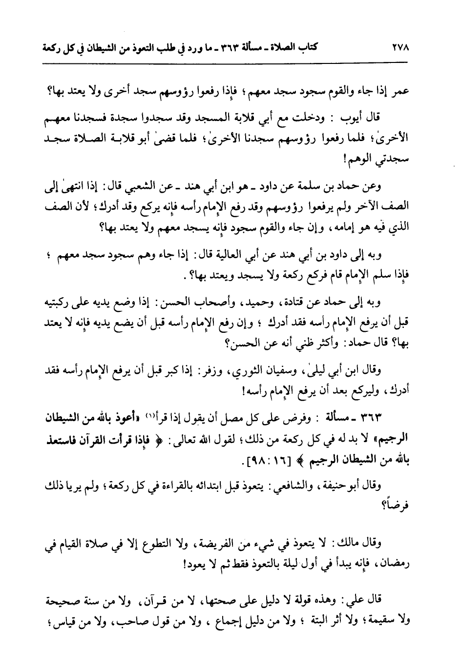 363 - مَسْأَلَةٌ: وَفَرْضٌ عَلَى كُلِّ مُصَلٍّ أَنْ يَقُولَ إذَا قَرَأَ " أَعُوذُ بِاَللَّهِ مِنْ الشَّيْطَانِ الرَّجِيمِ " لَا بُدَّ لَهُ فِي كُلِّ رَكْعَةٍ مِنْ ذَلِكَ؛ لِقَوْلِ اللَّهِ تَعَالَى: {فَإِذَا قَرَأْتَ الْقُرْآنَ فَاسْتَعِذْ بِاللَّهِ مِنَ الشَّيْطَانِ الرَّجِيمِ} [النحل: 98] . وَقَالَ أَبُو حَنِيفَةَ، وَالشَّافِعِيُّ: يَتَعَوَّذُ قَبْلَ ابْتِدَائِهِ بِالْقِرَاءَةِ فِي كُلِّ رَكْعَةٍ؛ وَلَمْ يَرَيَا ذَلِكَ فَرْضًا وَقَالَ مَالِكٌ: لَا يَتَعَوَّذُ فِي شَيْءٍ مِنْ الْفَرِيضَةِ، وَلَا التَّطَوُّعِ إلَّا فِي صَلَاةِ الْقِيَامِ فِي رَمَضَانَ، فَإِنَّهُ يَبْدَأُ فِي أَوَّلِ لَيْلَةٍ بِالتَّعَوُّذِ فَقَطْ ثُمَّ لَا يَعُودَ. قَالَ عَلِيٌّ: وَهَذِهِ قَوْلَةٌ لَا دَلِيلَ عَلَى صِحَّتِهَا، لَا مِنْ قُرْآنٍ، وَلَا مِنْ سُنَّةٍ صَحِيحَةٍ وَلَا سَقِيمَةٍ؛ وَلَا أَثَرٍ أَلْبَتَّةَ؛ وَلَا مِنْ دَلِيلِ إجْمَاعٍ، وَلَا مِنْ قَوْلِ صَاحِبٍ، وَلَا مِنْ قِيَاسٍ؛
