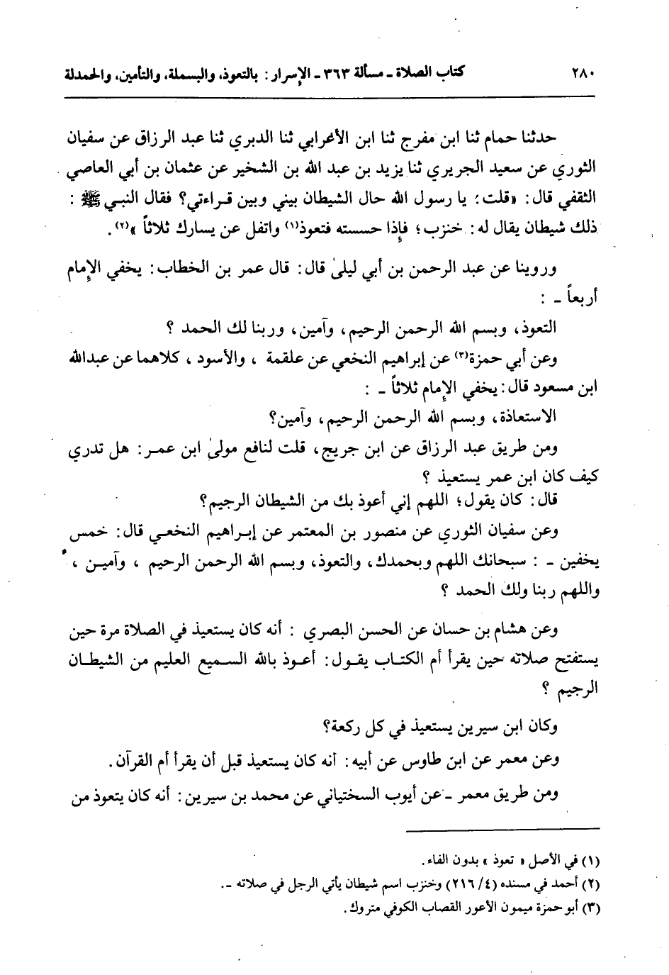 حَدَّثَنَا حُمَامٌ ثنا ابْنُ مُفَرِّجٍ ثنا ابْنُ الْأَعْرَابِيِّ ثنا الدَّبَرِيُّ ثنا عَبْدُ الرَّزَّاقِ عَنْ سُفْيَانَ الثَّوْرِيِّ عَنْ سَعِيدٍ الْجُرَيْرِيِّ ثنا يَزِيدُ بْنُ عَبْدِ اللَّهِ بْنِ الشِّخِّيرِ عَنْ عُثْمَانَ بْنِ أَبِي الْعَاصِ الثَّقَفِيِّ قَالَ: «قُلْت: يَا رَسُولَ اللَّهِ حَالَ الشَّيْطَانُ بَيْنِي وَبَيْنَ قِرَاءَتِي. فَقَالَ النَّبِيُّ - صَلَّى اللَّهُ عَلَيْهِ وَسَلَّمَ -: ذَلِكَ شَيْطَانٌ يُقَالُ لَهُ: خَنْزَبٌ؛ فَإِذَا حَسَسْتَهُ فَتَعَوَّذْ وَاتْفُلْ عَنْ يَسَارِكَ ثَلَاثًا» . وَرُوِّينَا عَنْ عَبْدِ الرَّحْمَنِ بْنِ أَبِي لَيْلَى قَالَ: قَالَ عُمَرُ بْنُ الْخَطَّابِ: يُخْفِي الْإِمَامُ أَرْبَعًا -: التَّعَوُّذُ، وَبِسْمِ اللَّهِ الرَّحْمَنِ الرَّحِيمِ، وَآمِينَ، وَرَبَّنَا لَكَ الْحَمْدُ. وَعَنْ أَبِي حَمْزَةَ عَنْ إبْرَاهِيمَ النَّخَعِيِّ عَنْ عَلْقَمَةَ، وَالْأَسْوَدِ، كِلَاهُمَا عَنْ عَبْدِ اللَّهِ بْنِ مَسْعُودٍ قَالَ: يُخْفِي الْإِمَامُ ثَلَاثًا -: الِاسْتِعَاذَةُ، وَبِسْمِ اللَّهِ الرَّحْمَنِ الرَّحِيمِ، وَآمِينَ وَمِنْ طَرِيقِ عَبْدِ الرَّزَّاقِ عَنْ ابْنِ جُرَيْجٍ، قُلْت لِنَافِعٍ مَوْلَى ابْنِ عُمَرَ: هَلْ تَدْرِي كَيْفَ كَانَ ابْنُ عُمَرَ يَسْتَعِيذُ؟ قَالَ: كَانَ يَقُولُ؛ اللَّهُمَّ إنِّي أَعُوذُ بِكَ مِنْ الشَّيْطَانِ الرَّجِيمِ، وَعَنْ سُفْيَانَ الثَّوْرِيِّ عَنْ مَنْصُورِ بْنِ الْمُعْتَمِرِ عَنْ إبْرَاهِيمَ النَّخَعِيِّ قَالَ: خَمْسٌ يُخْفَيْنَ -: سُبْحَانَكَ اللَّهُمَّ وَبِحَمْدِكَ، وَالتَّعَوُّذُ، وَبِسْمِ اللَّهِ الرَّحْمَنِ الرَّحِيمِ، وَآمِينَ، وَاَللَّهُمَّ رَبَّنَا وَلَكَ الْحَمْدُ وَعَنْ هِشَامِ بْنِ حَسَّانَ عَنْ الْحَسَنِ الْبَصْرِيِّ: أَنَّهُ كَانَ يَسْتَعِيذُ فِي الصَّلَاةِ مَرَّةً حِينَ يَسْتَفْتِحُ صَلَاتَهُ حِينَ يَقْرَأُ أُمَّ الْكِتَابِ يَقُولُ: أَعُوذُ بِاَللَّهِ السَّمِيعِ الْعَلِيمِ مِنْ الشَّيْطَانِ الرَّجِيمِ، وَكَانَ ابْنُ سِيرِينَ يَسْتَعِيذُ فِي كُلِّ رَكْعَةٍ وَعَنْ مَعْمَرٍ عَنْ ابْنِ طَاوُسٍ عَنْ أَبِيهِ: أَنَّهُ كَانَ يَسْتَعِيذُ قَبْلَ أَنْ يَقْرَأَ أُمَّ الْقُرْآنِ. وَمِنْ طَرِيقِ مَعْمَرٍ - عَنْ أَيُّوبَ السِّخْتِيَانِيِّ عَنْ مُحَمَّدِ بْنِ سِيرِينَ: أَنَّهُ كَانَ يَتَعَوَّذُ مِنْ