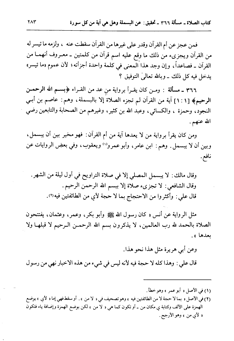 366 - مَسْأَلَةٌ: وَمَنْ كَانَ يَقْرَأُ بِرِوَايَةِ مَنْ عَدَّ مِنْ الْقُرَّاءِ بِسْمِ اللَّهِ الرَّحْمَنِ الرَّحِيمِ آيَةً مِنْ الْقُرْآنِ لَمْ تُجْزِهِ الصَّلَاةُ إلَّا بِالْبَسْمَلَةِ، وَهُمْ: عَاصِمُ بْنُ أَبِي النَّجُودِ، وَحَمْزَةُ، وَالْكِسَائِيُّ، وَعَبْدُ اللَّهِ بْنُ كَثِيرٍ، وَغَيْرُهُمْ مِنْ الصَّحَابَةِ وَالتَّابِعِينَ - رَضِيَ اللَّهُ عَنْهُمْ -. وَمَنْ كَانَ يَقْرَأُ بِرِوَايَةِ مَنْ لَا يَعُدُّهَا آيَةً مِنْ أُمِّ الْقُرْآنِ: فَهُوَ مُخَيَّرٌ بَيْنَ أَنْ يُبَسْمِلَ، وَبَيْنَ أَنْ لَا يُبَسْمِلَ. وَهُمْ: ابْنُ عَامِرٍ، وَأَبُو عَمْرٍو وَيَعْقُوبُ، وَفِي بَعْضِ الرِّوَايَاتِ عَنْ نَافِعٍ. وَقَالَ مَالِكٌ: لَا يُبَسْمِلُ الْمُصَلِّي إلَّا فِي صَلَاةِ التَّرَاوِيحِ فِي أَوَّلِ لَيْلَةٍ مِنْ الشَّهْرِ. وَقَالَ الشَّافِعِيُّ: لَا تُجْزِئُ صَلَاةٌ إلَّا بِبَسْمِ اللَّهِ الرَّحْمَنِ الرَّحِيمِ. قَالَ عَلِيٌّ: وَأَكْثَرُوا مِنْ الِاحْتِجَاجِ بِمَا لَا حُجَّةَ لِأَيٍّ مِنْ الطَّائِفَتَيْنِ فِيهِ. مِثْلُ الرِّوَايَةِ عَنْ أَنَسٍ «كَانَ رَسُولُ اللَّهِ - صَلَّى اللَّهُ عَلَيْهِ وَسَلَّمَ - وَأَبُو بَكْرٍ، وَعُمَرُ، وَعُثْمَانُ، يَفْتَتِحُونَ الصَّلَاةَ بِالْحَمْدُ لِلَّهِ رَبِّ الْعَالَمِينَ، لَا يَذْكُرُونَ بِسْمِ اللَّهِ الرَّحْمَنِ الرَّحِيمِ لَا قَبْلَهَا وَلَا بَعْدَهَا» . وَعَنْ أَبِي هُرَيْرَةَ مِثْلُ هَذَا. قَالَ عَلِيٌّ: وَهَذَا كُلُّهُ لَا حُجَّةَ فِيهِ لِأَنَّهُ لَيْسَ فِي شَيْءٍ مِنْ هَذِهِ الْأَخْبَارِ نَهْيٌ مِنْ رَسُولِ