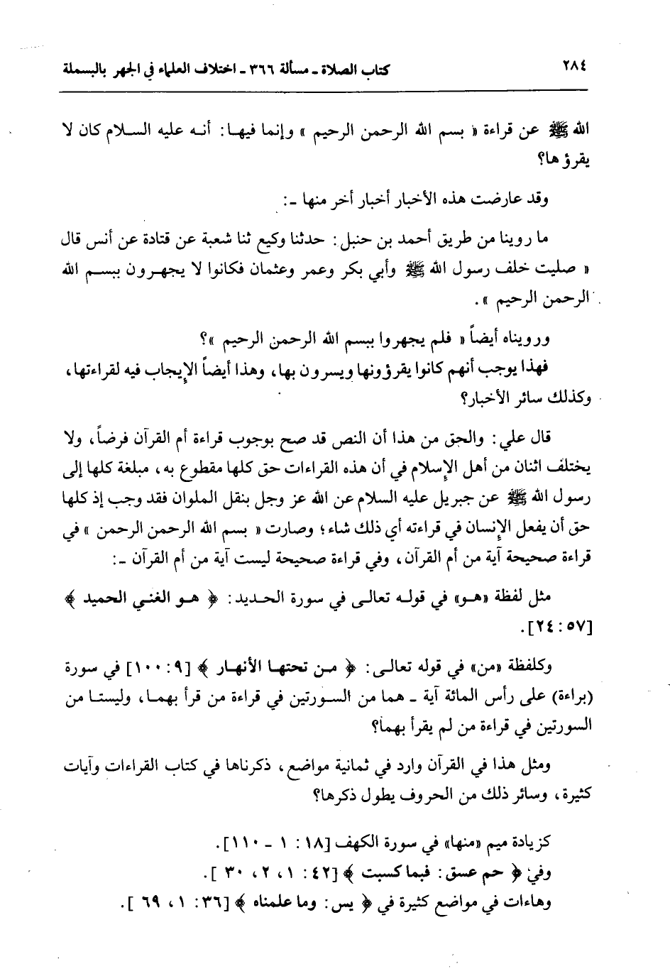 اللَّهِ - صَلَّى اللَّهُ عَلَيْهِ وَسَلَّمَ - عَنْ قِرَاءَةِ " بِسْمِ اللَّهِ الرَّحْمَنِ الرَّحِيمِ " وَإِنَّمَا فِيهَا: أَنَّهُ - عَلَيْهِ السَّلَامُ - كَانَ لَا يَقْرَؤُهَا وَقَدْ عَارَضَتْ هَذِهِ الْأَخْبَارُ أَخْبَارَ أُخَرَ مِنْهَا -: مَا رُوِّينَا مِنْ طَرِيقِ أَحْمَدَ بْنِ حَنْبَلٍ: حَدَّثَنَا وَكِيعٌ ثنا شُعْبَةُ عَنْ قَتَادَةَ عَنْ أَنَسٍ قَالَ «صَلَّيْتُ خَلْفَ رَسُولِ اللَّهِ - صَلَّى اللَّهُ عَلَيْهِ وَسَلَّمَ - وَأَبِي بَكْرٍ وَعُمَرَ وَعُثْمَانَ فَكَانُوا لَا يَجْهَرُونَ بِبَسْمِ اللَّهِ الرَّحْمَنِ الرَّحِيمِ» . وَرُوِّينَاهُ أَيْضًا " فَلَمْ يَجْهَرُوا بِبَسْمِ اللَّهِ الرَّحْمَنِ الرَّحِيمِ " فَهَذَا يُوجِبُ أَنَّهُمْ كَانُوا يَقْرَءُونَهَا وَيَسُرُّونَ بِهَا، وَهَذَا أَيْضًا الْإِيجَابُ فِيهِ لِقِرَاءَتِهَا، وَكَذَلِكَ سَائِرُ الْأَخْبَارِ. قَالَ عَلِيٌّ: وَالْحَقُّ مِنْ هَذَا أَنَّ النَّصَّ قَدْ صَحَّ بِوُجُوبِ قِرَاءَةِ أُمِّ الْقُرْآنِ فَرْضًا، وَلَا يَخْتَلِفُ اثْنَانِ مِنْ أَهْلِ الْإِسْلَامِ فِي أَنَّ هَذِهِ الْقِرَاءَاتِ حَقٌّ كُلُّهَا مَقْطُوعٌ بِهِ، مُبَلَّغَةٌ كُلُّهَا إلَى رَسُولِ اللَّهِ - صَلَّى اللَّهُ عَلَيْهِ وَسَلَّمَ - عَنْ جِبْرِيلَ - عَلَيْهِ السَّلَامُ - عَنْ اللَّهِ عَزَّ وَجَلَّ بِنَقْلِ الْمَلَوَانِ فَقَدْ وَجَبَ إذْ كُلُّهَا حَقٌّ أَنْ يَفْعَلَ الْإِنْسَانُ فِي قِرَاءَتِهِ أَيَّ ذَلِكَ شَاءَ؛ وَصَارَتْ " بِسْمِ اللَّهِ الرَّحْمَنِ الرَّحِيمِ " فِي قِرَاءَةٍ صَحِيحَةٍ آيَةً مِنْ أُمِّ الْقُرْآنِ، وَفِي قِرَاءَةٍ صَحِيحَةٍ لَيْسَتْ آيَةً مِنْ أُمِّ الْقُرْآنِ -: مِثْلُ لَفْظَةِ " هُوَ " فِي قَوْله تَعَالَى فِي سُورَةِ الْحَدِيدِ: {هُوَ الْغَنِيُّ الْحَمِيدُ} [لقمان: 26] . وَكَلَفْظَةِ " مِنْ " فِي قَوْله تَعَالَى: {مِنْ تَحْتِهَا الأَنْهَارُ} [التوبة: 89] فِي سُورَةِ (بَرَاءَةٌ) عَلَى رَأْسِ الْمِائَةِ آيَةٍ - هُمَا مِنْ السُّورَتَيْنِ فِي قِرَاءَةِ مَنْ قَرَأَ بِهِمَا، وَلَيْسَتَا مِنْ السُّورَتَيْنِ فِي قِرَاءَةِ مَنْ لَمْ يَقْرَأْ بِهِمَا. وَمِثْلُ هَذَا فِي الْقُرْآنِ وَارِدٌ فِي ثَمَانِيَةِ مَوَاضِعَ، ذَكَرْنَاهَا فِي كِتَابِ الْقِرَاءَاتِ وَآيَاتٍ كَثِيرَةٍ، وَسَائِرُ ذَلِكَ مِنْ الْحُرُوفِ يَطُولُ ذِكْرُهَا. كَزِيَادَةِ مِيمِ " مِنْهَا " فِي سُورَةِ الْكَهْفِ. وَفِي {حم} [الشورى: 1] {عسق} [الشورى: 2] : {فَبِمَا كَسَبَتْ} [الشورى: 30] . وَهَاءَاتٍ فِي مَوَاضِعَ كَثِيرَةٍ فِي {يس} [يس: 1] : {وَمَا عَلَّمْنَاهُ} [يس: 69] .