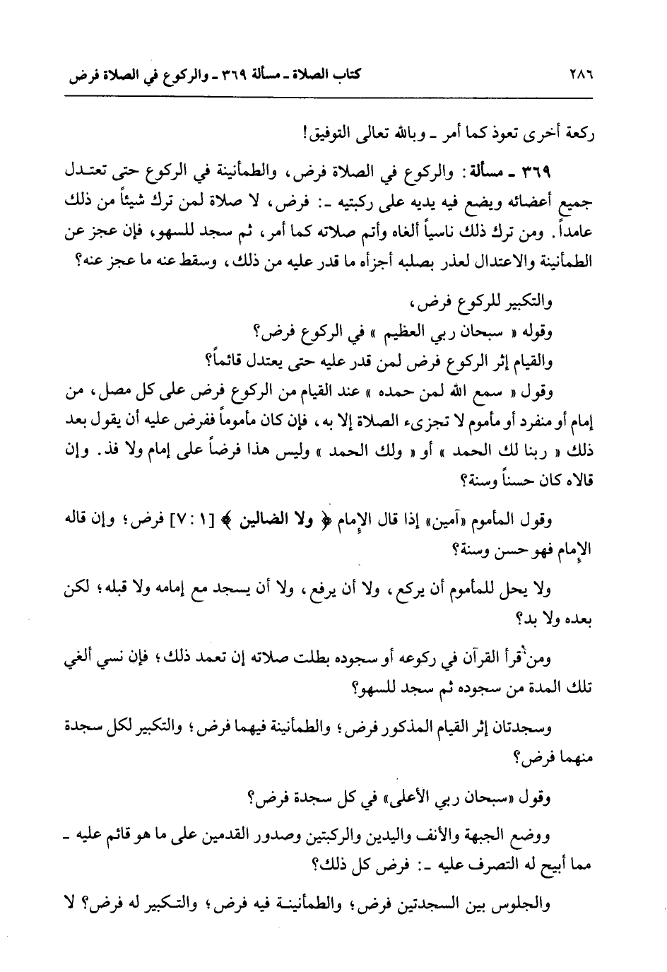 [مَسْأَلَةٌ الرُّكُوعُ فِي الصَّلَاةِ وَالطُّمَأْنِينَةُ فِيهِ]
