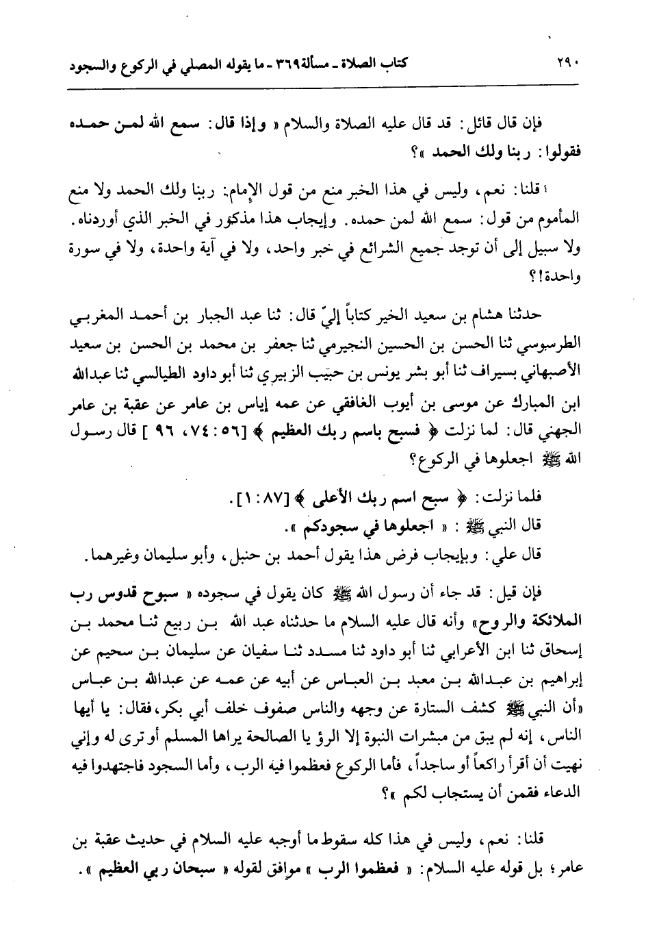 فَإِنْ قَالَ قَائِلٌ: قَدْ قَالَ - عَلَيْهِ الصَّلَاةُ وَالسَّلَامُ - «وَإِذَا قَالَ: سَمِعَ اللَّهُ لِمَنْ حَمِدَهُ فَقُولُوا: رَبَّنَا وَلَكَ الْحَمْدُ» قُلْنَا: نَعَمْ، وَلَيْسَ فِي هَذَا الْخَبَرِ مَنْعٌ مِنْ قَوْلِ الْإِمَامِ: رَبَّنَا وَلَكَ الْحَمْدُ وَلَا مَنْعُ الْمَأْمُومِ مِنْ قَوْلِ: سَمِعَ اللَّهُ لِمَنْ حَمِدَهُ. وَإِيجَابُ هَذَا مَذْكُورٌ فِي الْخَبَرِ الَّذِي أَوْرَدْنَاهُ. وَلَا سَبِيلَ إلَى أَنْ تُوجَدَ جَمِيعُ الشَّرَائِعِ فِي خَبَرٍ وَاحِدٍ، وَلَا فِي آيَةٍ وَاحِدَةٍ، وَلَا فِي سُورَةٍ وَاحِدَةٍ. حَدَّثَنَا هِشَامُ بْنُ سَعِيدِ الْخَيْرِ كِتَابًا إلَيَّ قَالَ: ثَنَا عَبْدُ الْجَبَّارِ بْنُ أَحْمَدَ الْمَغْرِبِيُّ الطَّرَسُوسِيُّ ثَنَا الْحَسَنُ بْنُ الْحُسَيْنِ النَّجِيرَمِيُّ ثَنَا جَعْفَرُ بْنُ مُحَمَّدُ بْنُ الْحَسَنِ بْنِ سَعِيدٍ الْأَصْبَهَانِيّ بسيراف ثَنَا أَبُو بِشْرٍ يُونُسُ بْنُ حَبِيبٍ الزُّبَيْرِيُّ ثَنَا أَبُو دَاوُد الطَّيَالِسِيُّ ثَنَا عَبْدُ اللَّهِ بْنُ الْمُبَارَكِ عَنْ مُوسَى بْنِ أَيُّوبَ الْغَافِقِيِّ عَنْ عَمِّهِ إيَاسِ بْنِ عَامِرٍ عَنْ عُقْبَةَ بْنِ عَامِرٍ الْجُهَنِيِّ قَالَ: «لَمَّا نَزَلَتْ {فَسَبِّحْ بِاسْمِ رَبِّكَ الْعَظِيمِ} [الواقعة: 74] قَالَ رَسُولُ اللَّهِ - صَلَّى اللَّهُ عَلَيْهِ وَسَلَّمَ - اجْعَلُوهَا فِي الرُّكُوعِ فَلَمَّا نَزَلَتْ: {سَبِّحِ اسْمَ رَبِّكَ الأَعْلَى} [الأعلى: 1] . قَالَ النَّبِيُّ - صَلَّى اللَّهُ عَلَيْهِ وَسَلَّمَ -: اجْعَلُوهَا فِي سُجُودِكُمْ» . قَالَ عَلِيٌّ: وَبِإِيجَابِ فَرْضِ هَذَا يَقُولُ أَحْمَدُ بْنُ حَنْبَلٍ، وَأَبُو سُلَيْمَانَ وَغَيْرُهُمَا. فَإِنْ قِيلَ: قَدْ جَاءَ أَنَّ رَسُولَ اللَّهِ - صَلَّى اللَّهُ عَلَيْهِ وَسَلَّمَ - كَانَ يَقُولُ فِي سُجُودِهِ «سُبُّوحٌ قُدُّوسٌ رَبُّ الْمَلَائِكَةِ وَالرُّوحِ» وَأَنَّهُ قَالَ - عَلَيْهِ السَّلَامُ - مَا حَدَّثَنَاهُ عَبْدُ اللَّهِ بْنُ رَبِيعٍ ثنا مُحَمَّدُ بْنُ إِسْحَاقَ ثنا ابْنُ الْأَعْرَابِيِّ ثنا أَبُو دَاوُد ثنا مُسَدَّدٌ ثنا سُفْيَانُ عَنْ سُلَيْمَانَ بْنِ سُحَيْمٍ عَنْ إبْرَاهِيمَ بْنِ عَبْدِ اللَّهِ بْنِ مَعْبَدِ بْنِ الْعَبَّاسِ عَنْ أَبِيهِ عَنْ عَمِّهِ عَنْ عَبْدِ اللَّهِ بْنِ عَبَّاسٍ «أَنَّ النَّبِيَّ - صَلَّى اللَّهُ عَلَيْهِ وَسَلَّمَ - كَشَفَ السِّتَارَةَ عَنْ وَجْهِهِ، وَالنَّاسُ صُفُوفٌ خَلْفَ أَبِي بَكْرٍ، فَقَالَ: يَا أَيُّهَا النَّاسُ، إنَّهُ لَمْ يَبْقَ مِنْ مُبَشِّرَاتِ النُّبُوَّةِ إلَّا الرُّؤْيَا الصَّالِحَةُ يَرَاهَا الْمُسْلِمُ أَوْ تُرَى لَهُ وَإِنِّي نُهِيتُ أَنْ أَقْرَأَ رَاكِعًا أَوْ سَاجِدًا، فَأَمَّا الرُّكُوعُ فَعَظِّمُوا فِيهِ الرَّبَّ، وَأَمَّا السُّجُودُ فَاجْتَهِدُوا فِيهِ الدُّعَاءَ فَقَمِنٌ أَنْ يُسْتَجَابَ لَكُمْ.» قُلْنَا: نَعَمْ، وَلَيْسَ فِي هَذَا كُلِّهِ سُقُوطُ مَا أَوْجَبَهُ - عَلَيْهِ السَّلَامُ - فِي حَدِيثِ عُقْبَةَ بْنِ عَامِرٍ؛ بَلْ قَوْلُهُ - عَلَيْهِ السَّلَامُ -: " فَعَظِّمُوا الرَّبَّ " مُوَافِقٌ لِقَوْلِهِ " سُبْحَانَ رَبِّي الْعَظِيمِ ".