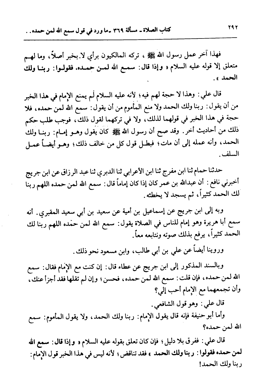 فَهَذَا آخِرُ عَمَلِ رَسُولِ اللَّهِ - صَلَّى اللَّهُ عَلَيْهِ وَسَلَّمَ - تَرَكَهُ الْمَالِكِيُّونَ بِرَأْيٍ لَا بِخَبَرٍ أَصْلًا، وَمَا لَهُمْ مُتَعَلِّقٌ إلَّا قَوْلُهُ - عَلَيْهِ السَّلَامُ - «وَإِذَا قَالَ: سَمِعَ اللَّهُ لِمَنْ حَمِدَهُ، فَقُولُوا: رَبَّنَا وَلَكَ الْحَمْدُ» . قَالَ عَلِيٌّ: وَهَذَا لَا حُجَّةَ لَهُمْ فِيهِ؛ لِأَنَّهُ - عَلَيْهِ السَّلَامُ - لَمْ يَمْنَعْ الْإِمَامَ فِي هَذَا الْخَبَرِ مِنْ أَنْ يَقُولَ: رَبَّنَا وَلَك الْحَمْدُ وَلَا مَنَعَ الْمَأْمُومَ مِنْ أَنْ يَقُولَ: سَمِعَ اللَّهُ لِمَنْ حَمِدَهُ، فَلَا حُجَّةَ فِي هَذَا الْخَبَرِ فِي قَوْلِهِمَا لِذَلِكَ، وَلَا فِي تَرْكِهِمَا لِقَوْلِ ذَلِكَ، فَوَجَبَ طَلَبُ حُكْمِ ذَلِكَ مِنْ أَحَادِيثَ أُخَرَ. وَقَدْ صَحَّ أَنَّ رَسُولَ اللَّهِ - صَلَّى اللَّهُ عَلَيْهِ وَسَلَّمَ - كَانَ يَقُولُ وَهُوَ إمَامٌ: رَبَّنَا وَلَكَ الْحَمْدُ، وَأَنَّهُ عَمَلُهُ إلَى أَنْ مَاتَ؛ فَبَطَلَ قَوْلُ كُلِّ مَنْ خَالَفَ ذَلِكَ؛ وَهُوَ أَيْضًا عَمَلُ السَّلَفِ. حَدَّثَنَا حُمَامٌ ثنا ابْنُ مُفَرِّجٍ ثنا ابْنُ الْأَعْرَابِيِّ ثنا الدَّبَرِيُّ ثنا عَبْدُ الرَّزَّاقِ عَنْ ابْنِ جُرَيْجٍ أَخْبَرَنِي نَافِعٌ: أَنَّ عَبْدَ اللَّهِ بْنَ عُمَرَ كَانَ إذَا كَانَ إمَامًا قَالَ: سَمِعَ اللَّهُ لِمَنْ حَمِدَهُ اللَّهُمَّ رَبَّنَا لَك الْحَمْدُ كَثِيرًا، ثُمَّ يَسْجُدُ لَا يُخْطِئُهُ. وَبِهِ إلَى ابْنِ جُرَيْجٍ عَنْ إسْمَاعِيلَ بْنِ أُمَيَّةَ عَنْ سَعِيدِ بْنِ أَبِي سَعِيدٍ الْمَقْبُرِيِّ. أَنَّهُ سَمِعَ أَبَا هُرَيْرَةَ وَهُوَ إمَامٌ لِلنَّاسِ فِي الصَّلَاةِ يَقُولُ: سَمِعَ اللَّهُ لِمَنْ حَمِدَهُ اللَّهُمَّ رَبَّنَا لَك الْحَمْدُ كَثِيرًا، يَرْفَعُ بِذَلِكَ صَوْتَهُ وَنُتَابِعُهُ مَعًا. وَرُوِّينَا أَيْضًا عَنْ عَلِيِّ بْنِ أَبِي طَالِبٍ، وَابْنِ مَسْعُودٍ نَحْوَ ذَلِكَ. وَبِالسَّنَدِ الْمَذْكُورِ إلَى ابْنِ جُرَيْجٍ عَنْ عَطَاءٍ قَالَ: إنْ كُنْت مَعَ الْإِمَامِ فَقَالَ: سَمِعَ اللَّهُ لِمَنْ حَمِدَهُ، فَإِنْ قُلْتَ: سَمِعَ اللَّهُ لِمَنْ حَمِدَهُ، فَحَسَنٌ؛ وَإِنْ لَمْ تَقُلْهَا فَقَدْ أَجْزَأَ عَنْكَ، وَإِنْ تَجْمَعْهُمَا مَعَ الْإِمَامِ أَحَبُّ إلَيَّ قَالَ عَلِيٌّ: وَهُوَ قَوْلُ الشَّافِعِيِّ. وَأَمَّا أَبُو حَنِيفَةَ فَإِنَّهُ قَالَ يَقُولُ الْإِمَامُ: رَبَّنَا وَلَكَ الْحَمْدُ، وَلَا يَقُولُ الْمَأْمُومُ: سَمِعَ اللَّهُ لِمَنْ حَمِدَهُ. قَالَ عَلِيٌّ: فَفَرَّقَ بِلَا دَلِيلٍ؛ فَإِنْ كَانَ تَعَلَّقَ بِقَوْلِهِ - عَلَيْهِ السَّلَامُ - «وَإِذَا قَالَ: سَمِعَ اللَّهُ لِمَنْ حَمِدَهُ فَقُولُوا: رَبَّنَا وَلَكَ الْحَمْدُ» فَقَدْ تَنَاقَضَ؛ لِأَنَّهُ لَيْسَ فِي هَذَا الْخَبَرِ قَوْلُ الْإِمَامِ: رَبَّنَا وَلَكَ الْحَمْدُ