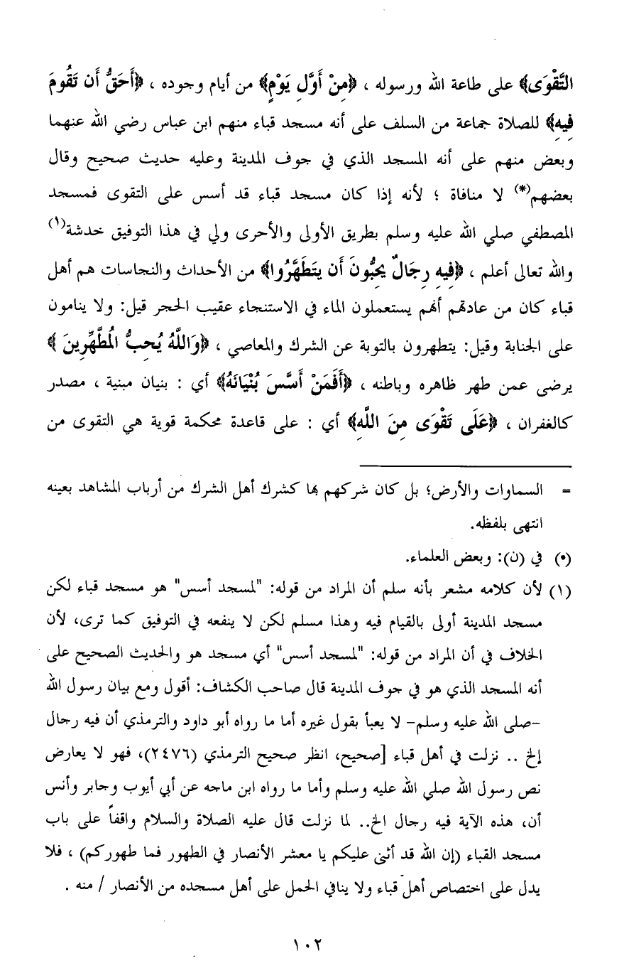 التَّقْوَى) على طاعة الله ورسوله، (مِنْ أَوَّلِ يَوْمٍ) من أيام وجوده، (أَحَقُّ أَنْ تَقُومَ فِيهِ) للصلاة جماعة من السلف على أنه مسجد قباء منهم ابن عباس رضي الله عنهما وبعض منهم على أنه المسجد الذي في جوف المدينة وعليه حديث صحيح وقال بعضهم لا منافاة، لأنه إذا كان مسجد قباء قد أسس على التقوى فمسجد المصطفى صلي الله عليه وسلم بطريق الأولى والأحرى ولي في هذا التوفيق خدشة والله تعالى أعلم، (فِيهِ رِجَالٌ يُحِبُّونَ أَنْ يَتَطَهَّرُوا) من الأحداث والنجاسات هم أهل قباء كان من عادتهم أنَّهم يستعملون الماء في الاستنجاء عقيب الحجر قيل: ولا ينامون على الجنابة وقيل: يتطهرون بالتوبة عن الشرك والمعاصي، (وَاللهُ يُحِبُّ الْمُطَّهِّرِينَ) يرضى عمن طهر ظاهره وباطنه، (أَفَمَنْ أَسَّسَ بُنْيَانَهُ) أي: بنيان مبنية، مصدر كالغفران، (عَلَى تَقْوَى مِنَ اللهِ) أي: على قاعدة محكمة قوية هي التقوى من
