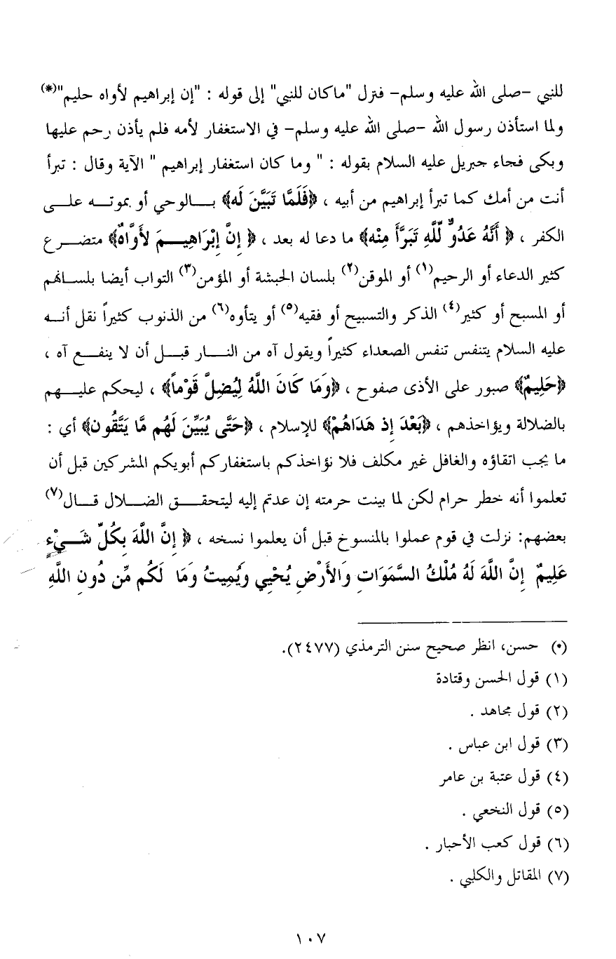 للنبي - صلى الله عليه وسلم - فنزل " ما كان للنبي " إلى قوله: " إن إبراهيم لأواه حليم " ولما استأذن رسول الله - صلى الله عليه وسلم - في الاستغفار لأمه فلم يأذن رحم عليها وبكى فجاء جبريل عليه السلام بقوله " وما كان استغفار إبراهيم " الآية وقال: تبرأ أنت من أمك كما تبرأ إبراهيم من أبيه، (فَلَمَّا تَبَيَّنَ لَهُ) بالوحي أو بموته على الكفر، (أَنَّهُ عَدُوٌّ لله تَبَرَّأَ مِنْهُ) ما دعا له بعد، (إِنَّ إِبْرَاهِيمَ لَأَوَّاهٌ) متضرع كثير الدعاء أو الرحيم أو الموقن بلسان الحبشة أو المؤمن التواب أيضًا بلسانهم أو المسبح أو كثير الذكر والتسبيح أو فقيه أو يتأوه من الذنوب كثيرًا نقل أنه عليه السلام يتنفس تنفس الصعداء كثيرًا ويقول آه من النار قبل أن لا ينفع آه، (حَلِيمٌ) صبور على الأذى صفوح، (وَمَا كَانَ اللهُ لِيُضِل قَوْمًا)، ليحكم عليهم بالضلالة ويؤاخذهم، (بعْدَ إِذ هَدَاهُمْ) للإسلام، (حَتَّى يُبَيِّنَ لَهُم مَّا يَتَّقُون) أي: ما يجب اتقاؤه والغافل غير مكلف فلا نؤاخذكم باستغفاركم أبويكم المشركين قبل أن تعلموا أنه خطر حرام لكن لما بينت حرمته إن عدتم إليه ليتحقق الضلال قال بعضهم: نزلت في قوم عملوا بالمنسوخ قبل أن يعلموا نسخه، (إِنَّ اللهَ بِكُلِّ شَيْءٍ عَلِيمٌ (115) إِنَّ اللهَ لَهُ مُلْكُ السَّمَاوَاتِ وَالْأَرْضِ يُحْيِي وَيُمِيتُ وَمَا لَكُمْ مِنْ دُونِ اللهِ