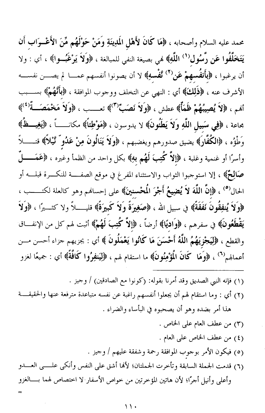 محمد عليه السلام وأصحابه، (مَا كَانَ لِأَهْلِ الْمَدِينَةِ وَمَنْ حَوْلَهُمْ مِنَ الْأَعْرَابِ أَنْ يَتَخَلَّفُوا عَنْ رَسُولِ اللهِ) نهي بصيغة النفي للمبالغة، (وَلاَ يَرْغَبُوا)، أي: ولا أن يرغبوا، (بِأَنْفُسِهِمْ عَنْ نَفْسِهِ) لا أن يصونوا أنفسهم عما لم يصن نفسه الأشرف عنه، (ذلِكَ) أي: النهي عن التخلف ووجوب الموافقة، (بِأنَّهُمْ) بسبب أنهم، (لَا يُصِيبُهُمْ ظَمَأٌ) عطش، (وَلاَ نَصَبٌ) تعب، (وَلاَ مَخْمَصَةٌ) مجاعة، (فِي سَبِيلِ اللهِ وَلَا يَطَئُونَ) لا يدوسون، (مَوْطِئًا) مكانًا، (يَغِيظُ) وَطْؤُه، (الكُفارَ) يضيق صدورهم ويغضبهم، (وَلَا يَنَالُونَ مِنْ عَدُوٍّ نَيْلًا) قتلاً وأسرًا أو غنمية وغلبة، (إِلا كُتِبَ لَهُم بِهِ) بكل واحد من الظمأ وغيره، (عَمَلٌ صَالِحٌ)، إلا استوجبوا الثواب والاستثناء المفرغ في موقع الصفة للنكرة قبله أو الحال، (إِنَّ اللهَ لاَ يُضِيعُ أَجْرَ المُحْسِنِينَ) على إحسانهم وهو كالعلة لكتب، (وَلاَ يُنفِقُونَ نفَقَةً) في سبيل الله، (صَغِيرَةً وَلاَ كَبِيرَةً) قليلاً ولا كثيرًا، (وَلاَ يَقْطَعُون) في سفرهم، (وَادِيًا) أرضًا، (إِلا كُتِبَ لَهُمْ) أثبت لهم كل من الإنفاق والقطع، (ليَجْزِيَهُمُ اللهُ أَحْسَنَ مَا كَانُوا يَعْمَلُون) أي: يجزيهم جزاء أحسن من أعمالهم، (وَمَا كَانَ الْمُؤْمِنُونَ) ما استقام لهم، (لِيَنْفِرُوا كَافَّةً) أي: جميعًا لغزو