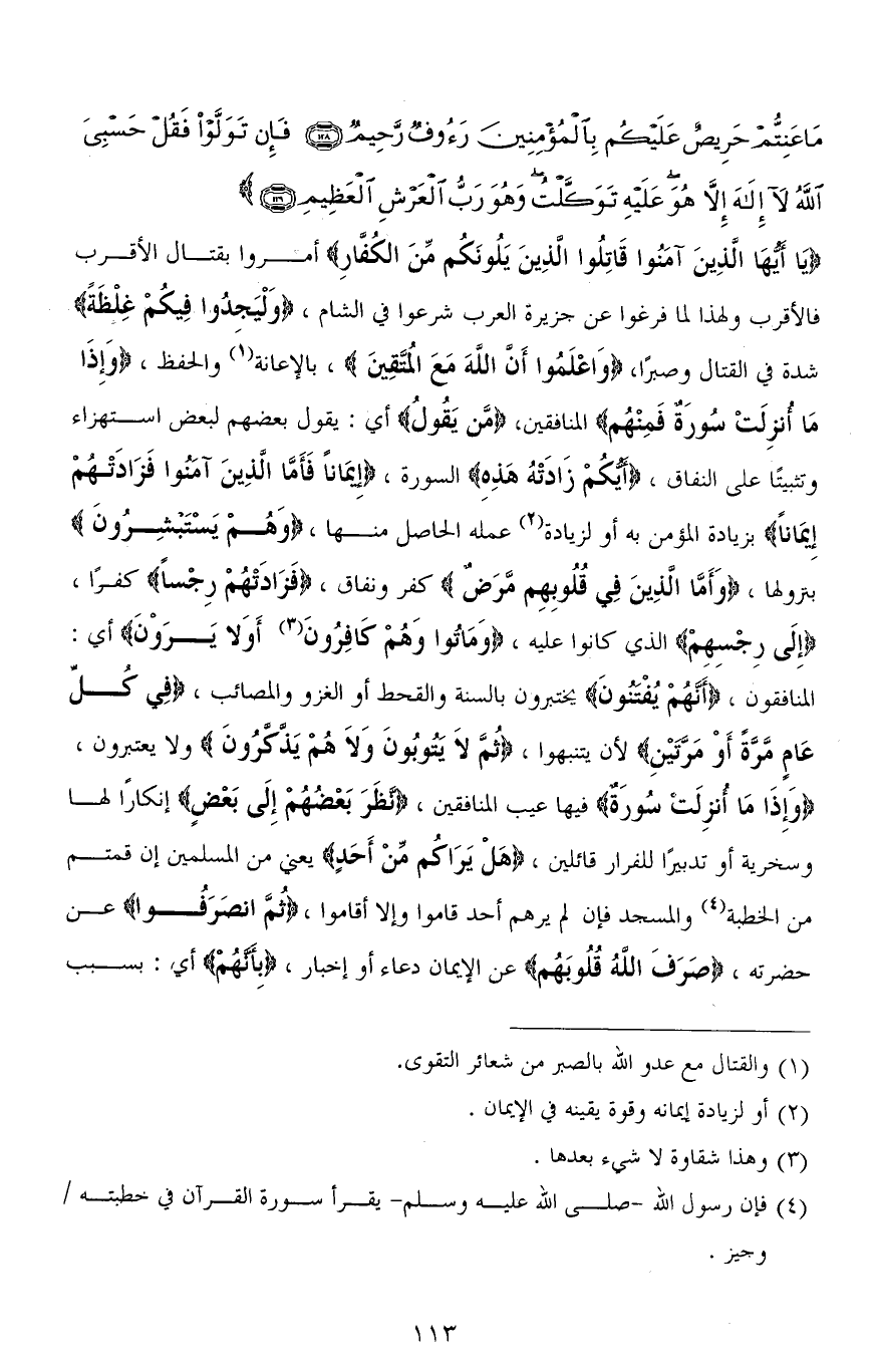 (يَا أَيُّهَا الَّذِينَ آمَنُوا قَاتِلُوا الَّذِينَ يَلُونَكُمْ مِنَ الْكُفَّارِ) أمروا بقتال الأقرب فالأقرب ولهذا لما فرغوا عن جزيرة العرب شرعوا في الشام، (وَلْيَجِدُوا فِيكُمْ غِلْظَةً) شدة في القتال وصبرًا، (وَاعْلَموا أَنْ الله مَع المتَّقِينَ)، بالإعانة والحفظ، (وَإِذَا مَا أُنْزِلَتْ سُورَةٌ فَمِنْهُمْ) المنافقين، (مَّن يَقول) أي: يقول بعضهم لبعض استهزاء وتثبيتًا على النفاق، (أَيُّكُمْ زَادَتْهُ هَذِهِ) السورة، (إِيمَانًا فَأَمَّا الَّذِينَ آمَنُوا فَزَادَتْهُمْ إِيمَانًا) بزيادة المؤمن به أو لزيادة عمله الحاصل منها، (وَهُمْ يَسْتَبْشِرُونَ) بنزولها، (وَأَمَّا الَّذِينَ فِي قُلُوبِهِمْ مَرَضٌ) كفر ونفاق، (فَزَادَتْهُمْ رِجْسًا) كفرًا، (إِلَى رِجْسِهِمْ) الذي كانوا عليه، (وَمَاتُوا وَهُمْ كَافِرُونَ (125) أَوَلَا يَرَوْنَ) أي: المنافقون، (أَنَّهُمْ يُفْتَنُونَ) يختبرون بالسَّنَة والقحط أو الغزو والمصائب، (فِي كُلِّ عَامٍ مَرَّةً أَوْ مَرَّتَيْنِ) لأن يتنبهوا، (ثُمَّ لَا يَتُوبُونَ وَلَا هُمْ يَذَّكَّرُونَ) ولا يعتبرون، (وَإِذَا مَا أُنْزِلَتْ سُورَةٌ) فيها عيب المنافقين، (نَظَرَ بَعْضُهُمْ إِلَى بَعْضٍ) إنكارًا لها وسخرية أو تدبيرًا للفرار قائلين، (هَلْ يَرَاكُمْ مِنْ أَحَدٍ) يعني من المسلمين إن قمتم من الخطبة والمسجد فإن لم يرهم أحد قاموا وإلا أقاموا، (ثُمَّ انْصَرَفُوا) عن حضرته، (صَرَفَ اللهُ قُلُوبَهُمْ) عن الإيمان دعاء أو إخبار، (بِأَنَّهُمْ) أي: بسبب