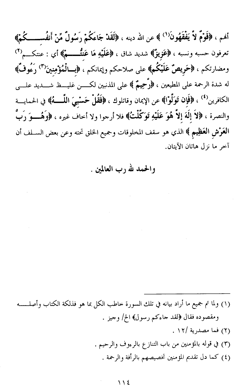 أنهم، (قَوْمٌ لَا يَفْقَهُونَ) عن الله دينه، (لَقَدْ جَاءَكُمْ رَسُولٌ مِنْ أَنْفُسِكُمْ) تعرفون حسبه ونسبه، (عَزِيزٌ) شديد شاق، (عَلَيْهِ مَا عَنِتُّمْ) أي: عنتكم ومضارتكم، (حَرِيصٌ عَلَيْكُم) على صلاحكم وإيمانكم، (بِالْمُؤْمِنِينَ رَءُوفٌ) له شدة الرحمة على المطيعين، (رَحِيمٌ) على المذنبين لكن غليظ شديد على الكافرين، (فَإِنْ تَوَلَّوْا) عن الإيمان وقاتلوك، (فَقُلْ حَسْبِيَ اللهُ) في الحماية والنصرة، (لَا إِلَهَ إِلَّا هُوَ عَلَيْهِ تَوَكَّلْتُ) فلا أرجوا ولا أخاف غيره، (وَهُوَ رَبُّ الْعَرْشِ الْعَظِيمِ) الذي هو سقف المخلوقات وجميع الخلق تحته وعن بعض السلف أن آخر ما نزل هاتان الآيتان.