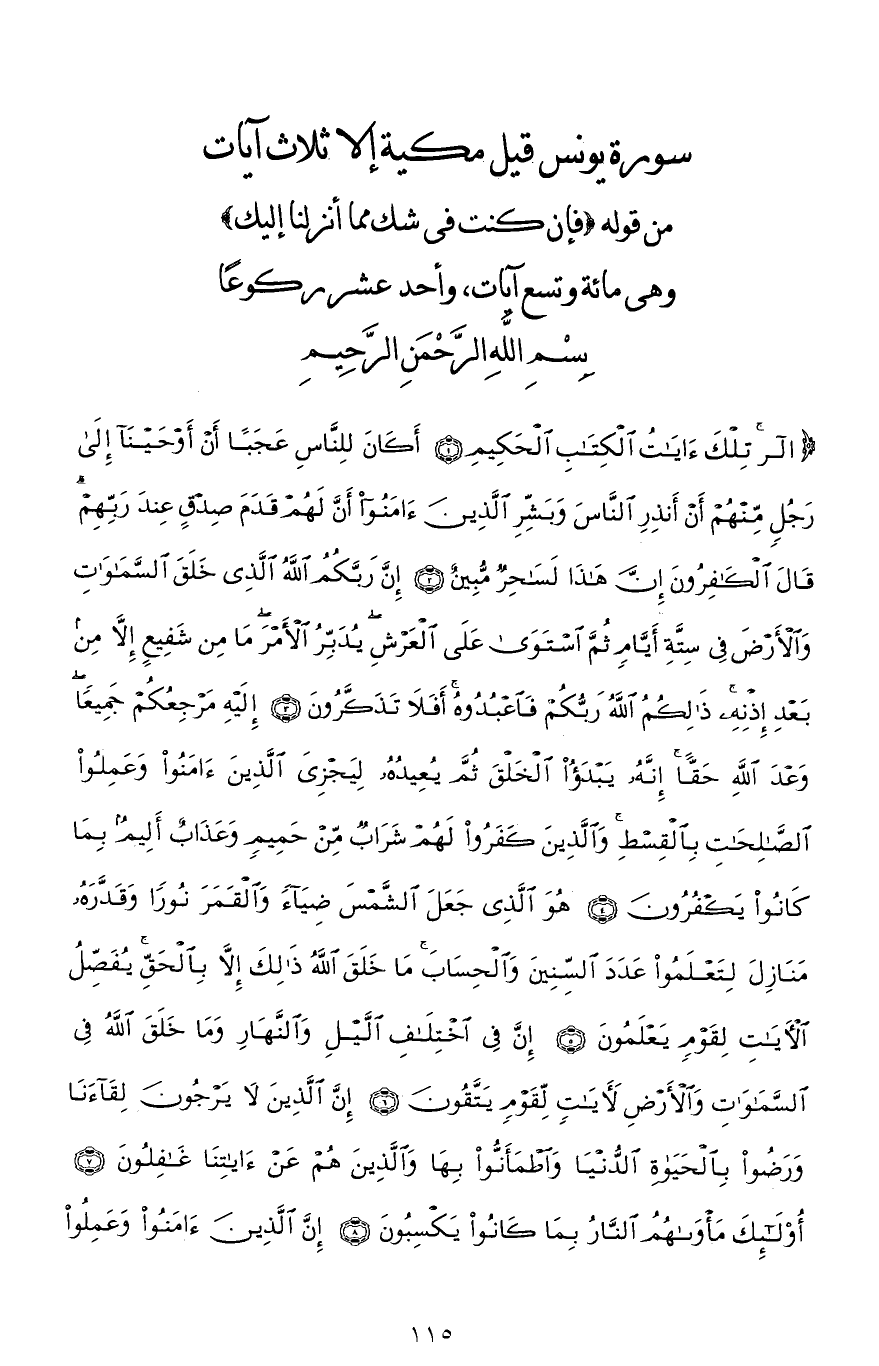 (الر تِلْكَ آيَاتُ الْكِتَابِ الْحَكِيمِ (1) أَكَانَ لِلنَّاسِ عَجَبًا أَنْ أَوْحَيْنَا إِلَى رَجُلٍ مِنْهُمْ أَنْ أَنْذِرِ النَّاسَ وَبَشِّرِ الَّذِينَ آمَنُوا أَنَّ لَهُمْ قَدَمَ صِدْقٍ عِنْدَ رَبِّهِمْ قَالَ الْكَافِرُونَ إِنَّ هَذَا لَسَاحِرٌ مُبِينٌ (2) إِنَّ رَبَّكُمُ اللهُ الَّذِي خَلَقَ السَّمَاوَاتِ وَالْأَرْضَ فِي سِتَّةِ أَيَّامٍ ثُمَّ اسْتَوَى عَلَى الْعَرْشِ يُدَبِّرُ الْأَمْرَ مَا مِنْ شَفِيعٍ إِلَّا مِنْ بَعْدِ إِذْنِهِ ذَلِكُمُ اللهُ رَبُّكُمْ فَاعْبُدُوهُ أَفَلَا تَذَكَّرُونَ (3) إِلَيْهِ مَرْجِعُكُمْ جَمِيعًا وَعْدَ اللهِ حَقًّا إِنَّهُ يَبْدَأُ الْخَلْقَ ثُمَّ يُعِيدُهُ لِيَجْزِيَ الَّذِينَ آمَنُوا وَعَمِلُوا الصَّالِحَاتِ بِالْقِسْطِ وَالَّذِينَ كَفَرُوا لَهُمْ شَرَابٌ مِنْ حَمِيمٍ وَعَذَابٌ أَلِيمٌ بِمَا كَانُوا يَكْفُرُونَ (4) هُوَ الَّذِي جَعَلَ الشَّمْسَ ضِيَاءً وَالْقَمَرَ نُورًا وَقَدَّرَهُ مَنَازِلَ لِتَعْلَمُوا عَدَدَ السِّنِينَ وَالْحِسَابَ مَا خَلَقَ اللهُ ذَلِكَ إِلَّا بِالْحَقِّ يُفَصِّلُ الْآيَاتِ لِقَوْمٍ يَعْلَمُونَ (5) إِنَّ فِي اخْتِلَافِ اللَّيْلِ وَالنَّهَارِ وَمَا خَلَقَ اللهُ فِي السَّمَاوَاتِ وَالْأَرْضِ لَآيَاتٍ لِقَوْمٍ يَتَّقُونَ (6) إِنَّ الَّذِينَ لَا يَرْجُونَ لِقَاءَنَا وَرَضُوا بِالْحَيَاةِ الدُّنْيَا وَاطْمَأَنُّوا بِهَا وَالَّذِينَ هُمْ عَنْ آيَاتِنَا غَافِلُونَ (7) أُولَئِكَ مَأْوَاهُمُ النَّارُ بِمَا كَانُوا يَكْسِبُونَ (8) إِنَّ الَّذِينَ آمَنُوا وَعَمِلُوا