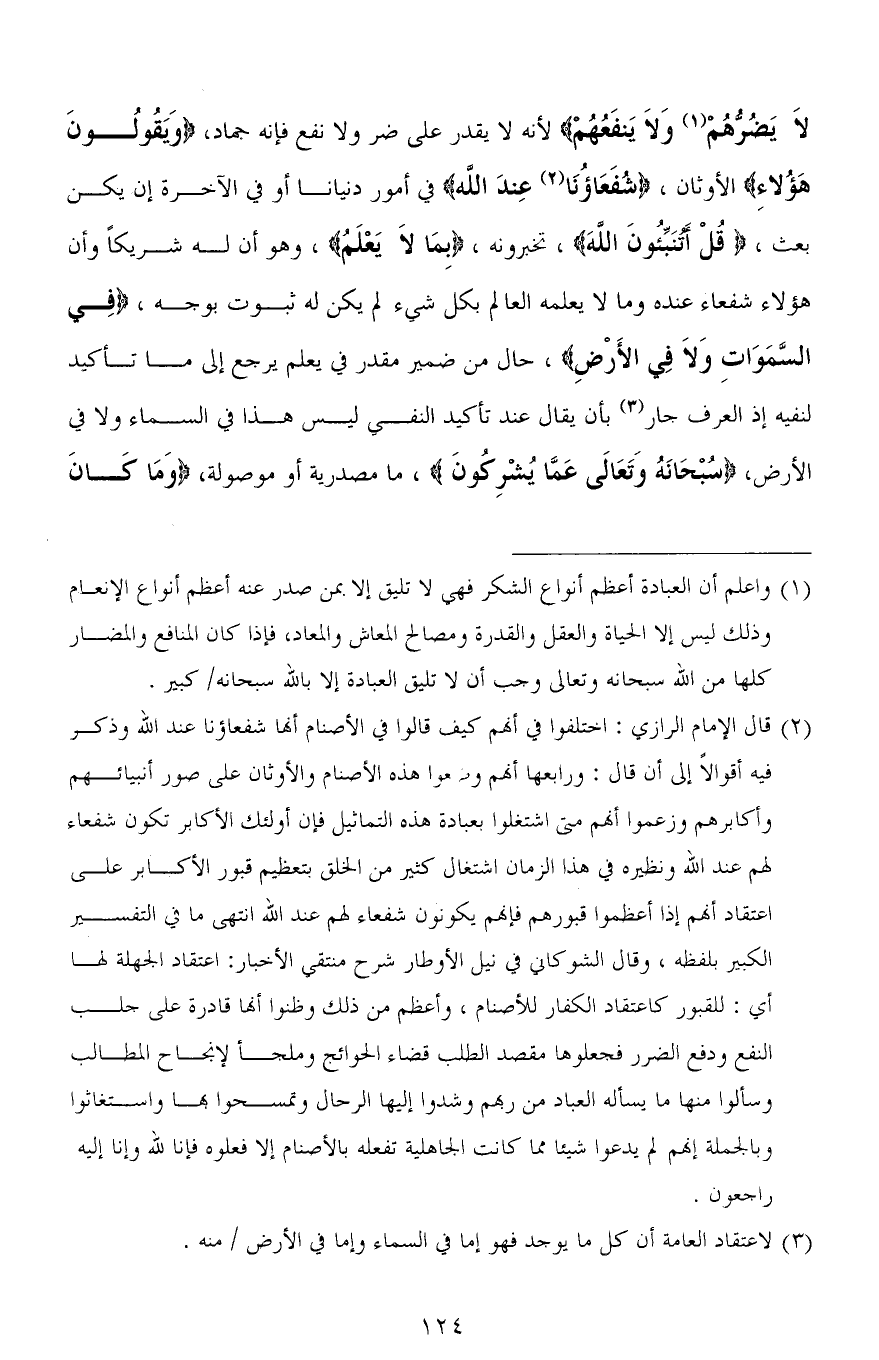 لَا يَضُرُّهُمْ وَلَا يَنْفَعُهُمْ) لأنه لا يقدر على ضر ولا نفع فإنه جماد، (وَيَقُولُونَ هَؤُلاءِ) الأوثان، (شُفَعَاؤُنَا عِنْدَ اللهِ) في أمور دنيانا أو في الآخرة إن يكن بعث، (قُلْ أَتُنَبِّئُونَ اللهَ)، تخبرونه، (بِمَا لَا يَعْلَمُ)، وهو أن له شريكًا وأن هؤلاء شفعاء عنده وما لا يعلمه العالم بكل شيء لم يكن له ثبوت بوجه، (فِي السَّمَاوَاتِ وَلَا فِي الْأَرْضِ)، حال من ضمير مقدر في يعلم يرجع إلى ما تأكيد لنفيه إذ العرف جار بأن يقال عند تأكيد النفي ليس هذا في السماء ولا في الأرض، (سُبْحَانَهُ وَتَعَالَى عَمَّا يُشْرِكُونَ)، ما مصدرية أو موصولة، (وَمَا كَانَ
