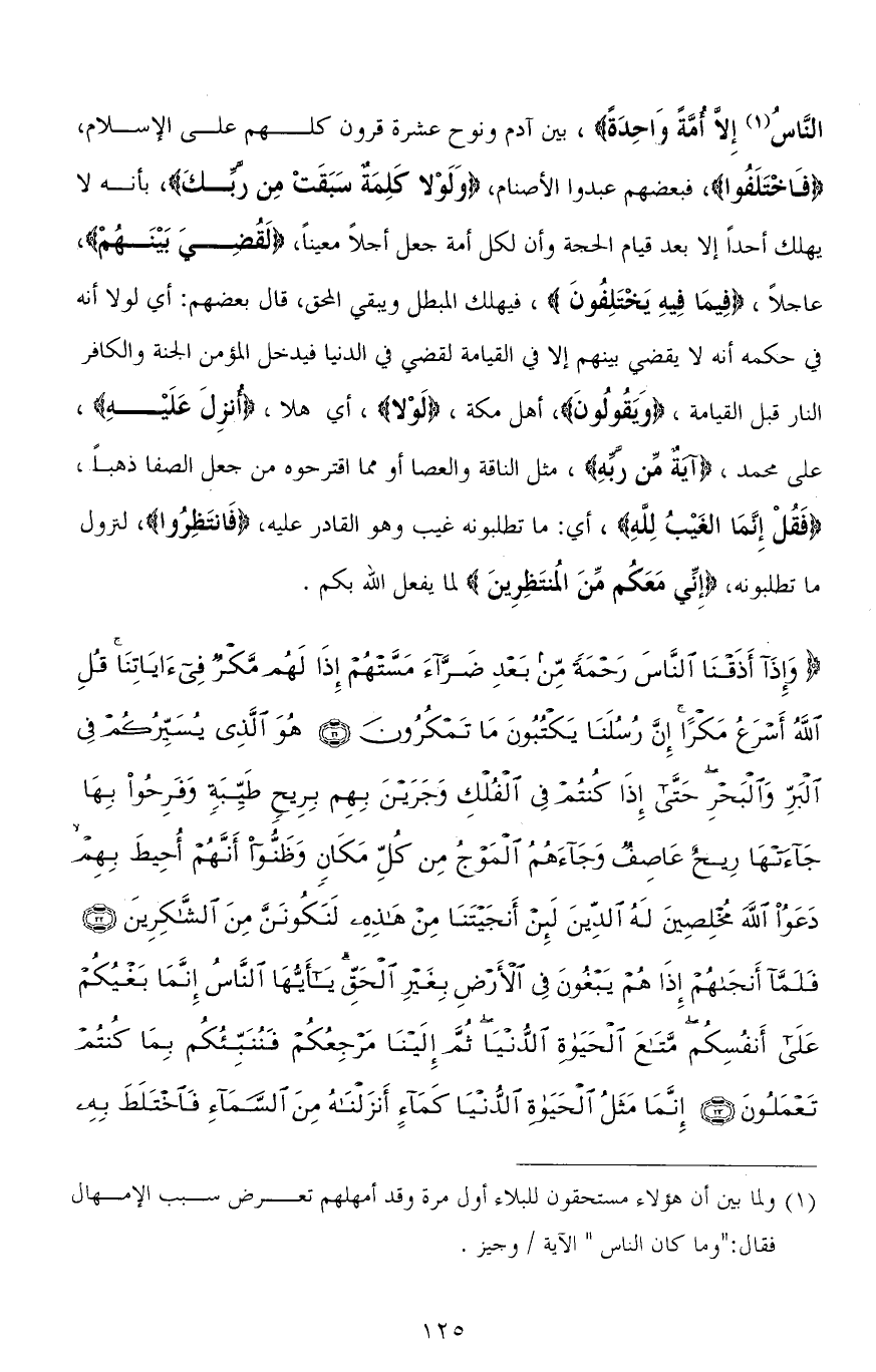 النَّاسُ إِلَّا أُمَّةً وَاحِدَةً)، بين آدم ونوح عشرة قرون كلهم على الإسلام، (فَاخْتَلَفُوا)، فبعضهم عبدوا الأصنام، (وَلَوْلا كَلِمَةٌ سَبَقَتْ مِنْ رَبِّكَ)، بأنه لا يهلك أحدًا إلا بعد قيام الحجة وأن لكل أمة جعل أجلاً معينًا، (لَقُضِيَ بَيْنَهُمْ)، عاجلاً، (فِيمَا فِيهِ يَخْتَلِفُونَ)، فيهلك المبطل ويبقي المحق، قال بعضهم: أي لولا أنه في حكمه أنه لا يقضي بينهم إلا في القيامة لقضى في الدنيا فيدخل المؤمن الجنة والكافر النار قبل القيامة، (وَيَقُولُونَ)، أهل مكة، (لَوْلا)، أي هلا، (أُنْزِلَ عَلَيْهِ)، على محمد، (آيَةٌ مِنْ رَبِّهِ)، مثل الناقة والعصا أو مما اقترحوه من جعل الصفا ذهبًا، (فَقُلْ إِنَّمَا الغَيْبُ لله)، أي: ما تطلبونه غيب وهو القادر عليه، (فَانتَظِرُوا)، لنزول ما تطلبونه، (إِنِّي مَعَكُم مِّنَ الُمنتَظِرِينَ) لما يفعل الله بكم.