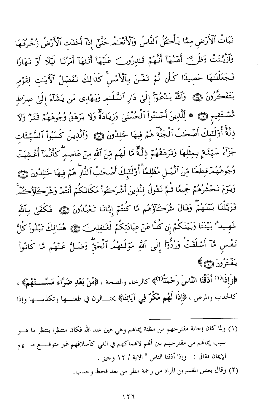 نَبَاتُ الْأَرْضِ مِمَّا يَأْكُلُ النَّاسُ وَالْأَنْعَامُ حَتَّى إِذَا أَخَذَتِ الْأَرْضُ زُخْرُفَهَا وَازَّيَّنَتْ وَظَنَّ أَهْلُهَا أَنَّهُمْ قَادِرُونَ عَلَيْهَا أَتَاهَا أَمْرُنَا لَيْلًا أَوْ نَهَارًا فَجَعَلْنَاهَا حَصِيدًا كَأَنْ لَمْ تَغْنَ بِالْأَمْسِ كَذَلِكَ نُفَصِّلُ الْآيَاتِ لِقَوْمٍ يَتَفَكَّرُونَ (24) وَاللهُ يَدْعُو إِلَى دَارِ السَّلَامِ وَيَهْدِي مَنْ يَشَاءُ إِلَى صِرَاطٍ مُسْتَقِيمٍ (25) لِلَّذِينَ أَحْسَنُوا الْحُسْنَى وَزِيَادَةٌ وَلَا يَرْهَقُ وُجُوهَهُمْ قَتَرٌ وَلَا ذِلَّةٌ أُولَئِكَ أَصْحَابُ الْجَنَّةِ هُمْ فِيهَا خَالِدُونَ (26) وَالَّذِينَ كَسَبُوا السَّيِّئَاتِ جَزَاءُ سَيِّئَةٍ بِمِثْلِهَا وَتَرْهَقُهُمْ ذِلَّةٌ مَا لَهُمْ مِنَ اللهِ مِنْ عَاصِمٍ كَأَنَّمَا أُغْشِيَتْ وُجُوهُهُمْ قِطَعًا مِنَ اللَّيْلِ مُظْلِمًا أُولَئِكَ أَصْحَابُ النَّارِ هُمْ فِيهَا خَالِدُونَ (27) وَيَوْمَ نَحْشُرُهُمْ جَمِيعًا ثُمَّ نَقُولُ لِلَّذِينَ أَشْرَكُوا مَكَانَكُمْ أَنْتُمْ وَشُرَكَاؤُكُمْ فَزَيَّلْنَا بَيْنَهُمْ وَقَالَ شُرَكَاؤُهُمْ مَا كُنْتُمْ إِيَّانَا تَعْبُدُونَ (28) فَكَفَى بِاللهِ شَهِيدًا بَيْنَنَا وَبَيْنَكُمْ إِنْ كُنَّا عَنْ عِبَادَتِكُمْ لَغَافِلِينَ (29) هُنَالِكَ تَبْلُو كُلُّ نَفْسٍ مَا أَسْلَفَتْ وَرُدُّوا إِلَى اللهِ مَوْلَاهُمُ الْحَقِّ وَضَلَّ عَنْهُمْ مَا كَانُوا يَفْتَرُونَ (30)