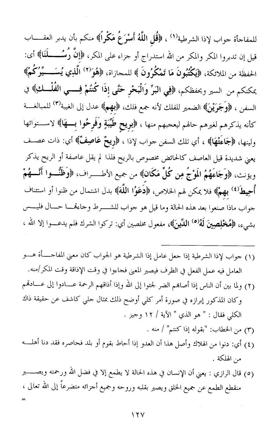للمفاجأة جواب لـ إذا الشرطية، (قُلِ اللهُ أَسْرَعُ مَكْرًا) منكم بأن يدبر العقاب قيل إن تدبروا المكر والمكر من الله استدراج أو جزاء على المكر، (إِنَّ رُسُلَنَا) أي: الحفظة من الملائكة، (يَكْتُبُونَ مَا تَمْكُرُونَ) للمجازاة، (هُوَ الَّذِي يُسَيِّرُكُمْ) يمكنكم من السير ويحفظكم، (فِي البَرِّ وَالْبَحْرِ حَتَّى إِذَا كُنتُمْ فِي الفُلْكِ) في السفن، (وَجَرَيْنَ) الضمير للفلك لأنه جمع فلك، (بِهِم) عدل إلى الغيبة للمبالغة كأنه يذكرهم لغيرهم حالهم ليعجبهم منها، (بِرِيحٍ طَيِّبَةٍ وَفَرِحُوا بِهَا) لاستوائها ولينها، (جَاءَتْهَا)، أي تلك السفن جواب لـ إذا، (رِيحٌ عَاصِفٌ) أي: ذات عصف يعني شديدة قيل العاصف كالحائض مخصوص بالريح فلذا لم يقل عاصفة أو الريح يذكر ويؤنث، (وَجَاءَهُمُ الْمَوْجُ مِنْ كُلِّ مَكَانٍ) من جميع الأطراف، (وَظَنُّوا أَنَّهُمْ أُحِيطَ بِهِمْ) فلا يمكن لهم الخلاص، (دَعَوُا اللهَ) بدل اشتمال من ظنوا أو استئناف جواب ماذا صنعوا بعد هذه الحالة وما قيل هو جواب للشرط وجاءتها حال فليس بشيء، (مُخْلِصِينَ لَهُ الدِّينَ)، مفعول مخلصين أي: تركوا الشرك فلم يدعوا إلا الله،
