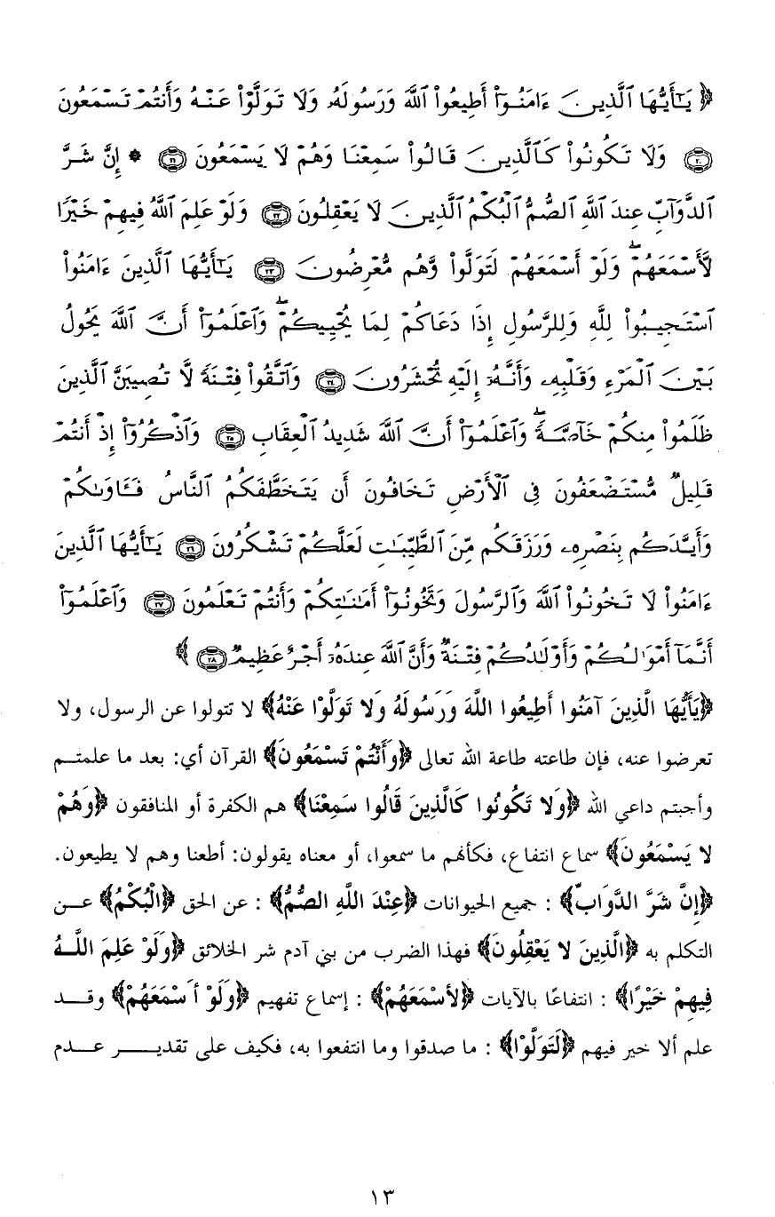 (يَا أَيُّهَا الَّذِينَ آمَنُوا أَطِيعُوا اللهَ وَرَسُولَهُ وَلَا تَوَلَّوْا عَنْهُ وَأَنْتُمْ تَسْمَعُونَ (20) وَلَا تَكُونُوا كَالَّذِينَ قَالُوا سَمِعْنَا وَهُمْ لَا يَسْمَعُونَ (21) إِنَّ شَرَّ الدَّوَابِّ عِنْدَ اللهِ الصُّمُّ الْبُكْمُ الَّذِينَ لَا يَعْقِلُونَ (22) وَلَوْ عَلِمَ اللهُ فِيهِمْ خَيْرًا لَأَسْمَعَهُمْ وَلَوْ أَسْمَعَهُمْ لَتَوَلَّوْا وَهُمْ مُعْرِضُونَ (23) يَا أَيُّهَا الَّذِينَ آمَنُوا اسْتَجِيبُوا لله وَلِلرَّسُولِ إِذَا دَعَاكُمْ لِمَا يُحْيِيكُمْ وَاعْلَمُوا أَنَّ اللهَ يَحُولُ بَيْنَ الْمَرْءِ وَقَلْبِهِ وَأَنَّهُ إِلَيْهِ تُحْشَرُونَ (24) وَاتَّقُوا فِتْنَةً لَا تُصِيبَنَّ الَّذِينَ ظَلَمُوا مِنْكُمْ خَاصَّةً وَاعْلَمُوا أَنَّ اللهَ شَدِيدُ الْعِقَابِ (25) وَاذْكُرُوا إِذْ أَنْتُمْ قَلِيلٌ مُسْتَضْعَفُونَ فِي الْأَرْضِ تَخَافُونَ أَنْ يَتَخَطَّفَكُمُ النَّاسُ فَآوَاكُمْ وَأَيَّدَكُمْ بِنَصْرِهِ وَرَزَقَكُمْ مِنَ الطَّيِّبَاتِ لَعَلَّكُمْ تَشْكُرُونَ (26) يَا أَيُّهَا الَّذِينَ آمَنُوا لَا تَخُونُوا اللهَ وَالرَّسُولَ وَتَخُونُوا أَمَانَاتِكُمْ وَأَنْتُمْ تَعْلَمُونَ (27) وَاعْلَمُوا أَنَّمَا أَمْوَالُكُمْ وَأَوْلَادُكُمْ فِتْنَةٌ وَأَنَّ اللهَ عِنْدَهُ أَجْرٌ عَظِيمٌ (28)