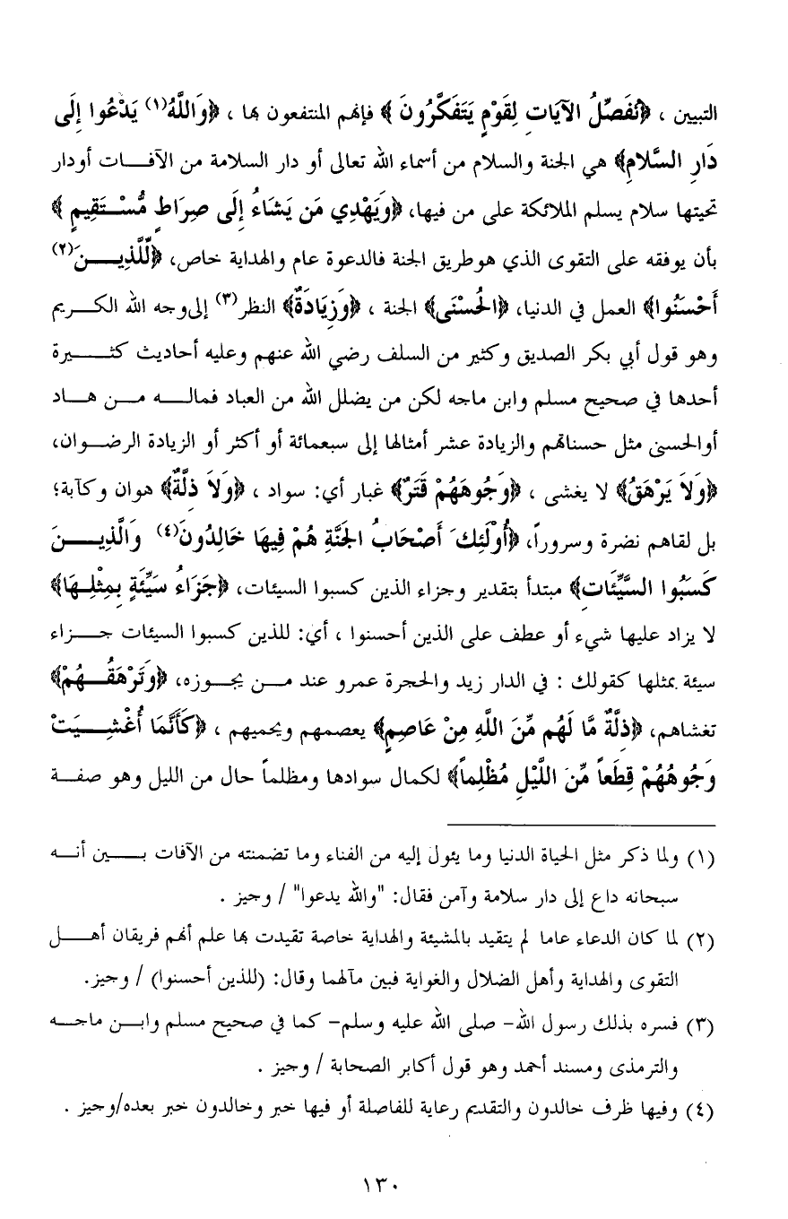 التبيين، (نُفَصِّلُ الْآيَاتِ لِقَوْمٍ يَتَفَكرُونَ) فإنهم المنتفعون بها، (وَاللهُ يَدْعُوا إِلَى دَارِ السلامِ) هي الجنة والسلام من أسماء الله تعالى أو دار السلامة من الآفات أو دار تحيتها سلام يسلم الملائكة على من فيها، (وَيَهْدِي مَن يَشَاءُ إِلَى صِرَاط مُّسْتَقِيمٍ) بأن يوفقه على التقوى الذي هو طريق الجنة فالدعوة عام والهداية خاص، (لِلَّذِينَ أَحْسَنُوا) العمل في الدنيا، (الْحُسْنَى) الجنة، (وَزِيَادَةٌ) النظر إلى وجه الله الكريم وهو قول أبي بكر الصديق وكثير من السلف رضي الله عنهم وعليه أحاديث كثيرة أحدها في صحيح مسلم وابن ماجه لكن من يضلل الله من العباد فما له من هاد أو الْحُسْنَى مثل حسناتهم والزيادة عشر أمثالها إلى سبعمائة أو أكثر أو الزيادة الرضوان، (وَلاَ يَرْهَقُ) لا يغشى، (وَجُوهَهُمْ قتَرٌ) غبار أي: سواد، (وَلاَ ذِلةٌ) هوان وكآبة؛ بل لقاهم نضرة وسرورًا، (أُولَئِكَ أَصْحَابُ الْجَنَّةِ هُمْ فِيهَا خَالِدُونَ (26) وَالَّذِينَ كَسَبُوا السَّيِّئَاتِ) مبتدأ بتقدير وجزاء الذين كسبوا السيئات، (جَزَاءُ سَيِّئَةٍ بِمِثْلِهَا) لا يزاد عليها شيء أو عطف على الذين أحسنوا، أي: للذين كسبوا السيئات جزاء سيئة بمثلها كقولك: في الدار زيد والحجرة عمرو عند من يجوزه، (وَتَرْهَقُهُمْ) تغشاهم، (ذِلَّةٌ ما لَهُم مِّنَ اللهِ مِنْ عَاصِمٍ) يعصمهم ويحميهم، (كَأَنَّمَا أُغْشِيَتْ وُجُوهُهُمْ قِطَعًا مِنَ اللَّيْلِ مُظْلِمًا) لكمال سوادها ومظلمًا حال من الليل وهو صفة