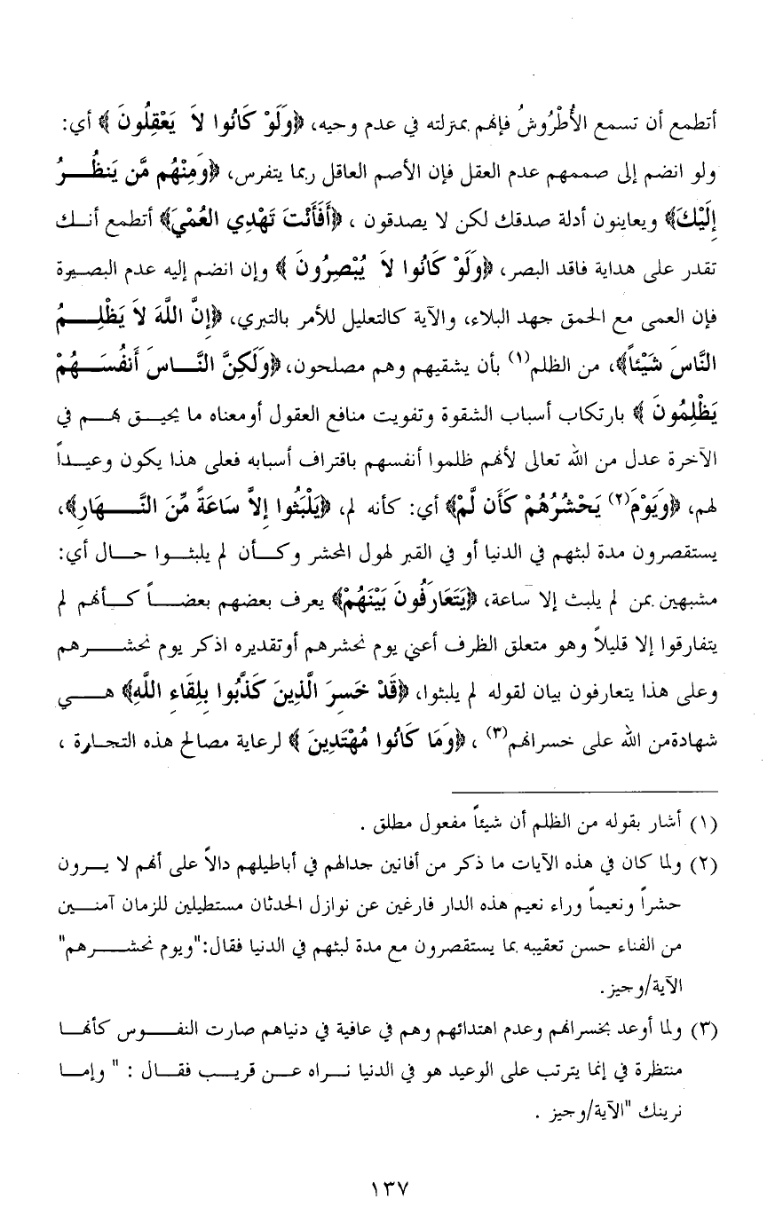 أتطمع أن تسمع الأُطْرُوشُ فإنهم بمنزلته في عدم وحيه، (وَلَوْ كَانُوا لاَ يَعْقِلُون) أي: ولو انضم إلى صممهم عدم العقل فإن الأصم العاقل ربما يتفرس، (وَمِنْهُم مَّن يَنظُرُ إِلَيْكَ) ويعاينون أدلة صدقك لكن لا يصدقون، (أَفَأَنْتَ تَهْدِي الْعُمْيَ) أتطمع أنك تقدر على هداية فاقد البصر، (وَلَوْ كَانُوا لاَ يُبْصِرُونَ) وإن انضم إليه عدم البصيرة فإن العمى مع الحمق جهد البلاء، والآية كالتعليل للأمر بالتبري، (إِنَّ اللهَ لاَ يَظْلِمُ النَّاسَ شَيْئًا)، من الظلم بأن يشقيهم وهم مصلحون، (وَلَكِنَّ النَّاسَ أَنفسَهُمْ يَظْلِمُونَ) بارتكاب أسباب الشقوة وتفويت منافع العقول أو معناه ما يحيق بهم في الآخرة عدل من الله تعالى لأنَّهُم ظلموا أنفسهم باقتراف أسبابه فعلى هذا يكون وعيدًا لهم، (وَيَوْمَ يَحْشُرهُمْ كَأَن لَمْ) أي: كأنه لم، (يَلْبَثُوا إِلَّا سَاعَةً مِنَ النَّهَارِ)، يستقصرون مدة لبثهم في الدنيا أو في القبر لهول المحشر وكأن لم يلبثوا حال أي: مشبهين بمن لم يلبث إلا ساعة، (يَتَعَارَفُونَ بَيْنَهُمْ) يعرف بعضهم بعضًا كأنهم لم يتفارقوا إلا قليلاً وهو متعلق الظرف أعني يوم نحشرهم أو تقديره اذكر يوم نحشرهم وعلى هذا يتعارفون بيان لقوله لم يلبثوا، (قَدْ خَسِرَ الذِينَ كَذبوا بِلِقَاءِ اللهِ) هي شهادة من الله على خسرانهم، (وَمَا كَانوا مهْتَدِينَ) لرعاية مصالح هذه التجارة،