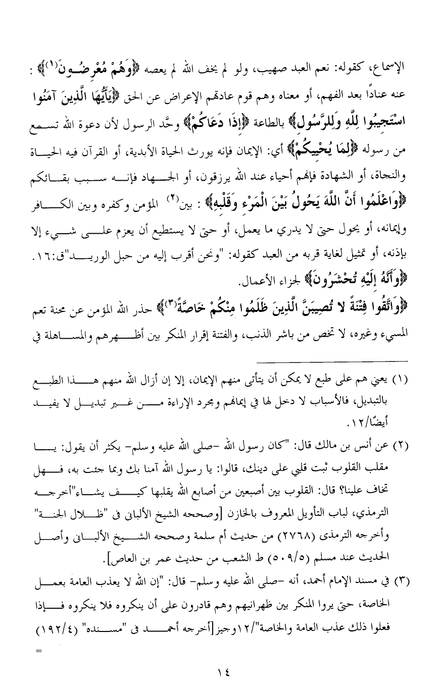 (وَاتَّقُوا فِتْنَةً لَا تُصِيبَنَّ الَّذِينَ ظَلَمُوا مِنْكُمْ خَاصَّةً) حذر الله المؤمن عن محنة تعم المسيء وغيره، لا تخص من باشر الذنب، والفتنة إقرار المنكر بين أظهرهم والمساهلة في