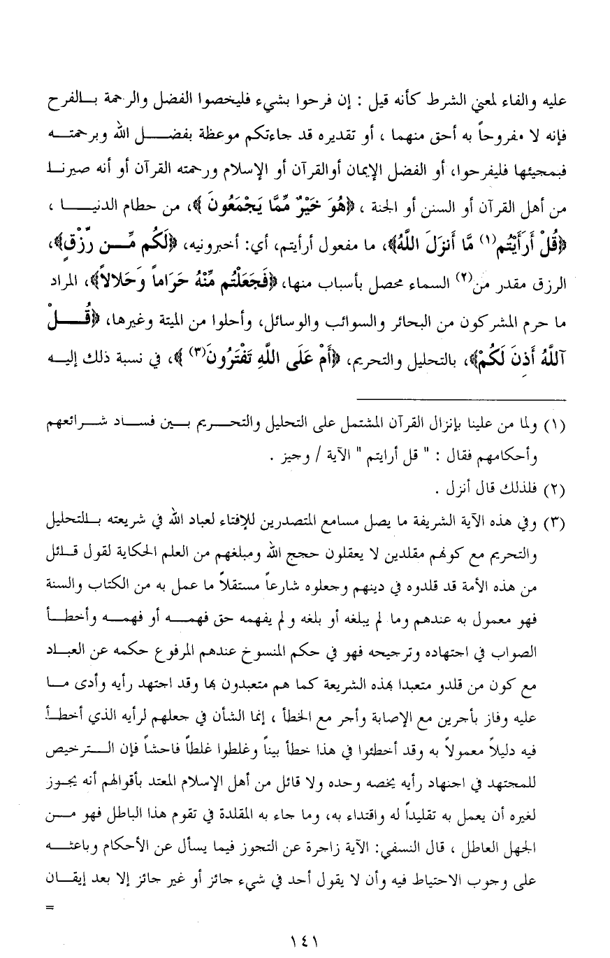 عليه والفاء لمعنى الشرط كأنه قيل: إن فرحوا بشيء فليخصوا الفضل والرحمة بالفرح فإنه لا مفروحاً به أحق منهما، أو تقديره قد جاءتكم موعظة بفضل الله وبرحمته فبمجيئها فليفرحوا، أو الفضل الإيمان أو القرآن أو الإسلام ورحمته القرآن أو أنه صيرنا من أهل القرآن أو السنن أو الجنة، (هُوَ خَيْرٌ مِمَّا يَجْمَعُونَ)، من حطام الدنيا، (قُلْ أَرَأَيتم مَّا أَنزَلَ اللهُ)، ما مفعول أرأيتم، أي: أخبرونيه، (لَكُمْ مِنْ رِزْقٍ)، الرزق مقدر من السماء محصل بأسباب منها، (فَجَعَلْتُمْ مِنْهُ حَرَامًا وَحَلَالًا)، المراد ما حرم المشركون من البحائر والسوائب [والوصائل] (1)، وأحلوا من الميتة وغيرها، (قُلْ آللهُ أَذِنَ لَكُمْ)، بالتحليل والتحريم، (أَمْ عَلَى اللهِ تَفْتَرُونَ)، في نسبة ذلك إليه
