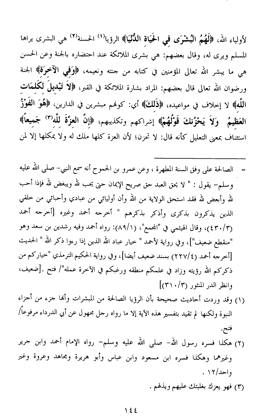 لأولياء الله، (لَهُمُ الْبُشْرَى فِي الْحَيَاةِ الدُّنْيَا) الرؤيا الحسنة هي البشرى يراها المسلم ويرى له، وقال بعضهم: هي بشرى الملائكة عند احتضاره بالجنة وعن الحسن هي ما يبشر الله تعالى المؤمنين في كتابه من جنته ونعيمه، (وَفِي الْآخِرَةِ) الجنة ورضوان الله تعالى قال بعضهم: المراد بشارة الملائكة في القبر، (لَا تَبْدِيلَ لِكَلِمَاتِ اللهِ) لا إخلاف في مواعيده، (ذَلِكَ) أي: كونهم مبشرين في الدارين، (ذَلِكَ هُوَ الْفَوْزُ الْعَظِيمُ (64) وَلَا يَحْزُنْكَ قَوْلُهُمْ) إشراكهم وتكذيبهم، (إِنَّ العِزَّةَ لله جَمِيعًا) استئناف بمعنى التعليل كأنه قال: لا تحزن؛ لأن العزة كلها ملك له ولا يمكلها إلا لمن