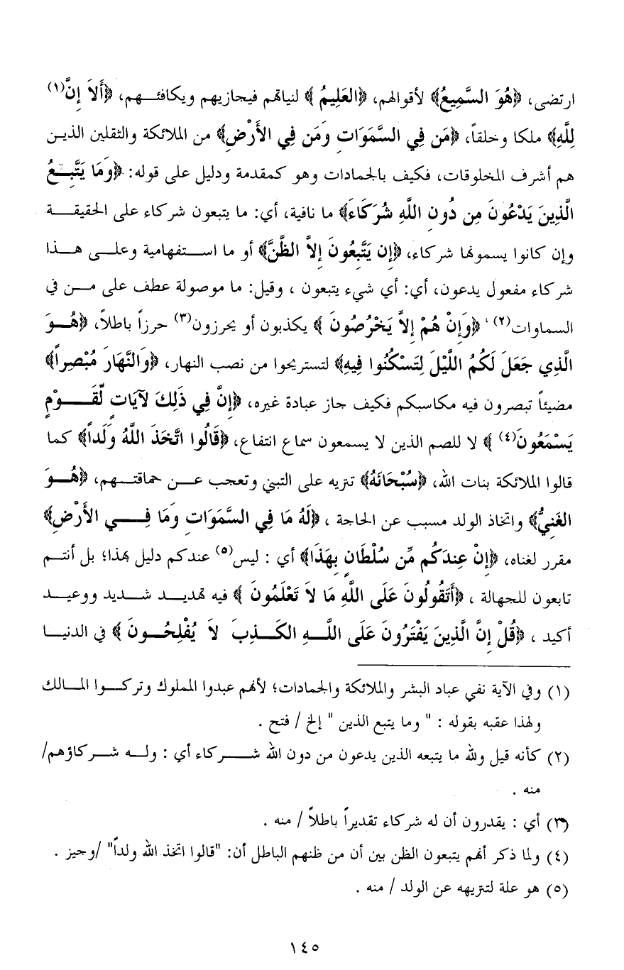 ارتضى، (هُوَ السمِيع) لأقوالهم، (العَلِيم) لنياتهم فيجازيهم ويكافئهم، (أَلاَ إِنَّ لله) ملكًا وخلقًا، (مَن فِي السَّمَاوَاتِ وَمَن فِي الأَرْضِ) من الملائكة والثقلين الذين هم أشرف المخلوقات، فكيف بالجمادات وهو كمقدمة ودليل على قوله: (وَمَا يَتَّبِعُ الَّذِينَ يَدْعُونَ مِنْ دُونِ اللهِ شُرَكَاءَ) ما نافية، أي: ما يتبعون شركاء على الحقيقة وإن كانوا يسمونها شركاء، (إِن يَتَّبِعون إِلا الظنَّ) أو ما استفهامية وعلى هذا شركاء مفعول يدعون، أي: أي شيء يتبعون، وقيل: ما موصولة عطف على من في السماوات (وَإِنْ هُمْ إِلَّا يَخْرُصُونَ) يكذبون أو يحرزون حرزًا باطلاً، (هُوَ الَّذِي جَعَلَ لَكُمُ اللَّيْلَ لِتَسْكُنُوا فِيهِ) لتستريحوا من نصب النهار، (وَالنَّهَارَ مُبْصِرًا) مضيئًا تبصرون فيه مكاسبكم فكيف جاز عبادة غيره، (إِنَّ فِي ذَلِكَ لَآيَاتٍ لِقَوْمٍ يَسْمَعُونَ) لا للصم الذين لا يسمعون سماع انتفاع، (قَالُوا اتَّخَذَ اللهُ وَلَدًا) كما قالوا الملائكة بنات الله، (سُبْحَانَهُ) تنزيه عن التبني وتعجب من حماقتهم، (هُوَ الْغَنِيُّ) واتخاذ الولد مسبب عن الحاجة، (لَه مَا فِي السَّمَاوَاتِ وَمَا فِي الأَرْضِ) مقرر لغناه، (إِنْ عِندَكُم مِّن سُلْطَانٍ بِهَذَا) أي: ليس عندكم دليل بهذا، بل أنتم تابعون للجهالة، (أَتَقُولُونَ عَلَى اللهِ مَا لَا تَعْلَمُونَ) فيه تهديد شديد ووعيد أكيد، (قُلْ إِنَّ الَّذِينَ يَفْتَرُونَ عَلَى اللهِ الْكَذِبَ لَا يُفْلِحُونَ) في الدنيا