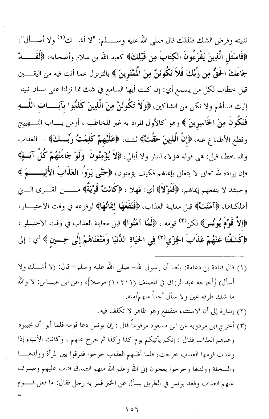 تثبيته وفرض الشك فلذلك قال صلى الله عليه وسلم: " لا أشكُّ ولا أسأل " (1)، (فَاسْأَلِ الَّذِينَ يَقْرَءُونَ الْكِتَابَ مِنْ قَبْلِكَ) كعبد الله بن سلام وأصحابه، (لَقَدْ جَاءَكَ الْحَقُّ مِنْ رَبِّكَ فَلَا تَكُونَنَّ مِنَ الْمُمْتَرِينَ) بالتزلزل عما أنت فيه ومن اليقين قيل خطاب لكل من يسمع أي: إن كنت أيها السامع في شك مما نزلنا على لسان نبينا إليك فسألهم ولا تكن من الشاكين، (وَلَا تَكُونَنَّ مِنَ الَّذِينَ كَذَّبُوا بِآيَاتِ اللهِ فَتَكُونَ مِنَ الْخَاسِرِينَ) وهو كالأول المراد به غير المخاطب، أو من باب التهييج وقطع الأطماع عنه، (إِنَّ الَّذِينَ حَقَّتْ) ثبتت، (عَلَيْهِمْ كَلِمَتُ رَبِّكَ) بالعذاب والسخط، قيل: هي قوله هؤلاء للنار ولا أبالي، (لَا يُؤْمِنُونَ (96) وَلَوْ جَاءَتْهُمْ كُلُّ آيَةٍ) فإن إرادة الله تعالى لا تتعلق بإيمانهم فكيف يؤمنون، (حَتَّى يَرَوُا العَذَابَ الأَلِيمَ) وحينئذ لا ينفعهم إيمانهم، (فَلَوْلاَ) أي: فهلا، (كَانت قَريَةٌ) من القرى التي أهلكناها، (آمَنَت) قبل معاينة العذاب، (فَنَفَعَهَا إِيمَانُهَا) لوقوعه في وقت الاختيار، (إِلَّا قَوْمَ يُونُسَ) لكن قومه، (لَمَّا آمنوا) قبل معاينة العذاب في وقت الاختيار، (كَشَفْنَا عَنْهُمْ عَذَابَ الْخِزْيِ فِي الْحَيَاةِ الدُّنْيَا وَمَتَّعْنَاهُمْ إِلَى حِينٍ) أي: إلى