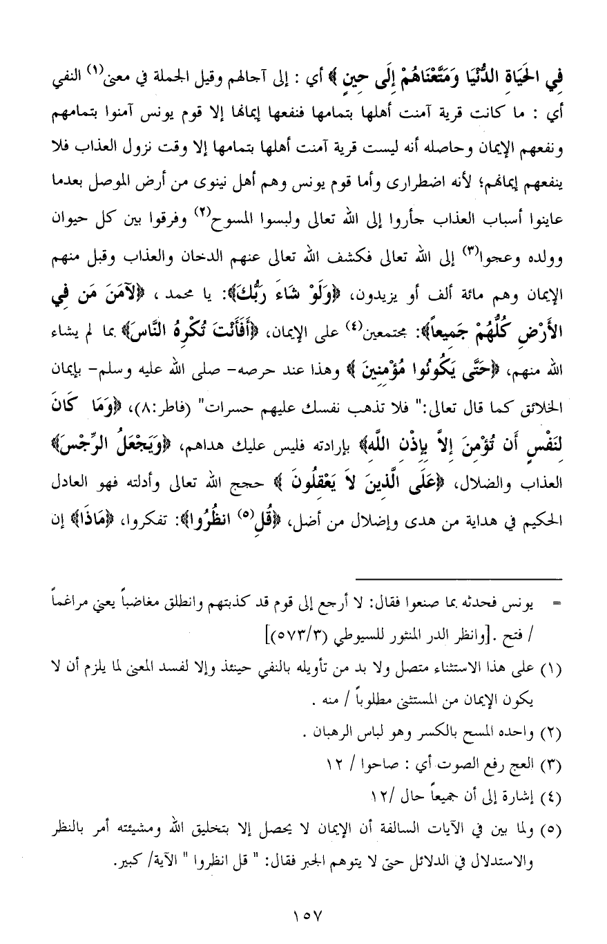 أي (1): إلى آجالهم وقيل الجملة في معنى النفي أى: ما كانت قرية آمنت أهلها بتمامها فَنَفَعَهَا إِيمَانُهَا إلا قوم يونس آمنوا بتمامهم ونفعهم الإيمان وحاصله أنه ليست قرية آمنت أهلها بتمامها إلا وقت نزول العذاب فلا ينفعهم إيمانهم؛ لأنه اضطراري وأما قوم يونس وهم أهل نينوى من أرض الموصل بعدما عاينوا أسباب العذاب جأروا إلى الله تعالى ولبسوا المسوح وفرقوا بين كل حيوان وولده وعجوا إلى الله تعالى فكشف الله تعالى عنهم الدخان والعذاب وقبِل منهم الإيمان وهم مائة ألف أو يزيدون، (وَلَوْ شَاءَ رَبُّكَ): يا محمد، (لَآمَنَ مَنْ فِي الْأَرْضِ كُلُّهُمْ جَمِيعًا): مجتمعين على الإيمان، (أَفَأَنْتَ تُكْرِهُ النَّاسَ) بما لم يشاء الله منهم، (حَتَّى يَكُونُوا مُؤْمِنِينَ) وهذا عند حرصه - صلى الله عليه وسلم - بإيمان الخلائق كما قال تعالى: (فَلَا تَذْهَبْ نَفْسُكَ عَلَيْهِمْ حَسَرَاتٍ) [فاطر: 8]، (وَمَا كَانَ لِنَفْسٍ أَنْ تُؤْمِنَ إِلَّا بِإِذْنِ اللهِ) بإرادته فليس عليك هداهم، (وَيَجْعَلُ الرِّجْسَ) العذاب والضلال، (عَلَى الذِينَ لاَ يَعْقِلُونَ) حجج الله تعالى وأدلته فهو العادل الحكيم في هداية من هدى وإضلال من أضل، (قلِ انظُروا): تفكروا، (مَاذَا) إن