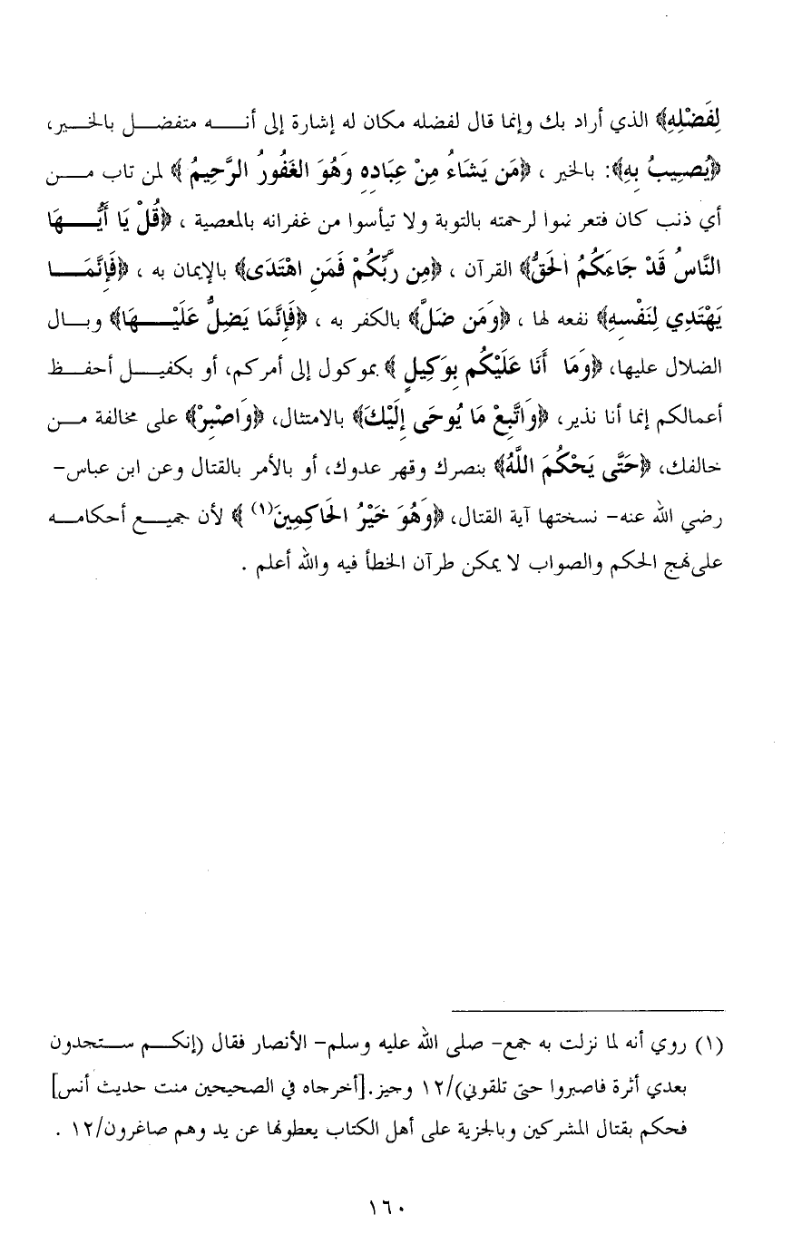 لِفَضْلِهِ) الذي أراد بك وإنما قال لفضله مكان له إشارة إلى أنه متفضل بالخير، (يُصِيبُ بِهِ): بالخير، (مَن يَشَاءُ مِنْ عِبَادِهِ وَهُوَ الغَفُورُ الرَّحِيمُ) لمن تاب من أي ذنب كان فتعرضوا لرحمته بالتوبة ولا تيأسوا من غفرانه بالمعصية، (قُلْ يَا أَيُّهَا النَّاسُ قَدْ جَاءَكُمُ الْحَقُّ) القرآن، (مِنْ رَبِّكُمْ فَمَنِ اهْتَدَى) بالإيمان به، (فَإِنَّمَا يَهْتَدِي لِنَفْسِهِ) نفعه لها، (وَمَنْ ضَلَّ) بالكفر به، (فَإِنَّمَا يَضِلُّ عَلَيْهَا) وبال الضلال عليها، (وَمَا أَنَا عَلَيْكُمْ بِوَكِيلٍ) بموكول إليَّ أمركم، أو بكفيل أحفظ أعمالكم إنما أنا نذير، (وَاتَّبِعْ مَا يُوحَى إِلَيْكَ) بالامتثال، (وَاصْبِرْ) على مخالفة من خالفك، (حَتَّى يَحْكُمَ اللهُ) بنصرك وقهر عدوك، أو بالأمر بالقتال وعن ابن عباس - رضي الله عنه - نسختها آية القتال، (وَهُوَ خَيْرُ الْحَاكِمِينَ) لأن جميع أحكامه على نهج الحكم والصواب لا يمكن طرآن الخطأ فيه. والله أعلم.