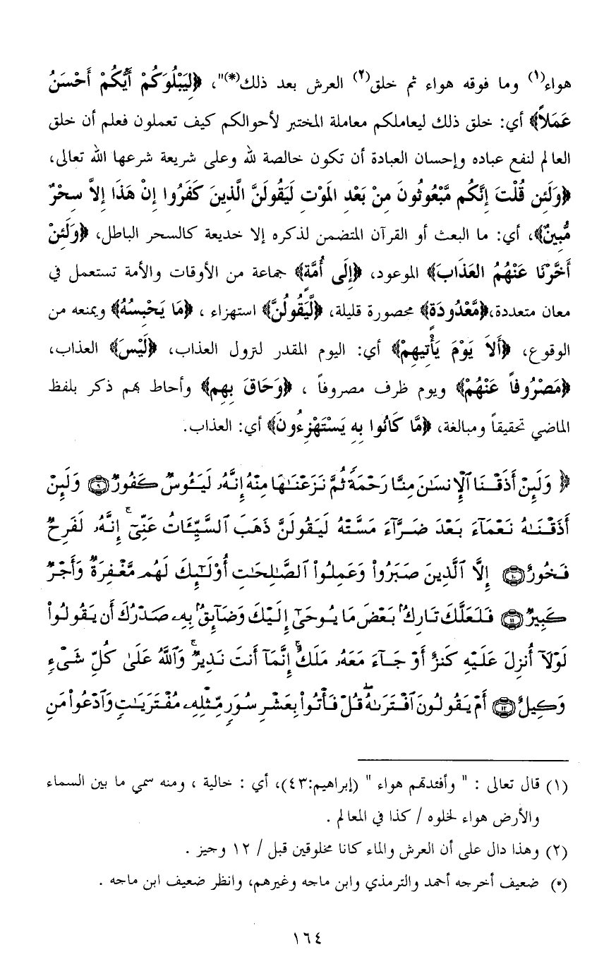 هواء وما فوقه هواء ثم خلق العرش بعد ذلك، (لِيَبْلُوَكُمْ أَيُّكُمْ أَحْسَنُ عَمَلًا) أي: خلق ذلك ليعاملكم معاملة المختبر لأحوالكم كيف تعملون فعلم أن خلق العالم لنفع عباده وإحسان العبادة أن تكون خالصة لله وعلى شريعة شرعها الله تعالى، (وَلَئِنْ قُلْتَ إِنَّكُمْ مَبْعُوثُونَ مِنْ بَعْدِ الْمَوْتِ لَيَقُولَنَّ الَّذِينَ كَفَرُوا إِنْ هَذَا إِلَّا سِحْرٌ مُبِينٌ)، أي: ما البعث أو القرآن المتضمن لذكره إلا خديعة كالسحر الباطل، (وَلَئِنْ أَخَّرْنَا عَنْهُمُ الْعَذَابَ) الموعود، (إِلَى أُمَّةٍ) جماعة من الأوقات والأمة تستعمل في معان متعددة، (مَعْدُودَةٍ) محصورة قليلة، (لَيَقُولُنَّ) استهزاء، (مَا يَحْبِسُهُ) ويمنعه من الوقوع، (أَلاَ يَوْمَ يَأتِيهِمْ) أي: اليوم المقدر لنزول العذاب، (لَيْسَ) العذاب، (مَصْرُوفًا عَنهُمْ) ويوم ظرف مصروفًا، (وَحَاقَ بِهِم) وأحاط بهم ذكر بلفظ الماضي تحقيقًا ومبالغة، (مَّا كَانوا بِهِ يَسْتَهْزِءُونَ) أي: العذاب.