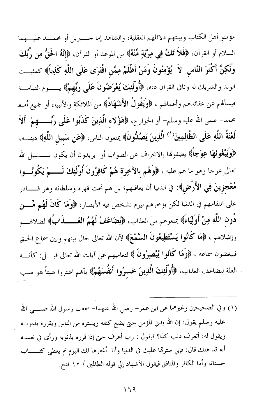 مؤمنو أهل الكتاب وبينتهم دلائلهم العقلية، والشاهد إما جبريل أو محمد عليهما السلام أو القرآن، (فَلاَ تَكُ فِي مِرْيَةٍ منْهُ) من الموعد أو القرآن، (إِنَّهُ الحَقُّ مِن ربكَ وَلَكِنَّ أَكْثَرَ النَّاسِ لاَ يُؤْمِنُونَ وَمَنْ أَظْلَمُ مِمَّنِ افْتَرَى عَلَى اللهِ كَذِبًا) كـ مثبت الولد والشريك له ونافي القرآن عنه، (أُولَئِكَ يُعْرَضُونَ عَلَى رَبِّهِمْ) يوم القيامة فيسألهم عن عقائدهم وأعمالهم، (وَيَقُولُ الْأَشْهَادُ) من الملائكة والأنبياء أو جميع أمة محمد - صلى الله عليه وسلم - أو الجوارح، (هَؤُلاءِ الًذِينَ كَذَبُوا عَلَى ربِّهِمْ أَلاَ لَعْنَةُ اللهِ عَلَى الظَّالِمِينَ الًذِينَ يَصُدُّونَ) يمنعون الناس، (عَن سَبِيلِ اللهِ) دينه، (وَيَبْغونَهَا عِوَجًا) يصفونها بالانحراف عن الصواب أو يريدون أن يكون سبيل الله تعالى عوجًا وهو ما هم عليه، (وَهُم بِالْآخِرَةِ هُمْ كَافرُونَ أُوْلَئِكَ لَمْ يَكُونوا مُعْجِزِينَ في الأَرْضِ): في الدنيا أن يعاقبهم، بل هم تحت قهره وسلطانه وهو قادر على [الانتقام منهم في الدنيا] لكن يؤخرهم ليوم تشخص فيه الأبصار، (وَمَا كَانَ لَهُمْ مِنْ دُونِ اللهِ مِنْ أَوْلِيَاءَ) يمنعوهم من العذاب، (يضَاعَفُ لَهُمُ العَذَابُ) لضلالهم وإضلالهم، (مَا كَانُوا يَسْتَطِيعُونَ السَّمْعَ) لأن الله تعالى حال بينهم وبين سماع الحق فيبغضون سماعه، (وَمَا كَانوا يُبْصِرُونَ) لتعاميهم عن آيات الله تعالى قيل: كأنه العلة لتضاعف العذاب، (أُوْلَئِكَ الًذِينَ خَسِرُوا أَنْفُسَهُمْ) بأنَّهم اشتروا شيئًا هو سبب