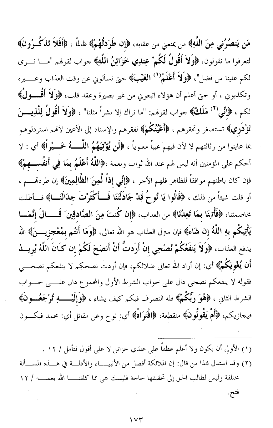 مَن يَنصُرُنِي مِنَ اللهِ) من يمنعني من عقابه، (إِن طَرَدتُّهُمْ) ظالمًا، (أَفَلاَ تَذَكرونَ) لتعرفوا ما تقولون، (وَلَا أَقُولُ لَكُمْ عِنْدِي خَزَائِنُ اللهِ) جواب لقولهم " ما نرى لكم علينا من فضل "، (وَلَا أَعْلَمُ الْغَيْبَ) حتى تسألوني عن وقت العذاب وغيره وتكذبوني، أو حتى أعلم أن هؤلاء اتبعوني من غير بصيرة وعقد قلب، (وَلاَ أَقُولُ) لكم، (إِني مَلَكٌ) جواب لقولهم: " ما نراك إلا بشرًا مثلنا "، (وَلَا أَقُولُ لِلَّذِينَ تَزْدَرِي) تستصغر وتحقرهم، (أَعْيُنُكُمْ) لفقرهم والإسناد إلى الأعين لأنَّهُم استرذلوهم بما عاينوا من رثاثتهم لا لأن فيهم عيبًا معنويًا، (لَن يُؤْتِيَهُمُ اللهُ خَيْرًا) أي: لا أحكم على المؤمنين أنه ليس لهم عند الله ثواب ونعمة، (اللهُ أَعْلَمُ بِمَا فِي أَنفُسِهِمْ) فإن كان باطنهم موافقًا للظاهر فلهم الأجر، (إِنِّي إِذًا لَمِنَ الظَّالِمِينَ) إن طردتهم، أو قلت شيئًا من ذلك، (قَالُوا يَا نُوحُ قَدْ جَادَلْتَنَا فَأَكْثَرْتَ جِدَالَنَا) فأطلت مخاصمتنا، (فَأْتِنَا بِمَا تَعِدُنَا) من العذاب، (إِنْ كُنْتَ مِنَ الصَّادِقِينَ (32) قَالَ إِنَّمَا يَأْتِيكُم بِهِ اللهُ إِن شَاءَ) فإن منزل العذاب هو الله تعالى، (وَمَا أَنتُم بِمُعْجِزِينَ) الله يدفع العذاب، (وَلَا يَنْفَعُكُمْ نُصْحِي إِنْ أَرَدْتُ أَنْ أَنْصَحَ لَكُمْ إِنْ كَانَ اللهُ يُرِيدُ أَنْ يُغْوِيَكُمْ) أي: إن أراد الله تعالى ضلالكم، فإن أردت نصحكم لا ينفعكم نصحي فقوله لا ينفعكم نصحي دال على جواب الشرط الأول والمجموع دال على جواب الشرط الثاني، (هُوَ رَبُّكُمْ) فله التصرف فيكم كيف يشاء، (وَإِلَيْهِ تُرْجَعُونَ) فيجازيكم، (أَمْ يَقُولُونَ) منقطعة، (افْتَرَاهُ) أي: نوح وعن مقاتل أي: محمد فيكون
