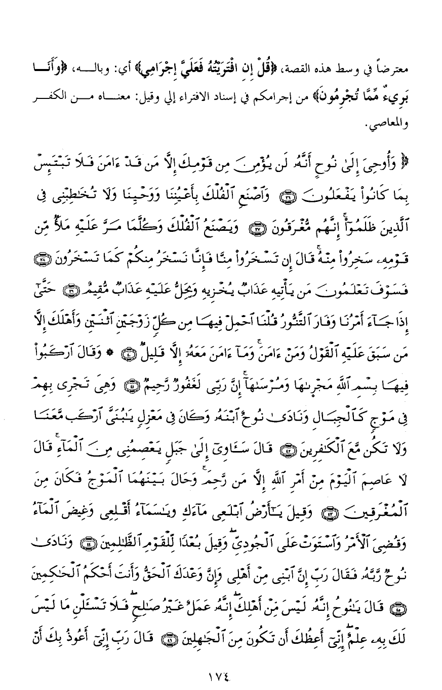 (وَأُوحِيَ إِلَى نُوحٍ أَنَّهُ لَنْ يُؤْمِنَ مِنْ قَوْمِكَ إِلَّا مَنْ قَدْ آمَنَ فَلَا تَبْتَئِسْ بِمَا كَانُوا يَفْعَلُونَ (36) وَاصْنَعِ الْفُلْكَ بِأَعْيُنِنَا وَوَحْيِنَا وَلَا تُخَاطِبْنِي فِي الَّذِينَ ظَلَمُوا إِنَّهُمْ مُغْرَقُونَ (37) وَيَصْنَعُ الْفُلْكَ وَكُلَّمَا مَرَّ عَلَيْهِ مَلَأٌ مِنْ قَوْمِهِ سَخِرُوا مِنْهُ قَالَ إِنْ تَسْخَرُوا مِنَّا فَإِنَّا نَسْخَرُ مِنْكُمْ كَمَا تَسْخَرُونَ (38) فَسَوْفَ تَعْلَمُونَ مَنْ يَأْتِيهِ عَذَابٌ يُخْزِيهِ وَيَحِلُّ عَلَيْهِ عَذَابٌ مُقِيمٌ (39) حَتَّى إِذَا جَاءَ أَمْرُنَا وَفَارَ التَّنُّورُ قُلْنَا احْمِلْ فِيهَا مِنْ كُلٍّ زَوْجَيْنِ اثْنَيْنِ وَأَهْلَكَ إِلَّا مَنْ سَبَقَ عَلَيْهِ الْقَوْلُ وَمَنْ آمَنَ وَمَا آمَنَ مَعَهُ إِلَّا قَلِيلٌ (40) وَقَالَ ارْكَبُوا فِيهَا بِسْمِ اللهِ مَجْرَاهَا وَمُرْسَاهَا إِنَّ رَبِّي لَغَفُورٌ رَحِيمٌ (41) وَهِيَ تَجْرِي بِهِمْ فِي مَوْجٍ كَالْجِبَالِ وَنَادَى نُوحٌ ابْنَهُ وَكَانَ فِي مَعْزِلٍ يَا بُنَيَّ ارْكَبْ مَعَنَا وَلَا تَكُنْ مَعَ الْكَافِرِينَ (42) قَالَ سَآوِي إِلَى جَبَلٍ يَعْصِمُنِي مِنَ الْمَاءِ قَالَ لَا عَاصِمَ الْيَوْمَ مِنْ أَمْرِ اللهِ إِلَّا مَنْ رَحِمَ وَحَالَ بَيْنَهُمَا الْمَوْجُ فَكَانَ مِنَ الْمُغْرَقِينَ (43) وَقِيلَ يَا أَرْضُ ابْلَعِي مَاءَكِ وَيَا سَمَاءُ أَقْلِعِي وَغِيضَ الْمَاءُ وَقُضِيَ الْأَمْرُ وَاسْتَوَتْ عَلَى الْجُودِيِّ وَقِيلَ بُعْدًا لِلْقَوْمِ الظَّالِمِينَ (44) وَنَادَى نُوحٌ رَبَّهُ فَقَالَ رَبِّ إِنَّ ابْنِي مِنْ أَهْلِي وَإِنَّ وَعْدَكَ الْحَقُّ وَأَنْتَ أَحْكَمُ الْحَاكِمِينَ (45) قَالَ يَا نُوحُ إِنَّهُ لَيْسَ مِنْ أَهْلِكَ إِنَّهُ عَمَلٌ غَيْرُ صَالِحٍ فَلَا تَسْأَلْنِ مَا لَيْسَ لَكَ بِهِ عِلْمٌ إِنِّي أَعِظُكَ أَنْ تَكُونَ مِنَ الْجَاهِلِينَ (46) قَالَ رَبِّ إِنِّي أَعُوذُ بِكَ أَنْ