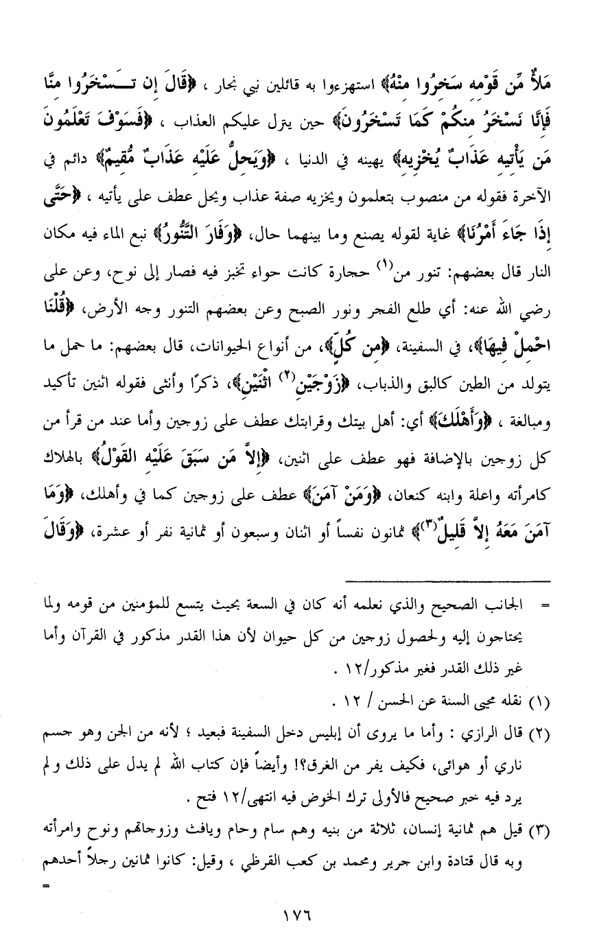 مَلَأٌ مِنْ قَوْمِهِ سَخِرُوا مِنْهُ) استهزءوا به قائلين نبي نجار، (قَالَ إِنْ تَسْخَرُوا مِنَّا فَإِنَّا نَسْخَرُ مِنْكُمْ كَمَا تَسْخَرُونَ) حين ينزل عليكم العذاب، (فَسَوْفَ تَعْلَمُونَ مَن يَأتِيهِ عَذَابٌ يُخْزِيهِ) يهينه في الدنيا، (وَيَحِلُّ عَلَيْهِ عَذَابٌ مقِيمٌ) دائم في الآخرة فقوله من منصوب بـ تعلمون ويخزيه صفة عذاب ويحل عطف على يأتيه، (حَتَّى إِذَا جَاءَ أَمْرُنَا) غاية لقوله يصنع وما بينهما حال، (وَفَارَ التَّنُّورُ) نبع الماء فيه مكان النار قال بعضهم: تنور من حجارة كانت حواء تخبز فيه فصار إلى نوح، وعن علي رضي الله عنه: أي طلع الفجر ونور الصبح وعن بعضهم التنور وجه الأرض، (قُلْنَا احْمِلْ فِيهَا)، في السفينة، (مِن كُلٍّ)، من أنواع الحيوانات، قال بعضهم: ما حمل ما يتولد من الطين كالبق والذباب، (زَوْجَيْنِ اثْنيْنِ)، ذكرًا وأنثى فقوله اثنين تأكيد ومبالغة، (وَأَهْلَكَ) أي: أهل بيتك وقرابتك عطف على زوجين وأما عند من قرأ (مِنْ كُلِّ) زوجين بالإضافة فهو عطف على اثنين، (إِلا مَن سَبَقَ عَلَيْهِ القَوْلُ) بالهلاك كامرأته واعلة وابنه كنعان، (وَمَنْ آمَنَ) عطف على زوجين كما في وأهلك، (وَمَا آمَنَ مَعَهُ إِلَّا قَلِيلٌ) ثمانون نفسًا أو اثنان وسبعون أو ثمانية نفر أو عشرة، (وَقَالَ