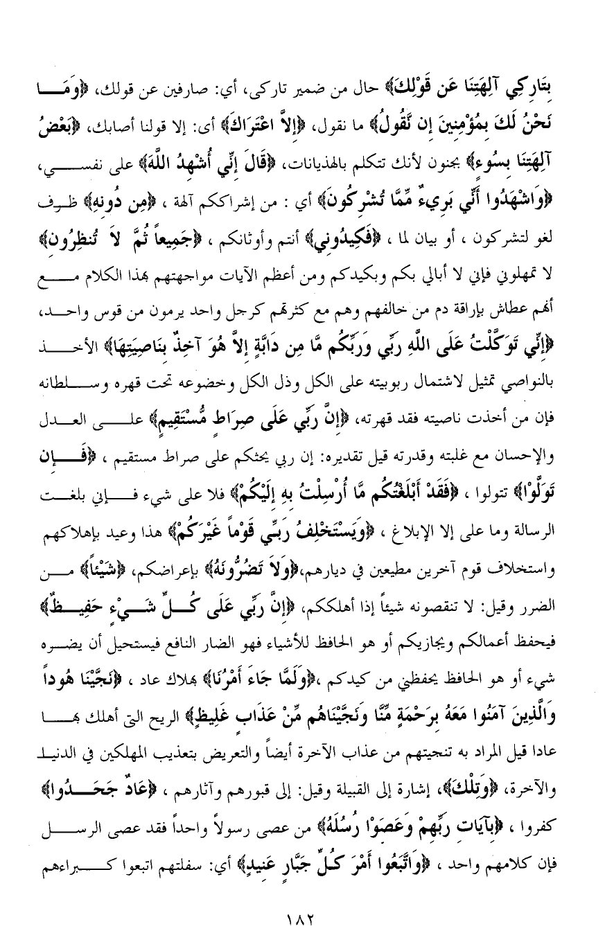 بِتَارِكِي آلِهَتِنَا عَنْ قَوْلِكَ) حال من ضمير تاركي، أي: صارفين عن قولك، (وَمَا ئحْنُ لَكَ بِمُؤْمِنِينَ إِن نقُولُ) ما نقول، (إِلا اعْتَرَاكَ) أي: إلا قولنا أصابك، (بَعْضُ آلِهَتِنَا بِسُوء) بجنون لأنك تتكلم بالهذيانات، (قالَ إِنِّى أُشْهِدُ اللهَ) على نفسي، (وَاشْهَدُوا أَنِّي بَرِيءٌ مِمَّا تُشْرِكُونَ) أي: من إشراككم آلهة، (مِن دُونِهِ) ظرف لغو لـ تشركون، أو بيان لما، (فَكِيدُونِي) أنتم وأوثانكم، (جَمِيعًا ثُمَّ لاَ تُنظِرُونِ) لا تمهلوني فإني لا أبالي بكم وبكيدكم ومن أعظم الآيات مواجهتهم بهذا الكلام مع أنهم عطاش بإراقة دم من خالفهم وهم مع كثرتهم كرجل واحد يرمون من قوس واحد، (إِنِّي تَوَكَّلْتُ عَلَى اللهِ رَبِّي وَرَبِّكُمْ مَا مِنْ دَابَّةٍ إِلَّا هُوَ آخِذٌ بِنَاصِيَتِهَا) الأخذ بالنواصي تمثيل لاشتمال ربوبيته على الكل وذل الكل وخضوعه تحت قهره وسلطانه فإن من أخذت ناصيته فقد قهرته، (إِنَّ رَبِّي عَلَى صِرَاطٍ مُسْتَقِيمٍ) على العدل والإحسان مع غلبته وقدرته قيل تقديره: إن ربي يحثكم على صراط مستقيم، (فَإِن تَوَلوْا) تتولوا، (فَقَدْ أَبْلَغْتُكُمْ مَا أُرْسِلْتُ بِهِ إِلَيْكُمْ) فلا عليَّ شيء فإني بلغت الرسالة وما عليَّ إلا الإبلاغ، (وَيَسْتَخْلِفُ رَبِّي قَوْمًا غَيْرَكُمْ) هذا وعيد بإهلاكهم واستخلاف قوم آخرين مطيعين في ديارهم، (وَلَا تَضُرُّونَهُ) بإعراضكم، (شَيْئًا) من الضرر وقيل: لا تنقصونه شيئًا إذا أهلككم، (إِنَّ ربي عَلَى كُلِّ شَىْء حَفِيظٌ) فيحفظ أعمالكم ويجازيكم أو هو الحافظ للأشياء فهو الضار النافع فيستحيل أن يضره شيء أو هو الحافظ يحفظني من كيدكم، (وَلَمَّا جَاءَ أَمْرُنَا) بهلاك عاد، (نَجَّيْنَا هُودًا وَالَّذِينَ آمَنُوا مَعَهُ بِرَحْمَةٍ مِنَّا وَنَجَّيْنَاهُمْ مِنْ عَذَابٍ غَلِيظٍ) الريح التي أهلك بها عادا قيل المراد به تنجيتهم من عذاب الآخرة أيضًا والتعريض بتعذيب المهلكين في الدنيا والآخرة، (وَتِلْكَ)، إشارة إلى القبيلة وقيل: إلى قبورهم وآثارهم، (عَادٌ جَحَدُوا) كفروا، (بِآيَاتِ رَبِّهِمْ وَعَصَوْا رُسُلَهُ) من عصى رسولاً واحدًا فقد عصى الرسل فإن كلامهم واحد، (وَاتَّبَعُوا أَمْرَ كُلِّ جَبَّارٍ عَنِي) أي: سفلتهم اتبعوا كبراءهم