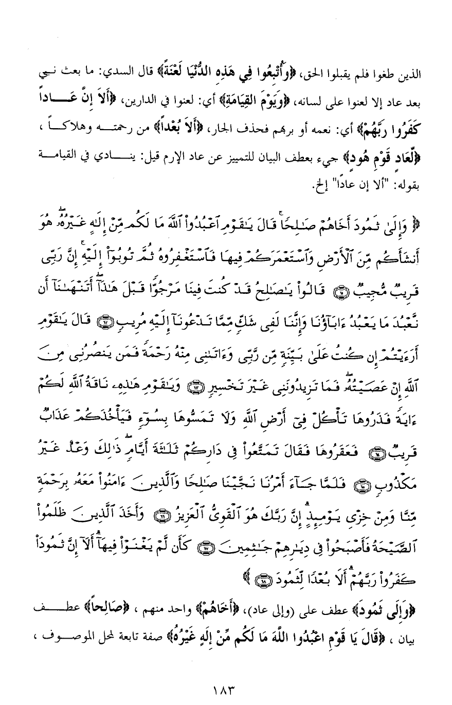 (وَوَإِلَى ثَمُودَ أَخَاهُمْ صَالِحًا قَالَ يَا قَوْمِ اعْبُدُوا اللهَ مَا لَكُمْ مِنْ إِلَهٍ غَيْرُهُ هُوَ أَنْشَأَكُمْ مِنَ الْأَرْضِ وَاسْتَعْمَرَكُمْ فِيهَا فَاسْتَغْفِرُوهُ ثُمَّ تُوبُوا إِلَيْهِ إِنَّ رَبِّي قَرِيبٌ مُجِيبٌ (61) قَالُوا يَا صَالِحُ قَدْ كُنْتَ فِينَا مَرْجُوًّا قَبْلَ هَذَا أَتَنْهَانَا أَنْ نَعْبُدَ مَا يَعْبُدُ آبَاؤُنَا وَإِنَّنَا لَفِي شَكٍّ مِمَّا تَدْعُونَا إِلَيْهِ مُرِيبٍ (62) قَالَ يَا قَوْمِ أَرَأَيْتُمْ إِنْ كُنْتُ عَلَى بَيِّنَةٍ مِنْ رَبِّي وَآتَانِي مِنْهُ رَحْمَةً فَمَنْ يَنْصُرُنِي مِنَ اللهِ إِنْ عَصَيْتُهُ فَمَا تَزِيدُونَنِي غَيْرَ تَخْسِيرٍ (63) وَيَا قَوْمِ هَذِهِ نَاقَةُ اللهِ لَكُمْ آيَةً فَذَرُوهَا تَأْكُلْ فِي أَرْضِ اللهِ وَلَا تَمَسُّوهَا بِسُوءٍ فَيَأْخُذَكُمْ عَذَابٌ قَرِيبٌ (64) فَعَقَرُوهَا فَقَالَ تَمَتَّعُوا فِي دَارِكُمْ ثَلَاثَةَ أَيَّامٍ ذَلِكَ وَعْدٌ غَيْرُ مَكْذُوبٍ (65) فَلَمَّا جَاءَ أَمْرُنَا نَجَّيْنَا صَالِحًا وَالَّذِينَ آمَنُوا مَعَهُ بِرَحْمَةٍ مِنَّا وَمِنْ خِزْيِ يَوْمِئِذٍ إِنَّ رَبَّكَ هُوَ الْقَوِيُّ الْعَزِيزُ (66) وَأَخَذَ الَّذِينَ ظَلَمُوا الصَّيْحَةُ فَأَصْبَحُوا فِي دِيَارِهِمْ جَاثِمِينَ (67) كَأَنْ لَمْ يَغْنَوْا فِيهَا أَلَا إِنَّ ثَمُودَ كَفَرُوا رَبَّهُمْ أَلَا بُعْدًا لِثَمُودَ (68)